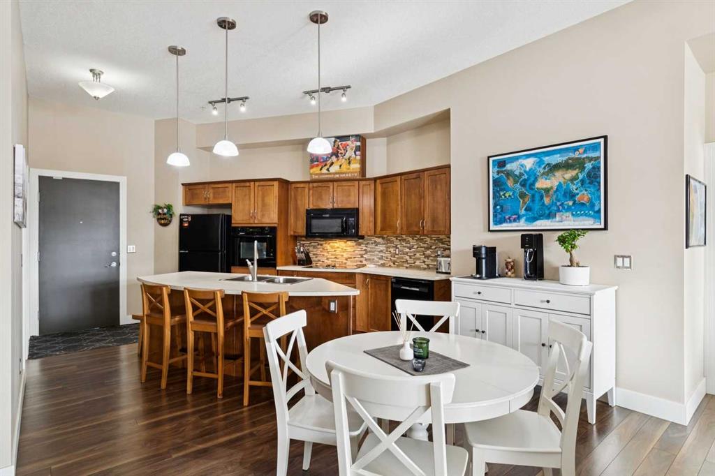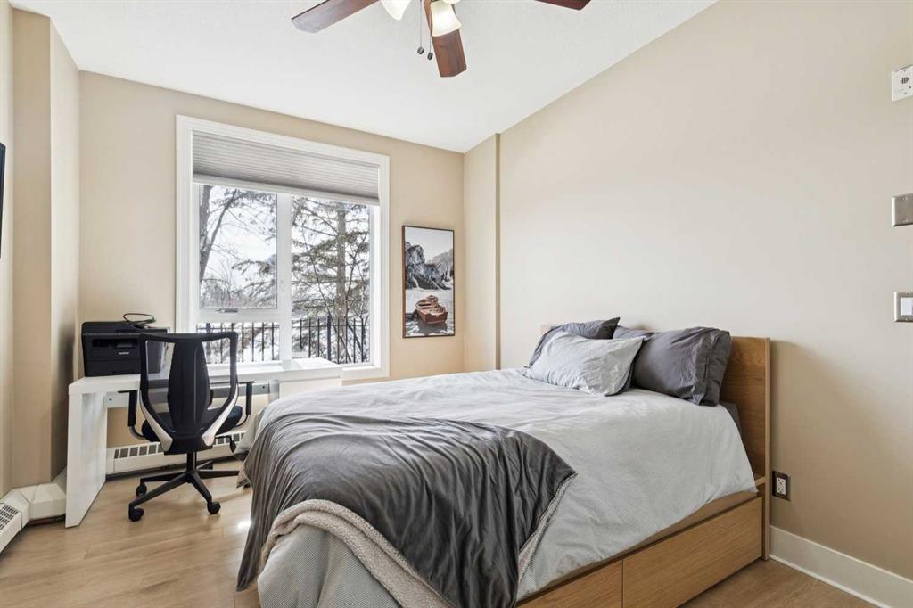 Discover your next home or investment in this exceptional, fully furnished Varsity condo, now ready for immediate occupancy. Located just a short walk from the University of Calgary, University District, Brentwood shopping, and various transit options, this property offers unparalleled convenience. This is a pet friendly building but fully grown-up, pet cannot exceed 15 kg or 33 lbs. You can have up to 2 cats, 2 dogs or 2 birds. The interior features over $35,000 in premium upgrades, characterized by high ceilings and expansive windows that fill the open layout with natural light. Durable laminate flooring flows through the main living spaces and bedrooms, while the two ensuite bathrooms are finished with practical ceramic tile. The kitchen is a central highlight, equipped with medium-toned maple cabinetry, black appliances, and a curved island with seating for three. Nearby, a dedicated computer area with ample built-in storage provides an organized space for remote work or studying. Living and entertaining are made easy with a living room that opens onto a private patio, where mature trees provide a natural screen for outdoor relaxation. The layout is perfectly suited for roommates or guests, featuring two primary bedrooms each with their own ensuite. One bedroom includes a ceiling fan and walk-in closet, while the other offers a walk-through closet leading to a 4-piece bath that connects directly to the laundry room. Additional benefits include a titled underground parking stall in a heated parkade and a titled storage cage for the winter months. This condo is a perfect opportunity for first-time buyers, University of Calgary faculty and students, or medical professionals working at the Foothills or Children's Hospitals. Schedule your showing today!