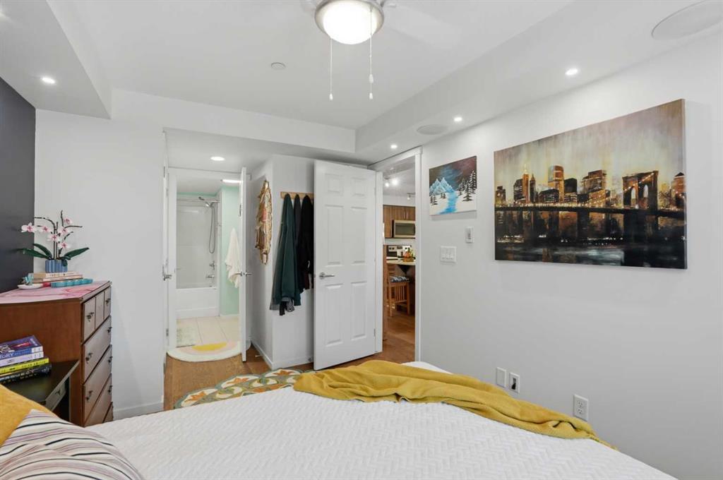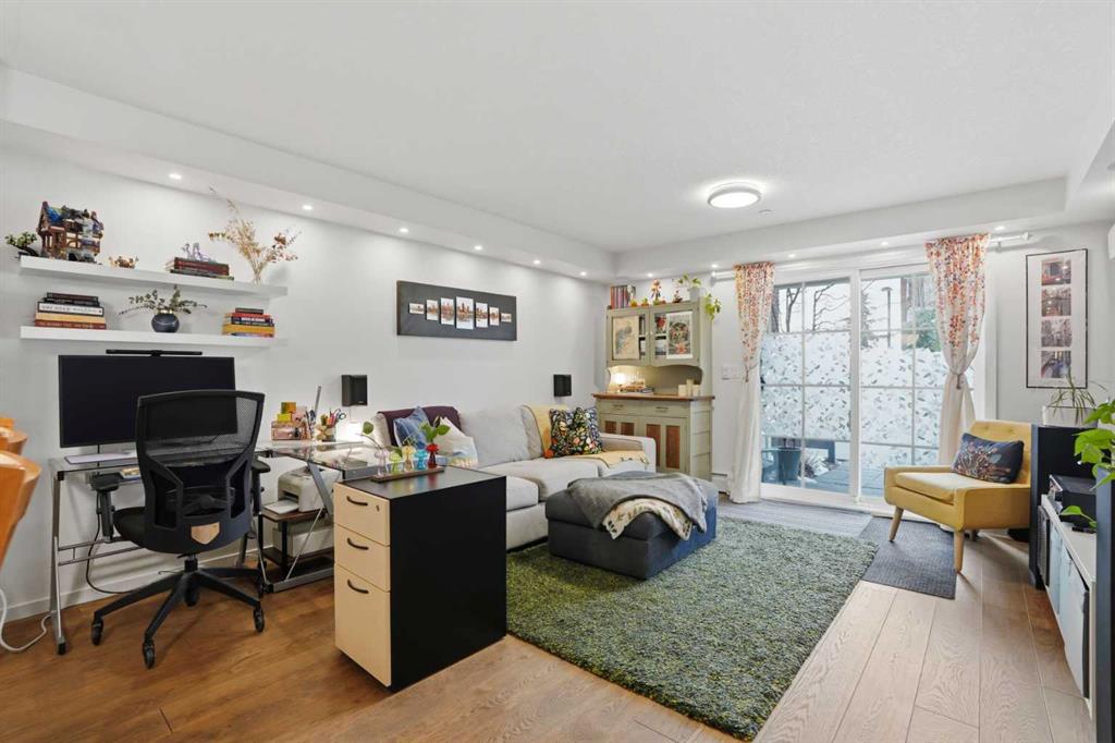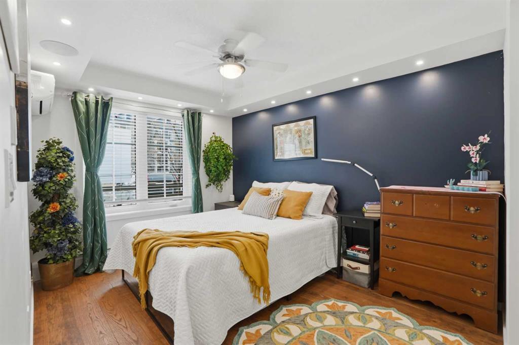 Welcome to this beautifully upgraded former show suite, where thoughtful design meets everyday comfort. This 1-bedroom, 1-bathroom home offers a warm and inviting vibe from the moment you walk in - truly feeling like a big, cozy embrace. Situated on the main floor, this unit provides convenient, private access without the need to pass through the building, making it ideal for ease of living. Just steps from your patio, you’ll find your above-ground parking stall, and underground, additional secure storage. Inside, the home is rich with upgrades throughout. The gorgeous kitchen features a stunning stone island, warm-toned shaker-style cabinetry, and stainless appliances, while the engineered wide-plank hardwood flooring flows seamlessly through the space. In-ceiling speakers and upgraded recessed lighting create an elevated ambiance, perfect for both relaxing and entertaining, while the mini-split A/C in the living room & bedroom keeps you calm, cool & collected. The thoughtful layout includes in-suite laundry and substantial in-suite storage, ensuring functionality matches the home’s beauty. This pet-friendly building (with board approval - please refer to bylaws) is designed with your furry companions in mind, offering dedicated pet areas while also being in close proximity to a nearby nature reserve with scenic walking paths. Reasonable condo fees just add to this units appeal. Located in the young, vibrant community of Copperfield, you’ll enjoy easy access to amenities, shopping, and major transportation routes - bringing convenience right to your doorstep. This home offers a perfect blend of style, comfort, and practicality - making it a smart move.