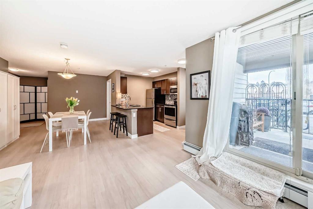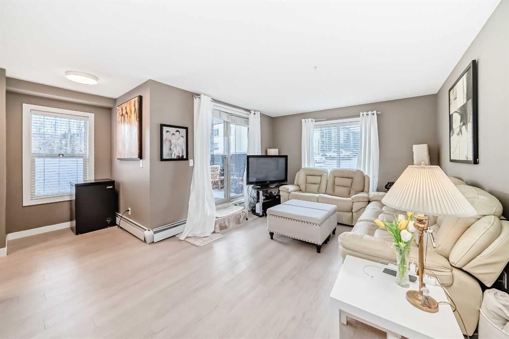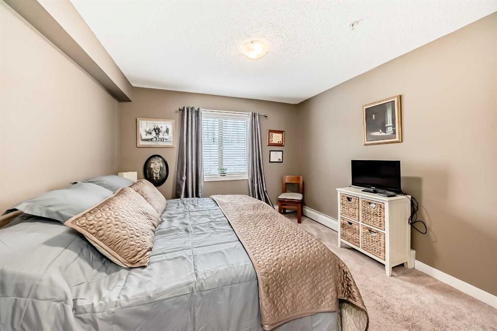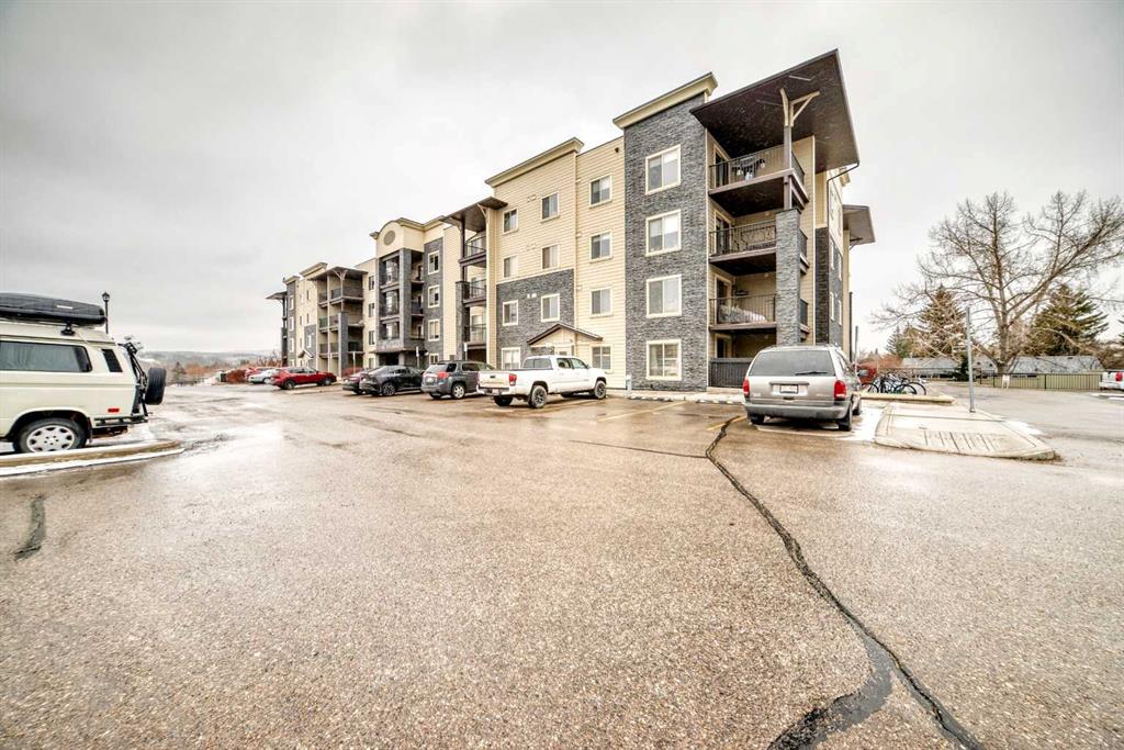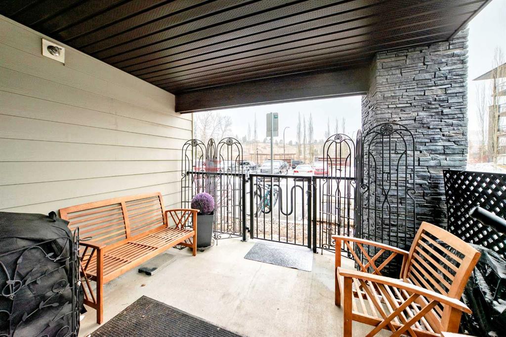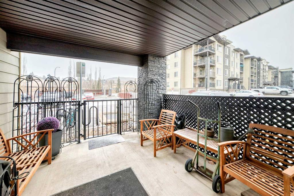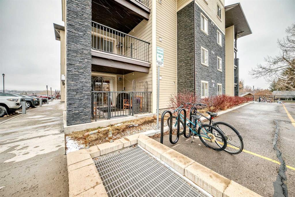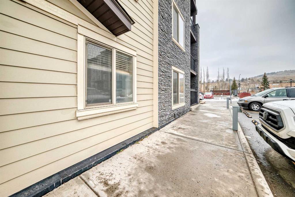 Welcome to this beautifully maintained corner ground floor apartment in the heart of Glenbow, Cochrane, offering a functional layout and exceptional convenience. This bright and inviting home features 2 bedrooms and 2 bathrooms, perfect for first time buyers, downsizers, or investors. The well appointed kitchen showcases stainless steel appliances including a new Bosch dishwasher, granite countertops, tile backsplash, ample cabinetry, and a convenient breakfast bar. New lighting throughout the home enhances the modern feel, while the spacious primary bedroom offers a walk through closet leading to a private 3 piece ensuite complete with granite countertops. A second bedroom and a full 4 piece bathroom provide flexibility for guests, family, or a home office. Both bathrooms have been updated with new shower heads. An in suite laundry room with additional storage adds everyday practicality, while the welcoming front entry features a full size coat closet. Ground floor access makes this home especially appealing for those seeking a no stairs lifestyle. This unit includes one titled underground parking stall (#291) and one assigned surface stall (#139). Ideally located just steps from Cochrane’s restaurants, coffee shops, grocery stores, parks and walking paths.