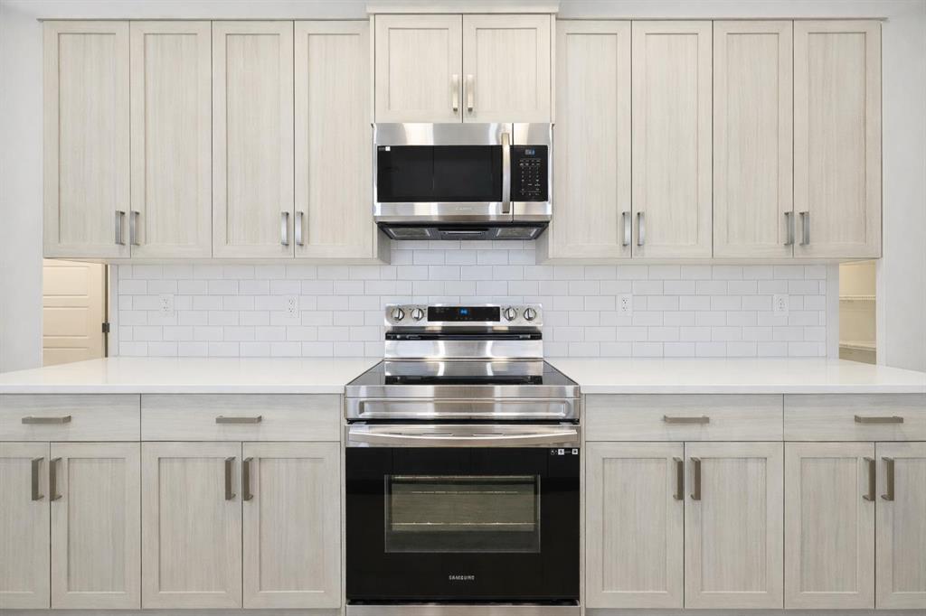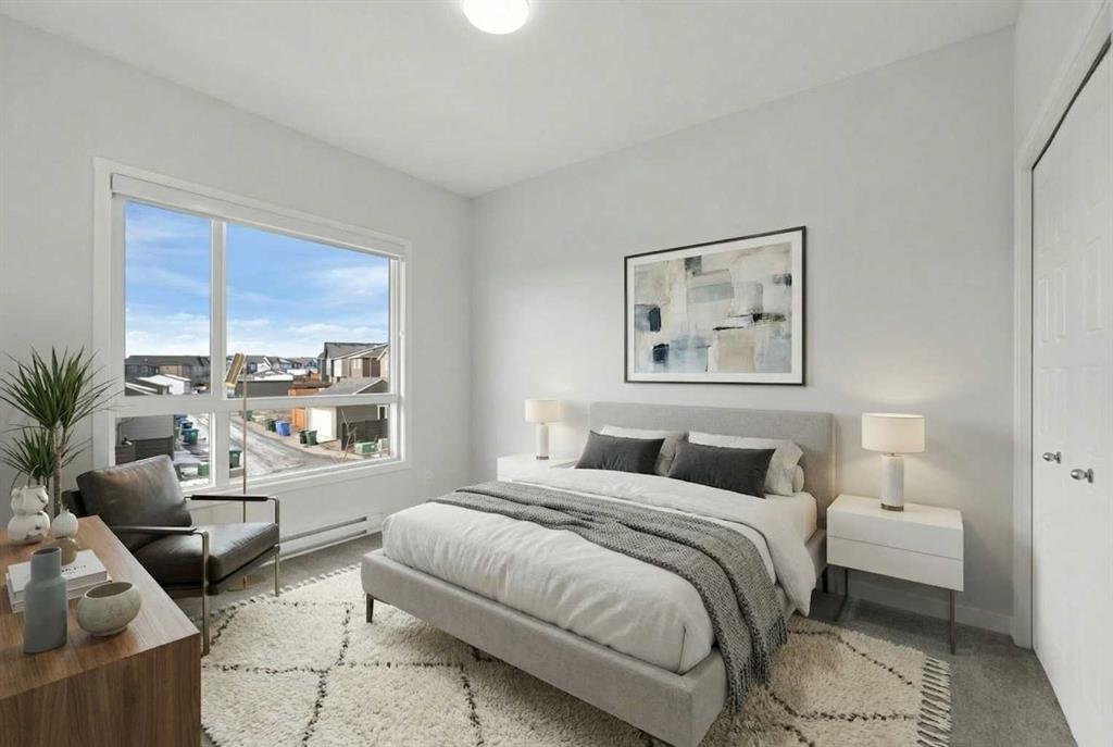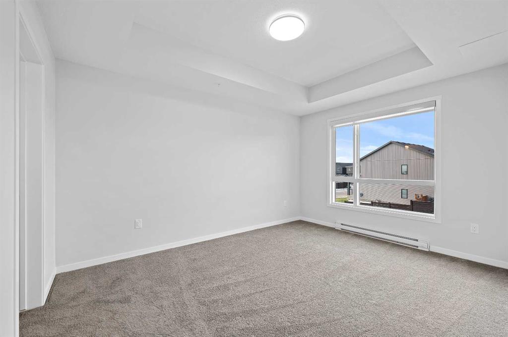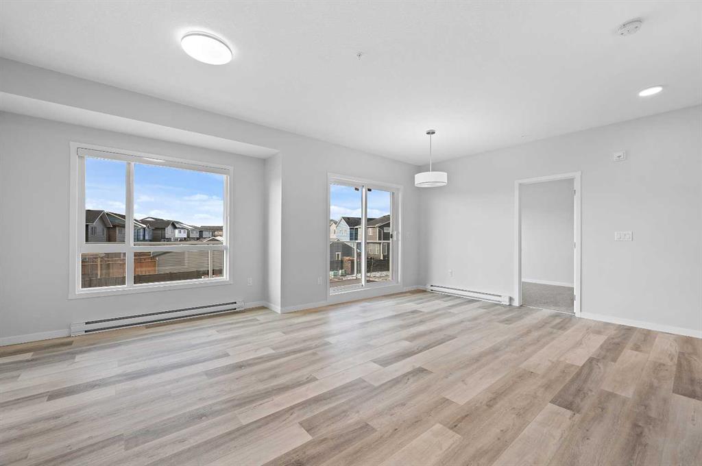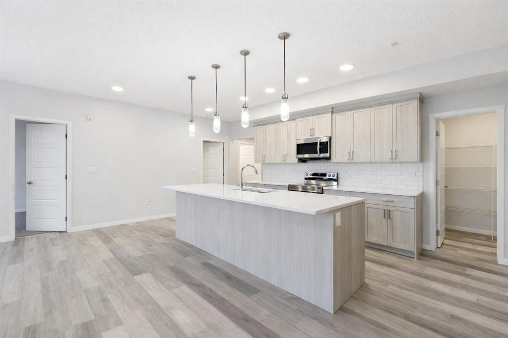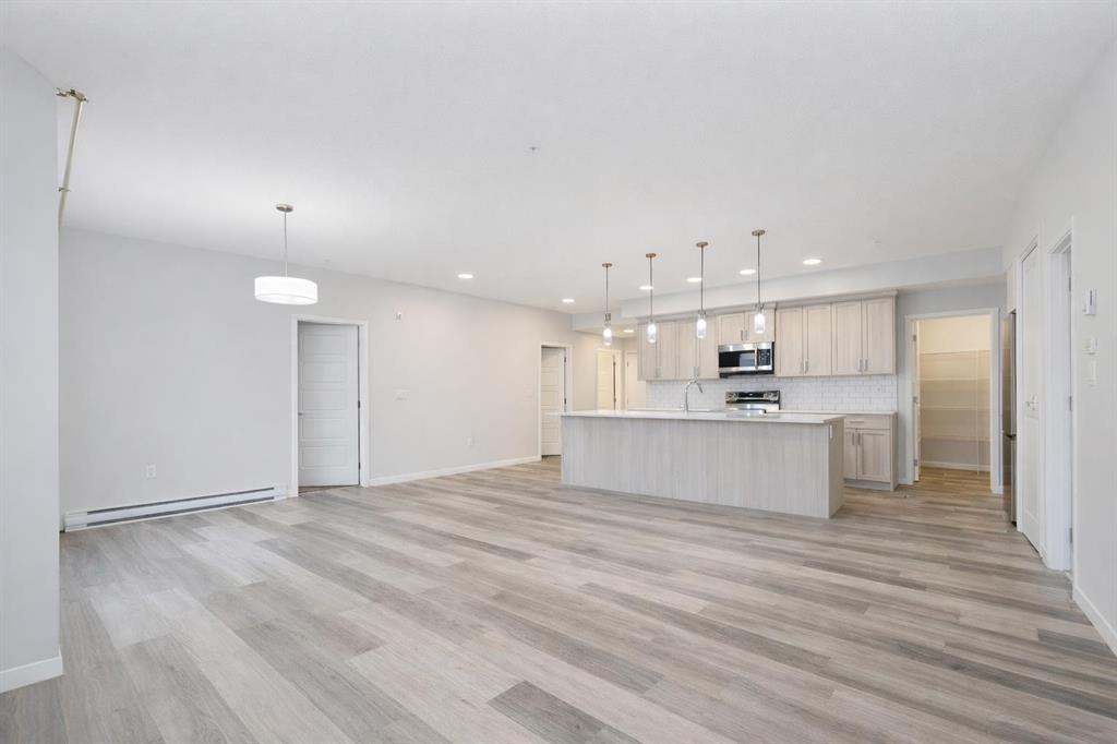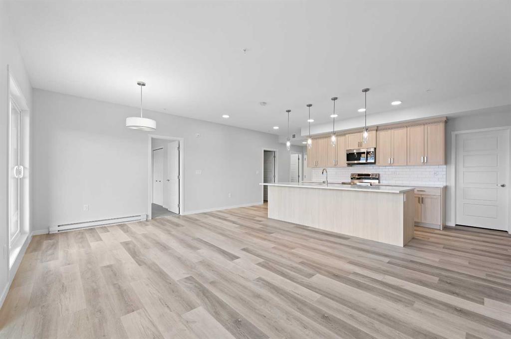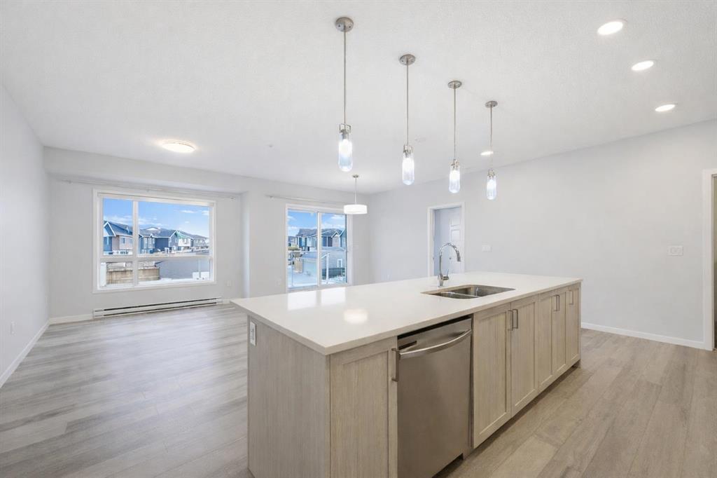 3 BEDROOMS | 2 BATHROOMS | 1,185 SQ.FT. | HEATED UNDERGROUND PARKING | UPGRADED FINISHES Welcome to this beautifully upgraded condo in Seton, offering 1,185 sq. ft. of thoughtfully designed living space. This rare 3-bedroom layout provides exceptional flexibility for families, guests, or a home office. Step inside to soaring 9' ceilings and large windows that fill the home with natural light. The open-concept layout is enhanced by upgraded vinyl plank flooring and modern designer lighting throughout. The kitchen is both stylish and functional, featuring stainless steel appliances, quartz countertops, a full-height backsplash, and a large island with seating—perfect for everyday living and entertaining. A walk-in pantry adds valuable storage space. The spacious primary bedroom includes a walk-in closet and private ensuite with dual vanities, while two additional bedrooms are well-sized and share a full bathroom. A separate laundry room with a full-size washer and dryer adds everyday convenience. Enjoy your large SW-facing balcony complete with a BBQ gas line and plenty of space to relax or entertain. This unit also includes titled heated underground parking and access to secure bike storage. Located in the heart of Seton, you’re just minutes from South Health Campus, the YMCA, Superstore, restaurants, shops, and everyday amenities, with quick access to Deerfoot Trail and Stoney Trail for an easy commute. A rare opportunity to own a spacious 3-bedroom unit in one of Calgary’s most convenient and vibrant communities.