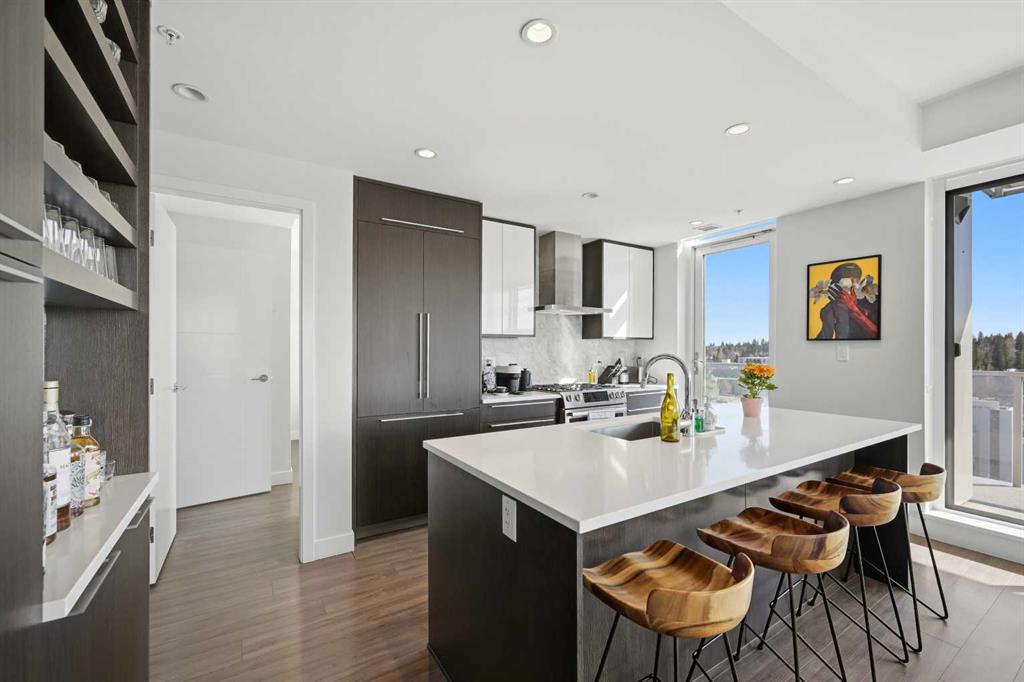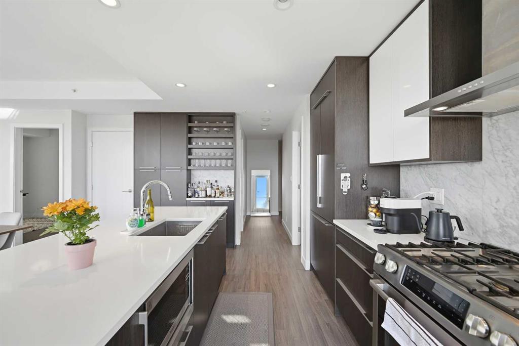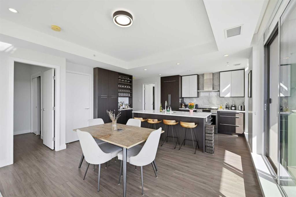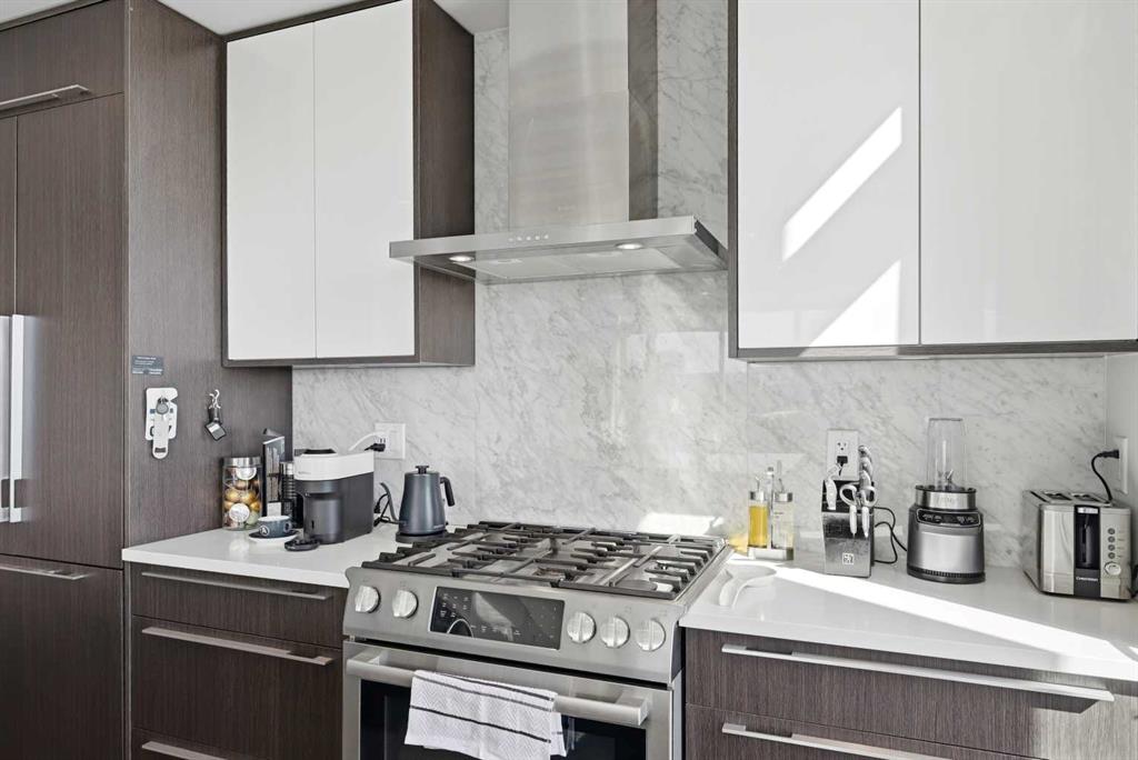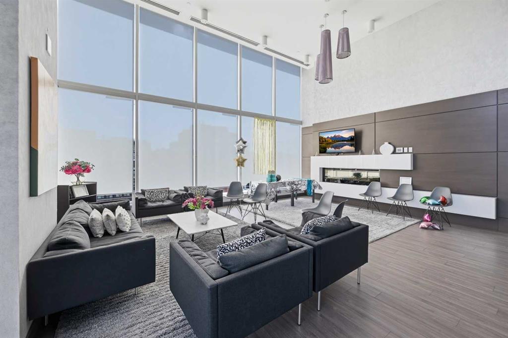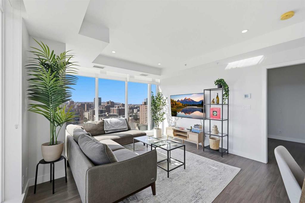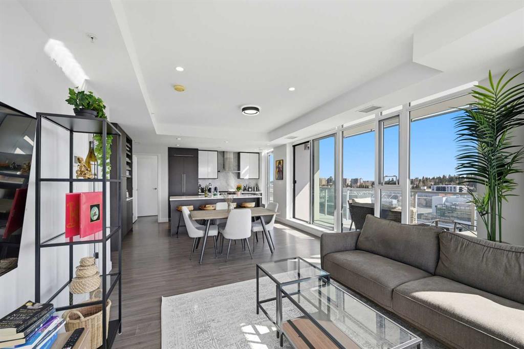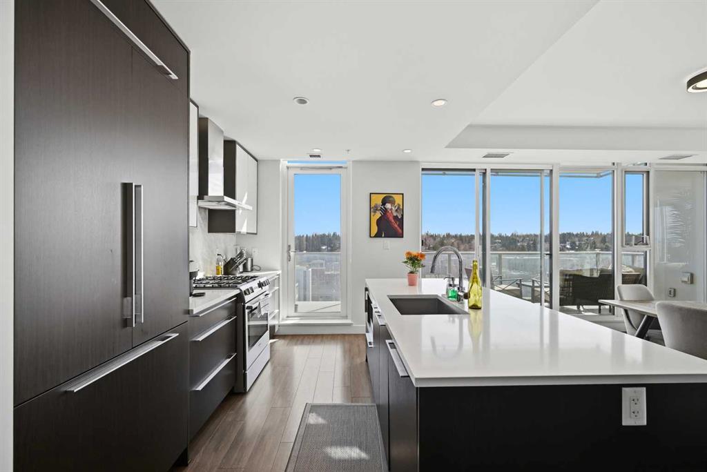 Welcome to The Royal! This stunning 2-bedroom, 2-bathroom southwest corner suite is filled with beautiful afternoon and evening sunshine. The well-designed floor plan and wall-to-wall, floor-to-ceiling windows create a bright, spacious feel throughout. The home features new wide vinyl plank flooring and modern flat ceilings, along with a stylish and functional kitchen complete with quartz countertops, a large central island with breakfast bar, premium appliances including a gas range, integrated fridge and dishwasher, plus a pantry and coffee station. Step outside to the massive double-sized balcony featuring lighting, electrical outlets, and gas BBQ hookups at both ends, perfect for relaxing or entertaining. The spacious primary bedroom includes a walk-in closet and a beautiful ensuite with a large glass shower and double vanity. A second bedroom and full bathroom offer flexibility for guests, a home office, or shared living, while in-suite laundry adds everyday convenience. Residents enjoy outstanding amenities including a fitness center, steam room, sauna, squash court, 24-hour concierge and security, outdoor courtyard, social lounge with TV and billiards, and a spacious rooftop patio with BBQ areas. The building is pet-friendly (with approval) and surrounded by nearby parks and green spaces. This exceptional unit also includes secure heated underground parking, a storage locker, and bike storage, a beautifully maintained urban home in a prime location.