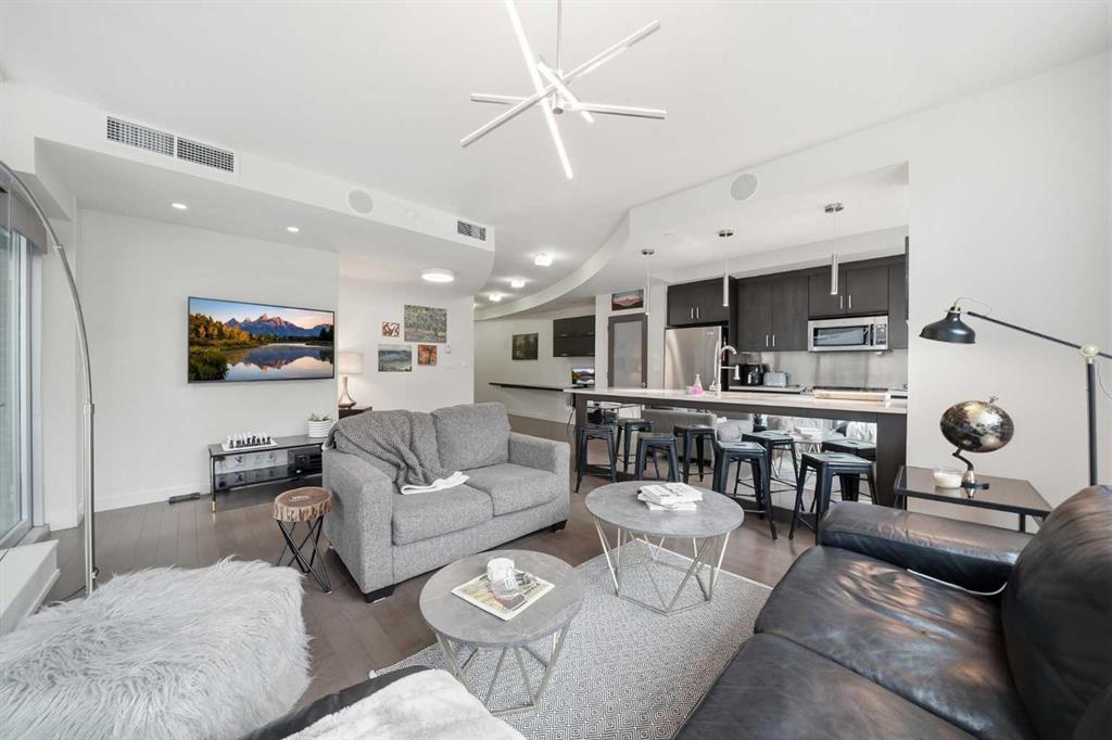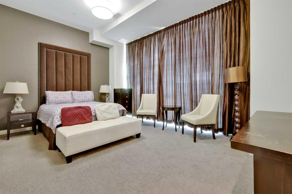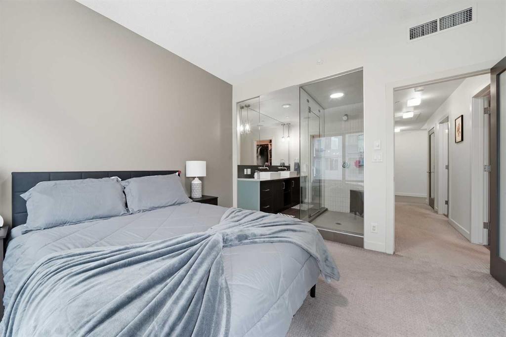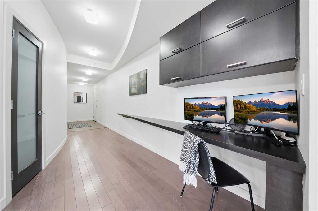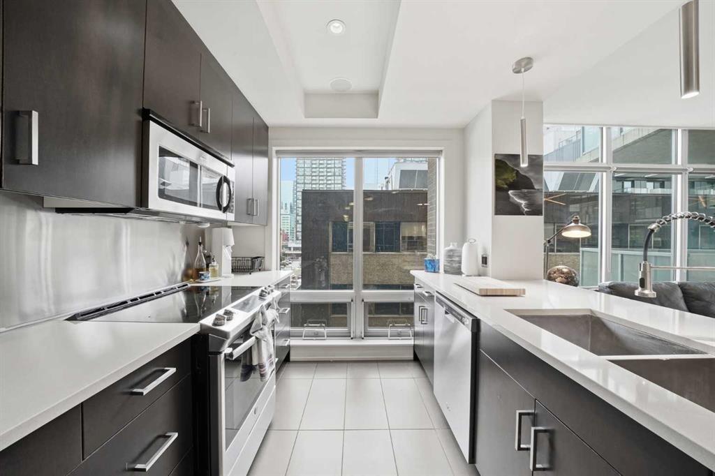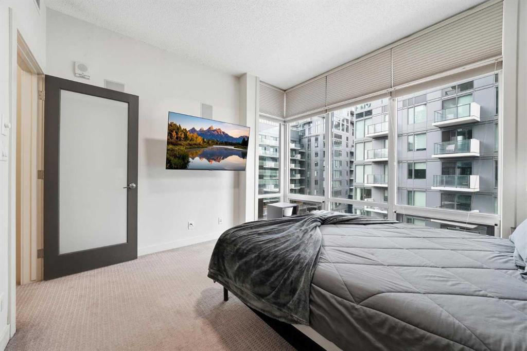 Welcome to Castello, where luxury meets lifestyle in the heart of downtown. This bright and modern 2-bedroom, 2-bathroom corner unit on the 5th floor offers the perfect blend of style, space, and unbeatable urban convenience. Ideally located just steps from restaurants, shops, and medical services, this home is perfect for those who enjoy a vibrant city lifestyle. The sleek, contemporary kitchen features quartz countertops, modern cabinetry, a striking metal backsplash, and newer oven and bar fridge—perfect for both everyday living and entertaining. The sun-filled living area showcases hardwood flooring, new light fixtures throughout, and built-in ceiling speakers, creating the perfect atmosphere for relaxing or hosting guests. Step outside to your oversized 300+ sq. ft. balcony with natural gas line—an incredible extension of your living space, ideal for summer BBQs, morning coffee, or evening gatherings. The spacious primary bedroom offers a private ensuite and walk-in closet with California Closet organizers, while the second bedroom also features a California Closet system, providing exceptional storage and organization. Additional highlights include in-unit laundry, a dedicated storage room, an oversized underground parking stall conveniently located next to the elevator, a car wash station, and a titled underground storage unit. Residents of Castello enjoy exceptional building amenities including a fully equipped fitness centre, guest suite, meeting room, and concierge service, all within an elegant and welcoming lobby. Located just 2 blocks from the Plus 15 network and only a 5-minute drive to vibrant 17th Avenue, this home is ideal for professionals and downtown enthusiasts.