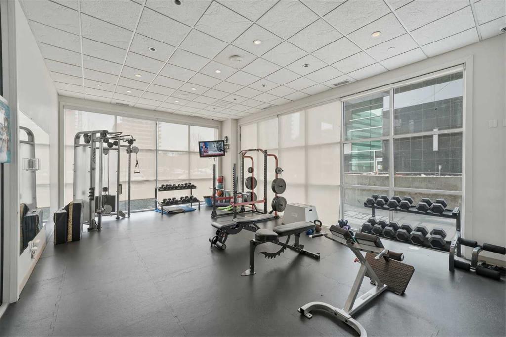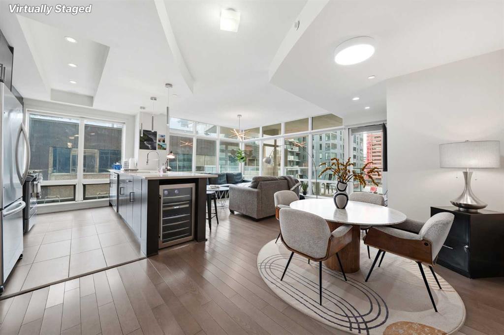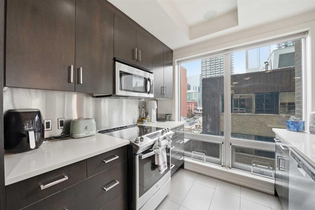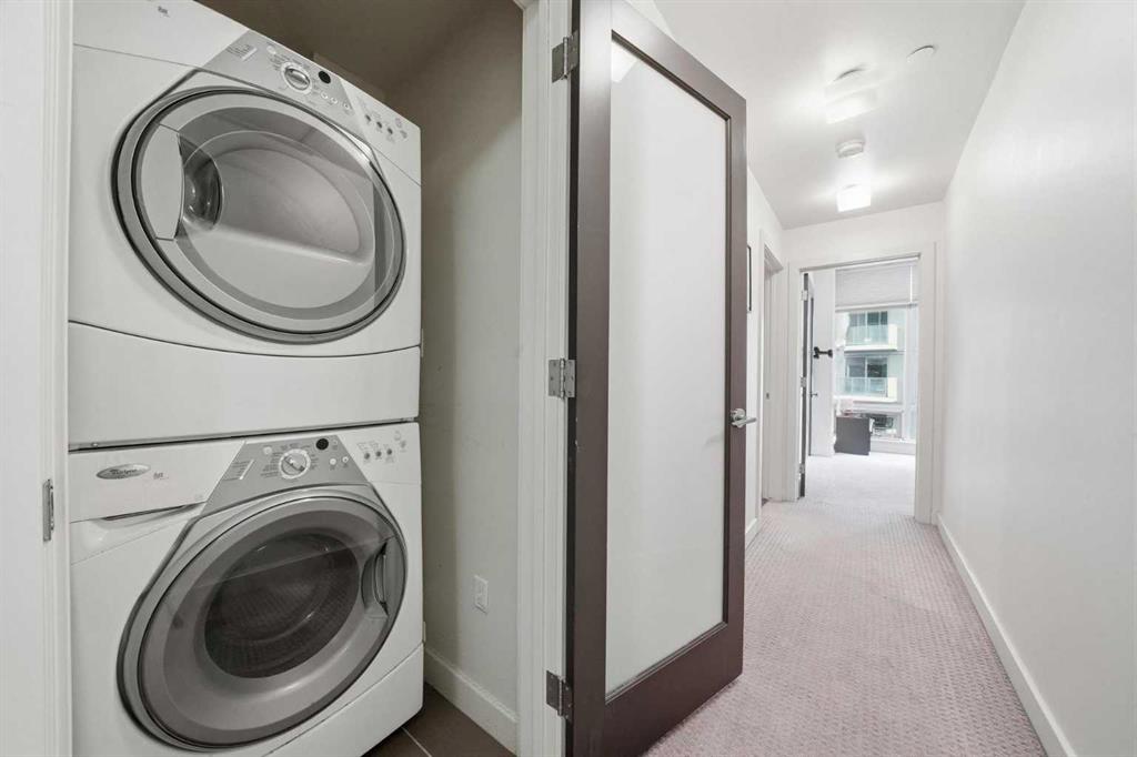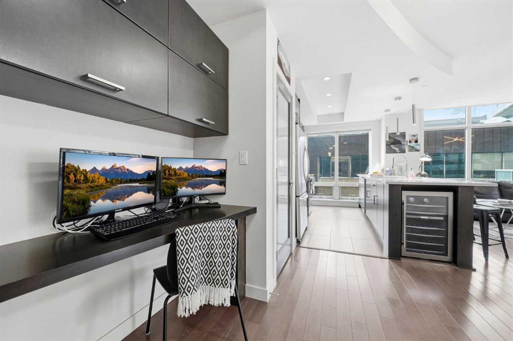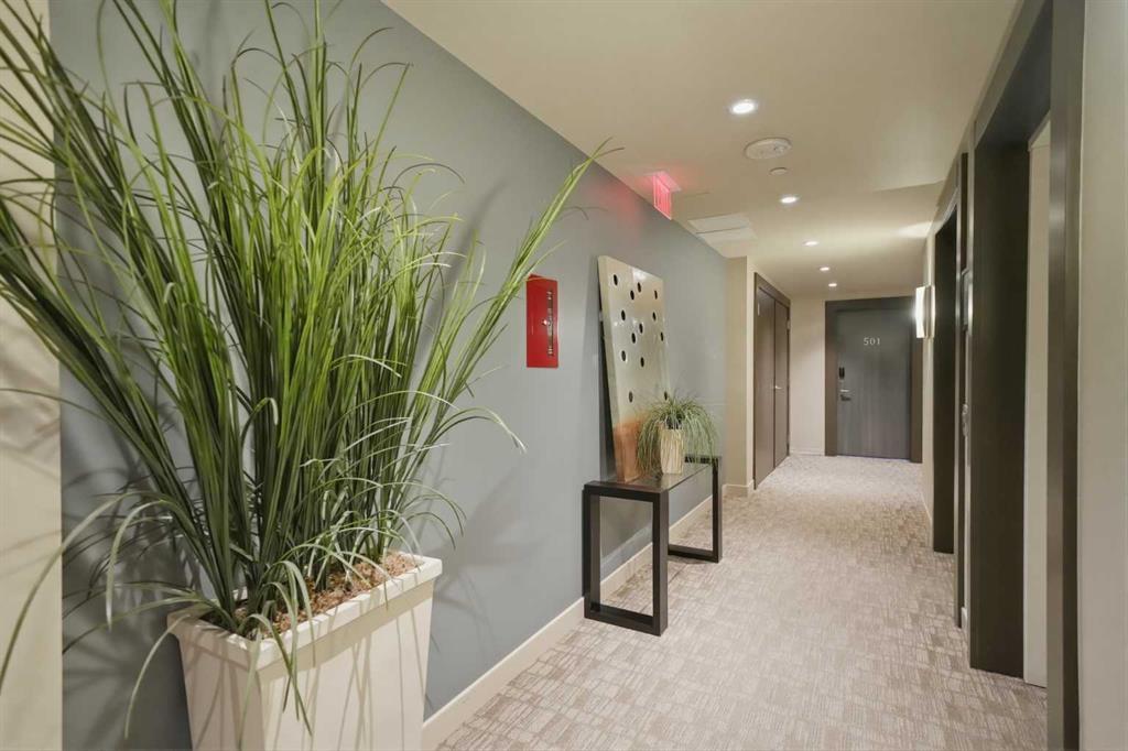 Welcome to Castello, where luxury meets lifestyle in the heart of downtown. This bright and modern 2-bedroom, 2-bathroom corner unit on the 5th floor offers the perfect blend of style, space, and unbeatable urban convenience. Ideally located just steps from restaurants, shops, and medical services, this home is perfect for those who enjoy a vibrant city lifestyle. The sleek, contemporary kitchen features quartz countertops, modern cabinetry, a striking metal backsplash, and newer oven and bar fridge—perfect for both everyday living and entertaining. The sun-filled living area showcases hardwood flooring, new light fixtures throughout, and built-in ceiling speakers, creating the perfect atmosphere for relaxing or hosting guests. Step outside to your oversized 300+ sq. ft. balcony with natural gas line—an incredible extension of your living space, ideal for summer BBQs, morning coffee, or evening gatherings. The spacious primary bedroom offers a private ensuite and walk-in closet with California Closet organizers, while the second bedroom also features a California Closet system, providing exceptional storage and organization. Additional highlights include in-unit laundry, a dedicated storage room, an oversized underground parking stall conveniently located next to the elevator, a car wash station, and a titled underground storage unit. Residents of Castello enjoy exceptional building amenities including a fully equipped fitness centre, guest suite, meeting room, and concierge service, all within an elegant and welcoming lobby. Located just 2 blocks from the Plus 15 network and only a 5-minute drive to vibrant 17th Avenue, this home is ideal for professionals and downtown enthusiasts.