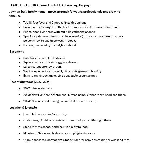 Ready for your next-level family home in one of Calgary’s top lake communities? This sharp JAYMAN-BUILT move-up at 18 Autumn Circle SE in Auburn Bay is exactly what young professionals and growing families are looking for when they’re ready to upgrade. Walk through the tall 18-foot foyer into a bright, open main floor with 9-FOOT CEILINGS. Right off the entrance you get a PRIVATE OFFICE/DEN, perfect for work-from-home days or a quiet zoom corner, or maybe a flex bedroom for your guests. The layout flows straight into a spacious kitchen with a big island, tons of cabinetry and a walk-in pantry, then opens to the dining area and living room with a cozy fireplace. Upstairs, the primary suite feels like a private retreat: 5-PIECE ENSUITE with double vanity, soaker tub, two-person shower and a huge walk-in closet. Two more bright bedrooms, a 4-piece bathroom, a built-in desk nook and a BALCONY overlooking the neighbourhood give everyone their own space. Downstairs the FULLY FINISHED BASEMENT offers 4th bedroom, 3-piece bathroom with glass shower, massive rec/movie room and wet bar. Movie nights, sports games, or hosting friends just got way better. This home has been quietly UPGRADED for peace of mind: NEW WATER TANK (2022), NEW LVP FLOORING, FRESH PAINT, KITCHEN RANGE HOOD AND FRIDGE (2023), PLUS BRAND-NEW AIR CONDITIONING AND A FULL FURNACE TUNE-UP (2024). Step outside to the SOUTH-FACING BACKYARD that gets full sun all day, ideal for summer BBQs, gardening or just relaxing. The street is quiet with loads of parking, and you’re steps from three schools and multiple playgrounds. Auburn Bay delivers the lifestyle upgrade you want: direct lake access, clubhouse, pickleball courts and everyday convenience. You’re also minutes from Seton and Mahogany plus quick access to Deerfoot and Stoney Trails for an easy commute or weekend adventures. This is the one you’ve been waiting for! Call your favourite Realtor today!