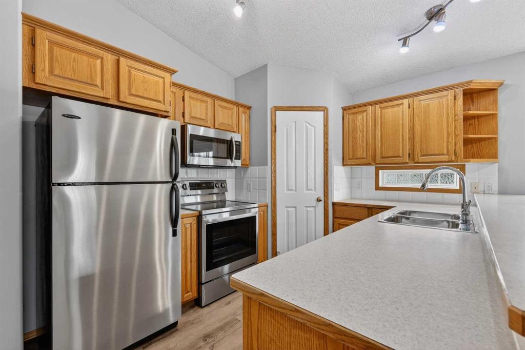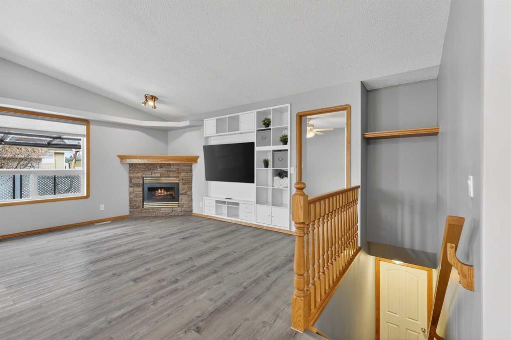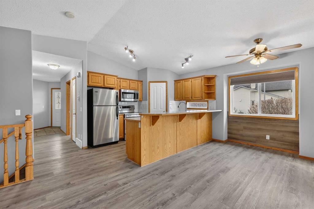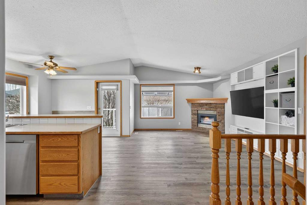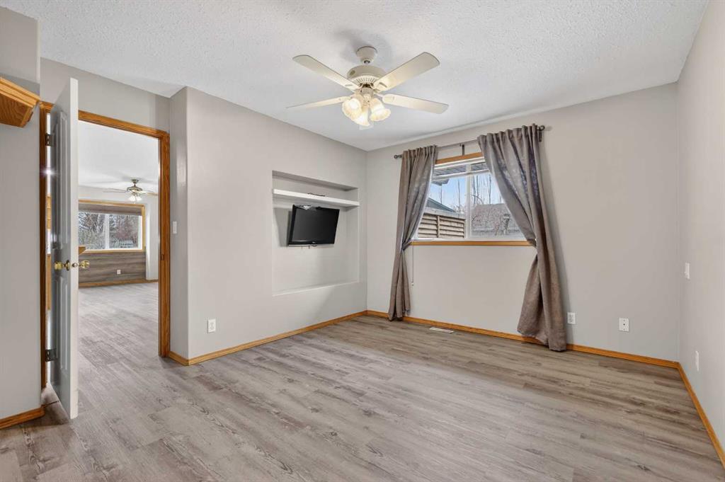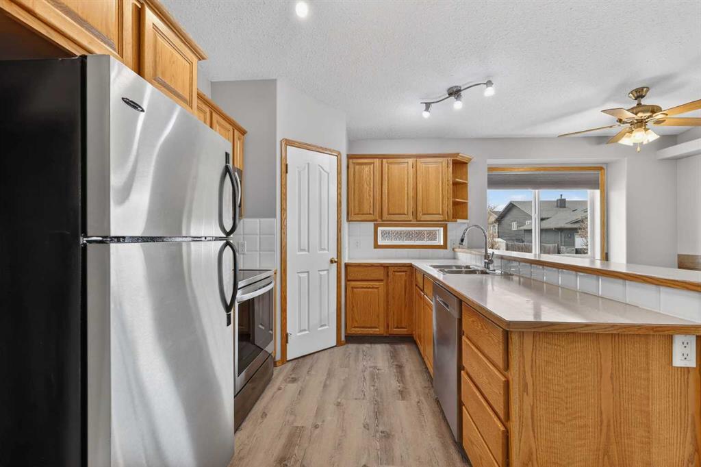 Welcome to Cambridge Glen—one of Strathmore’s most sought-after communities. Surrounded by scenic parks and winding pathways, this beautifully maintained bungalow offers the perfect blend of comfort, accessibility, and thoughtful design. Situated on a desirable corner lot, this home features exceptional parking, including potential RV parking for the avid camper, and a double attached heated garage complete with a ramp for added accessibility. The low-maintenance, scape-free front yard provides effortless curb appeal, while the private, treed backyard creates a peaceful retreat. Enjoy outdoor living on the spacious back deck, which features a gazebo and a convenient gas BBQ hookup, plus two storage sheds. Step inside to a bright, welcoming foyer that leads to a versatile front room—ideal as a bedroom or home office—along with a full bathroom and an additional bedroom. The home opens into a beautiful open-concept kitchen, dining, and living area, perfect for both everyday living and entertaining. A corner mantle fireplace adds warmth and charm, while built-in cabinetry offers an elegant space to showcase your personal touches. The primary suite overlooks the tranquil backyard and features built-in storage and an accessible ensuite, thoughtfully designed for comfort and ease of use. There is also a main floor laundry hookup option, providing flexibility to suit your needs. Downstairs, the partially finished basement expands your living space with a large bedroom complete with its own ensuite and walk-in shower, a dedicated laundry area, and plenty of room to customize additional living space to your liking. This home has seen numerous thoughtful updates, including central air conditioning installed in 2023, a new hot water tank (2022), and updated shingles (approx. 2022). You’ll also appreciate the new vinyl plank flooring throughout the main level (2025), all new window coverings, updated toilets throughout, and the comfort of ceiling fans. Additional highlights include stainless steel kitchen appliances, as well as a washer and dryer—both included, making this home truly move-in ready.