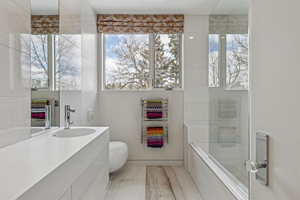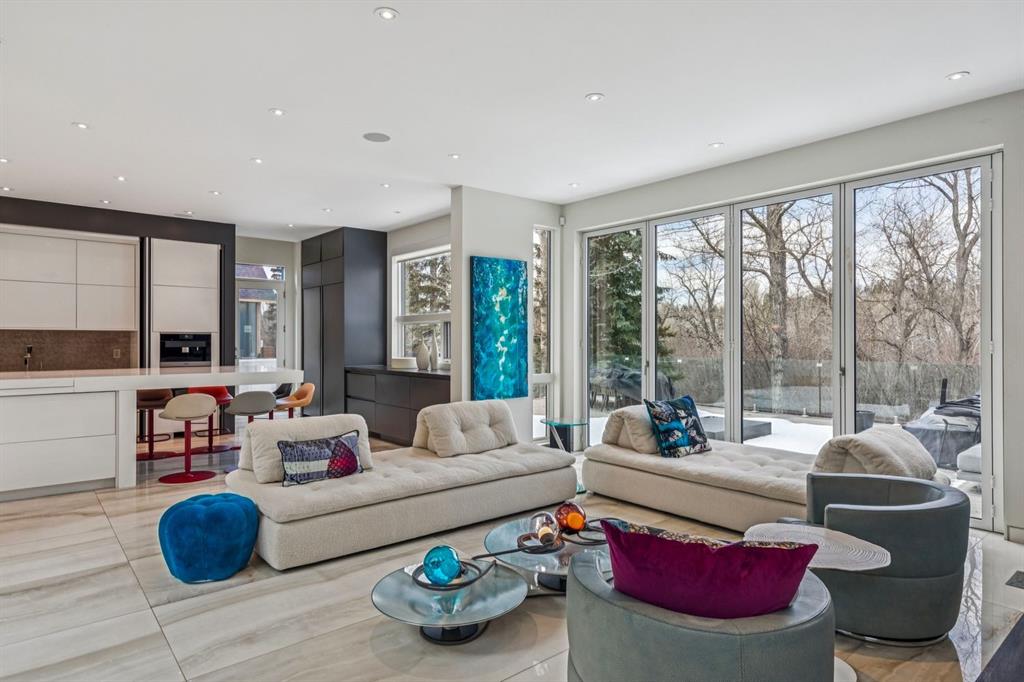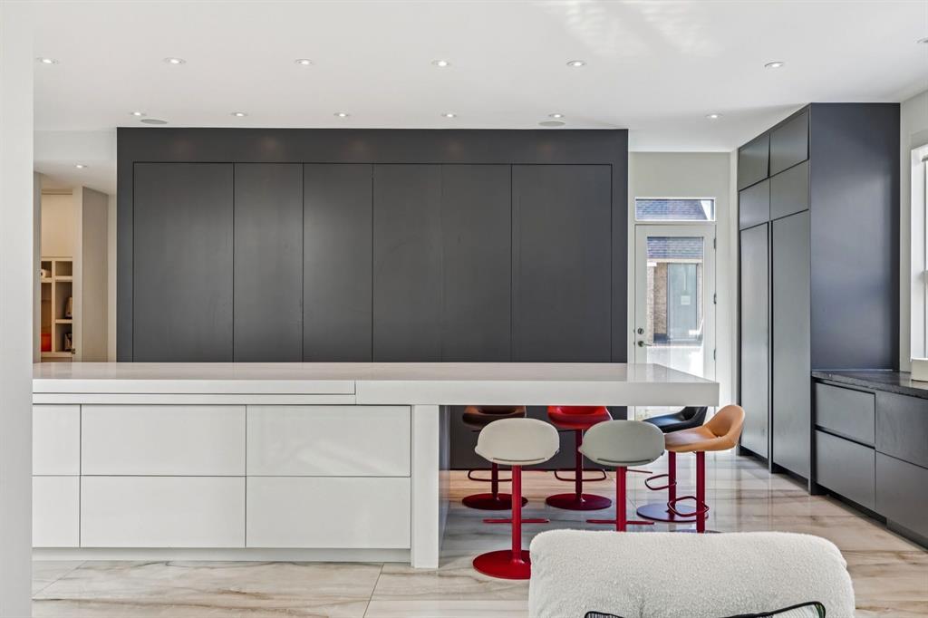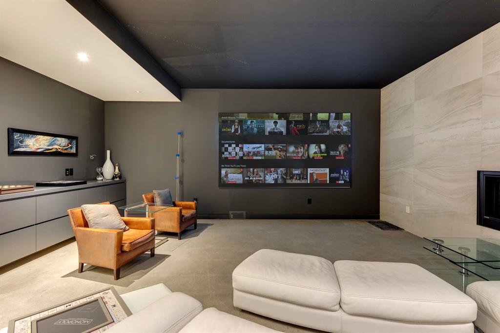 Experience unparalleled modern luxury on one of Elbow Park’s most coveted stretches of Rideau Road. This architecturally striking residence blends cutting edge design with a serene, nature inspired setting, backing onto the Elbow River and separated by a treed island creating a private oasis that feels worlds away from the city. A stunning facade of stucco and marble, paired with sleek glass railings, sets the tone for the refined elegance within. Inside, soaring ceilings and expansive windows flood the home with natural light, while marble tile flows seamlessly throughout the main and upper levels. The grand foyer offers a breathtaking introduction, framing views of the home’s central courtyard retreat. Designed with entertaining in mind, the open concept dining space connects effortlessly to a show stopping kitchen. A custom movable island reveals an integrated cooktop and prep sink, while premium appliances, including built-in oven, microwave, coffee station, Subzero panelled refrigerator, and beverage drawers ensure both function and style. Sleek cabinetry can be closed off entirely for a clean, minimalist aesthetic, complemented by a fully equipped butler’s pantry. The living room is a masterpiece of indoor/outdoor flow, with patio doors opening to an expansive rear deck. A sophisticated gas fireplace with concealed television anchors the space, while a raised platform adds versatility for lounging or entertaining. A custom wine cellar provides the perfect showcase for your collection. Guests will love the main floor bedroom complete with walk-in closet and private ensuite. At the heart of the home lies a spectacular private courtyard. Nano doors on both sides create seamless integration, while an infinity hot tub and statement lighting evoke a true spa-like retreat. Upstairs, a thoughtfully designed laundry room features double washers and dryers, ample storage, and utility sink. Five spacious bedrooms include a remarkable primary retreat, complete with a boutique style dressing room and tranquil sleeping quarters wrapped in windows. The luxurious ensuite offers a steam shower, sculptural concrete soaker tub, dual vanities, and dedicated vanity station. The third level elevates the lifestyle further with a loft lounge, wet bar, wine room, home gym, and a rooftop patio showcasing breathtaking downtown skyline views and an outdoor fireplace. The fully developed lower level features in-floor heated concrete floors, a theatre room with custom LED ceiling and projector, and a large mudroom leading to an extraordinary six car heated garage with a heated driveway. Smart home integration via Control4, carbon fibre fixtures, and extensive built-ins highlight modern innovation. Outdoors, multiple patios with glass railings provide ideal entertaining spaces, while a tranquil lower patio offers peaceful riverfront relaxation where you can hear birds sing while ducks float by. This exceptional residence delivers a rare blend of luxury, design, and natural beauty.