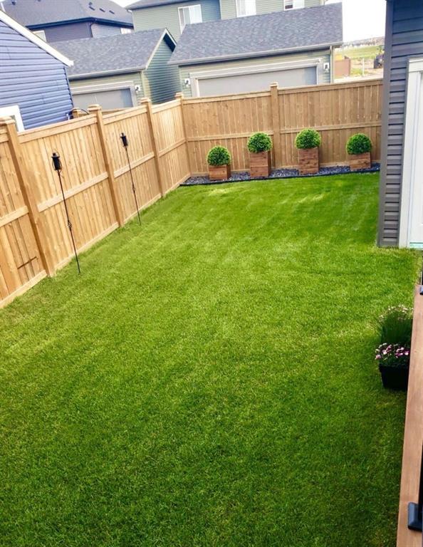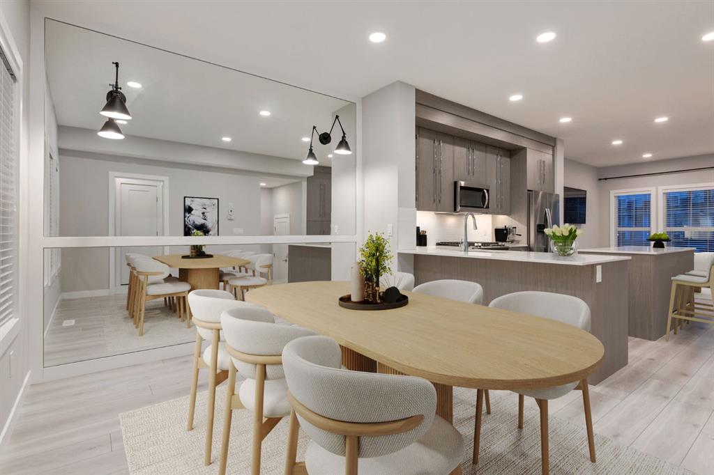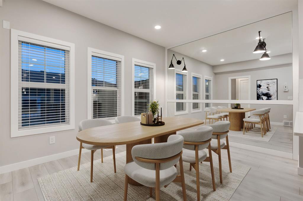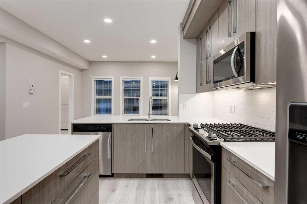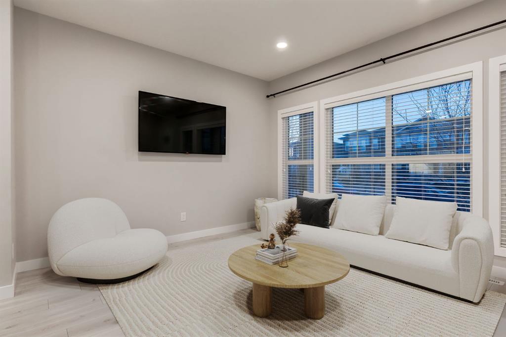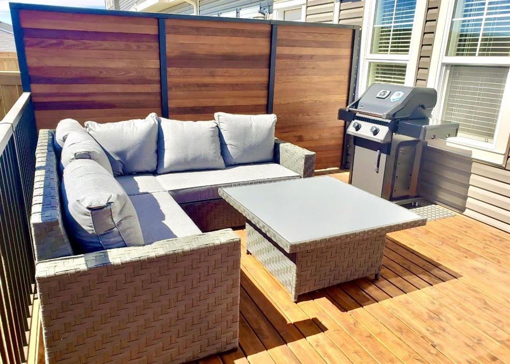 Welcome to this immaculate 1542.59 sq ft end-unit two store townhouse in the desirable community of Carrington. Offering 3 bedrooms, 2.5 bathrooms with an additional 729.18Sq ft unfinished basement with 9 foot ceilings + a double garage, this home combines modern design with everyday functionality. As you enter the foyer you notice the 9’ ceilings. The main floor features a bright, open-concept layout with large windows that flood the space with natural light enhanced by the added privacy and extra light of an end unit. The kitchen is both stylish and functional, complete with quartz countertops, stainless steel appliances, a gas stove, and a large island with plenty of storage, perfect for cooking, entertaining, and gathering with family and friends. The dining and living areas flow seamlessly together, creating a comfortable and inviting space. There is a mud room with a bench and closest that leads to the SOUTHWEST backyard walking onto a spacious railed cedar deck with privacy screen, natural gas line for BBQ perfect for relaxing and entertaining in your own outdoor retreat. Step down to a beautifully maintained fenced backyard, where you can relax and enjoy your outdoor activities. As you walk upstairs, you’ll find all three bedrooms, including a spacious primary suite with a walk-in closet for storage and a private ensuite which includes dual sinks, private toilet and a modern glass/tiled walk-in large shower. Convenient second-floor laundry makes day-to-day living that much easier, right where you need it most. Down the hallway you have another 4 pc bathroom with soaker tub, perfect after a long day of work/activities. The 2nd + 3rd bedrooms are spacious which can also be used for family/guests or as an office. Heading back down to the main level you are welcomed by a 2 pc bathroom + the unfinished basement that offers a blank canvas, ready for you to create the space that suits your lifestyle, whether that’s a home gym, media room, bedroom or additional living area. Take advantage of the many upgrades this home provides such as gorgeous KOHLER faucets, garburator, under cabinet lighting, plank flooring throughout including upstairs, and newly replaced shingles (2025) great for insurance. Located close to parks, pathways, wetland areas, schools, shopping, and major routes such as Stoney Trail, Deerfoot and Centre Street, this home offers the perfect balance of comfort, convenience, and low-maintenance living. An excellent opportunity to own a bright, well-designed end-unit townhouse. There are 12 virtual staging photos in this listing. Book your showing today.