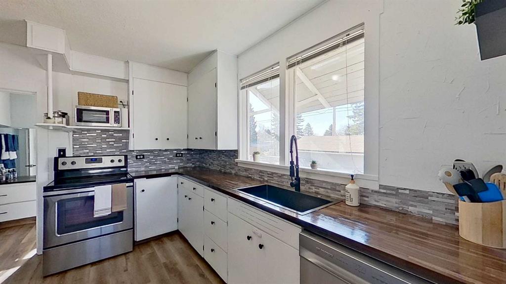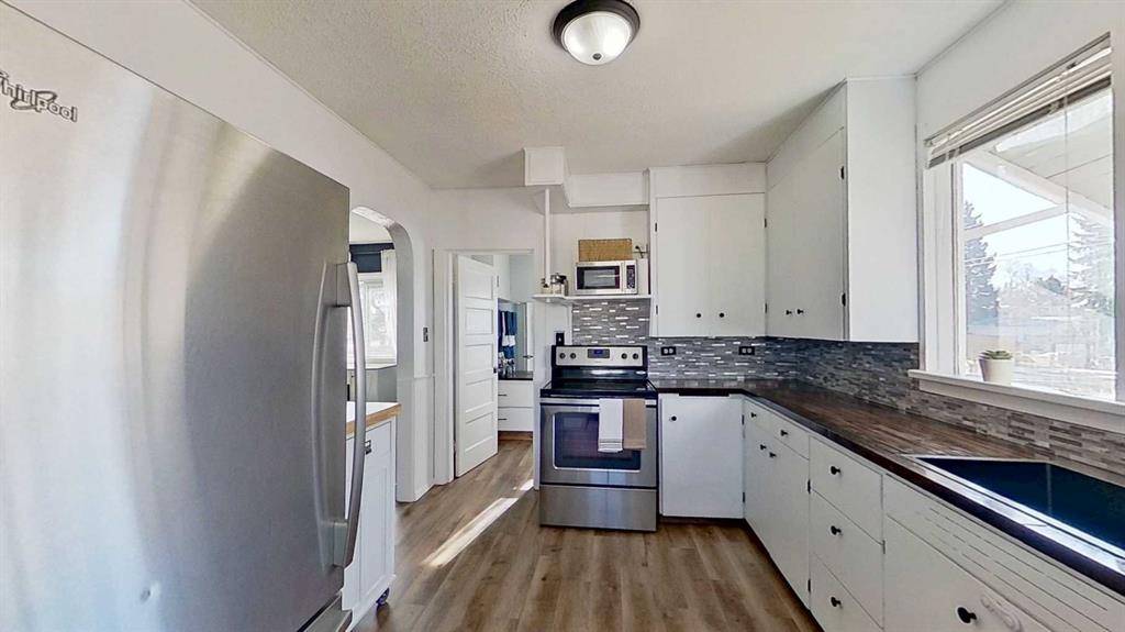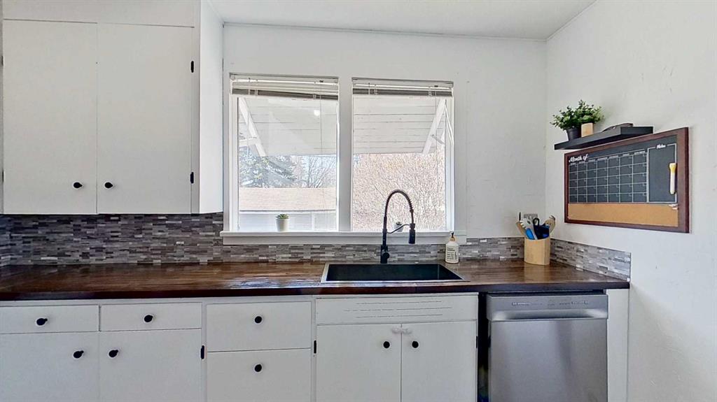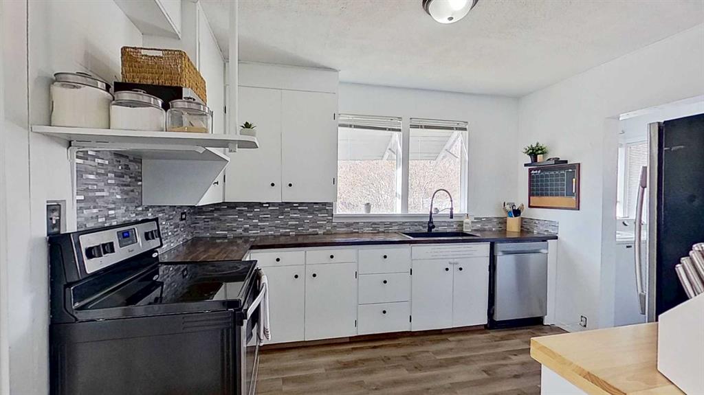 This property is just over 900 sq ft it has 2 bedrooms, new flooring in livingroom, dining, bathroom,kitchen and porch. Bathroom has been totally renovated with new tile in shower new faucets in shower and sink, New toilet and counter top. Fresh paint in entire house. Kitchen has new butcher block counter top, new sink and taps, new dishwasher and new back splash. New dining room fan. new baseboards. New deck railing. Large yard. Fenced yard. Large deck.