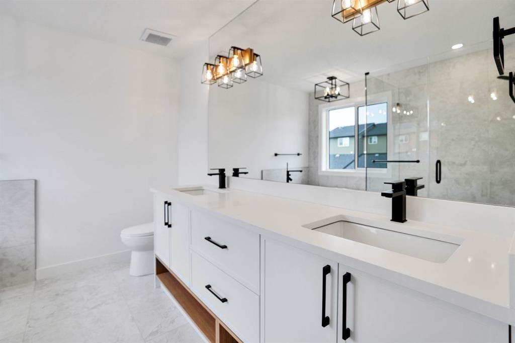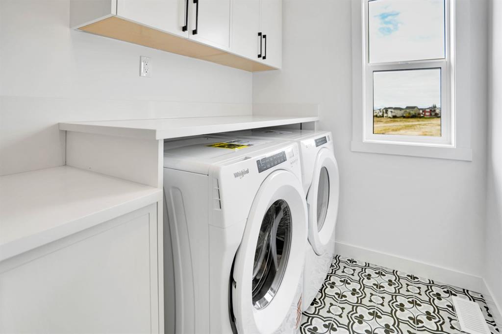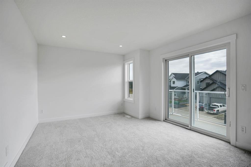 Welcome to this stunning 2200+ sq. foot home in the heart of Pinnacle in Sunset Ridge, Cochrane, where modern design meets natural beauty. Just 45 mins from the majestic Rocky Mountains and 30 mins from downtown Calgary, this home is surrounded by serene ravine and mountain views, offering the perfect balance between peaceful retreat and urban convenience. Built with every detail in mind, the home features a timeless neutral colour palette and large windows that fill each room with natural light. The open-concept great room centers around a cozy fireplace, seamlessly connecting to a spacious dining area and chef inspired kitchen. The kitchen boasts elegant white oak cabinetry with under-cabinet lighting, a large central quartz island ideal for entertaining, and high-end stainless steel KitchenAid appliances, including a gas stove, built in wall oven, and microwave. A Blanco granite sink adds both functionality and style to this beautiful space. Upstairs a central bonus room opens onto a private balcony where you can take in the sweeping views of the ravine and mountains. The primary suite is a tranquil retreat with a soft accent wall and a decorative barn door leading to the luxurious 5-piece ensuite complete with a stand-up shower, freestanding soaker tub, dual vanity, and large walk in closet with custom built in shelving. The upper floor also features a convenient laundry room with washer and dryer, built in sink, and additional cabinetry, as well as 2 spacious secondary bedrooms designed fo comfort and flexibility. Thoughtful details are found throughout the home, including a wide front entrance with built in bench, a mudroom with organized shoe racks and coat hooks, and balconies at both front and back of the house that offer 360-degree views. Additional conveniences include AC, blinds, gas line to the garage, a separate side entrance, and a large back deck with a BBQ gas hookup, perfect for outdoor gatherings. This exceptional property is ideally located near scenic walking trails, schools, restaurants, and shopping, making it the perfect place to call home. Combining modern craftsmanship, elegant finishes, and breathtaking surroundings, this Cochrane residence offers the best of luxury living with a touch of mountain tranquility. Call for your private showing today.