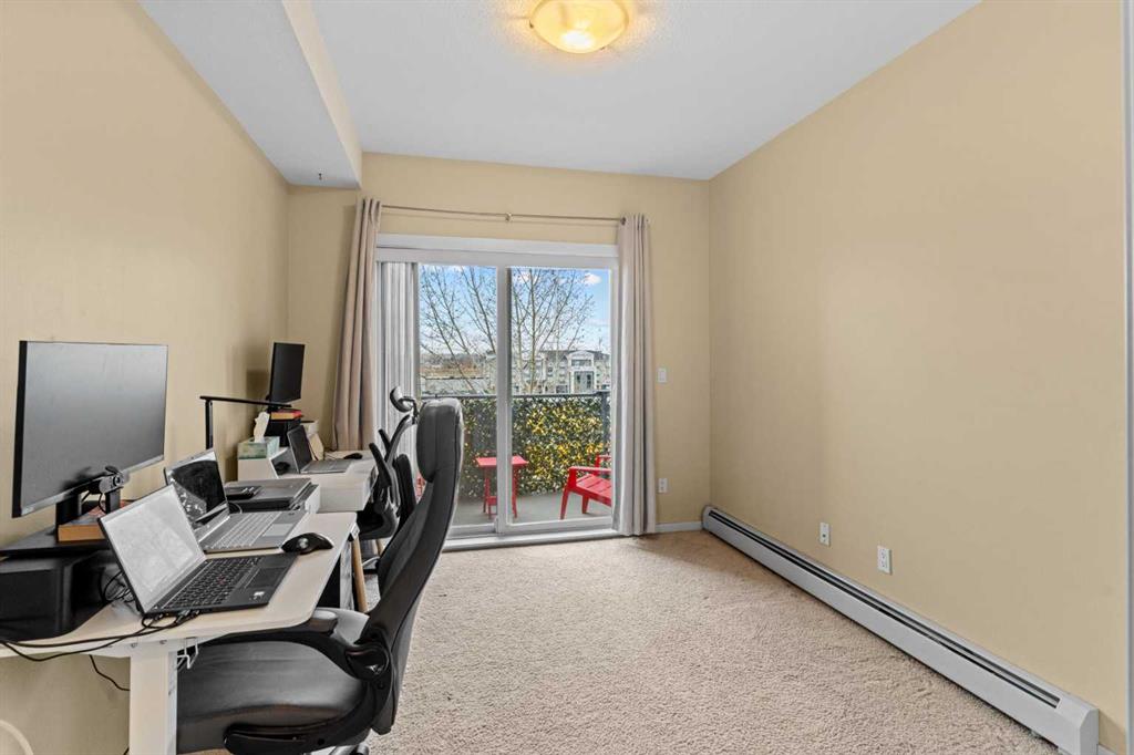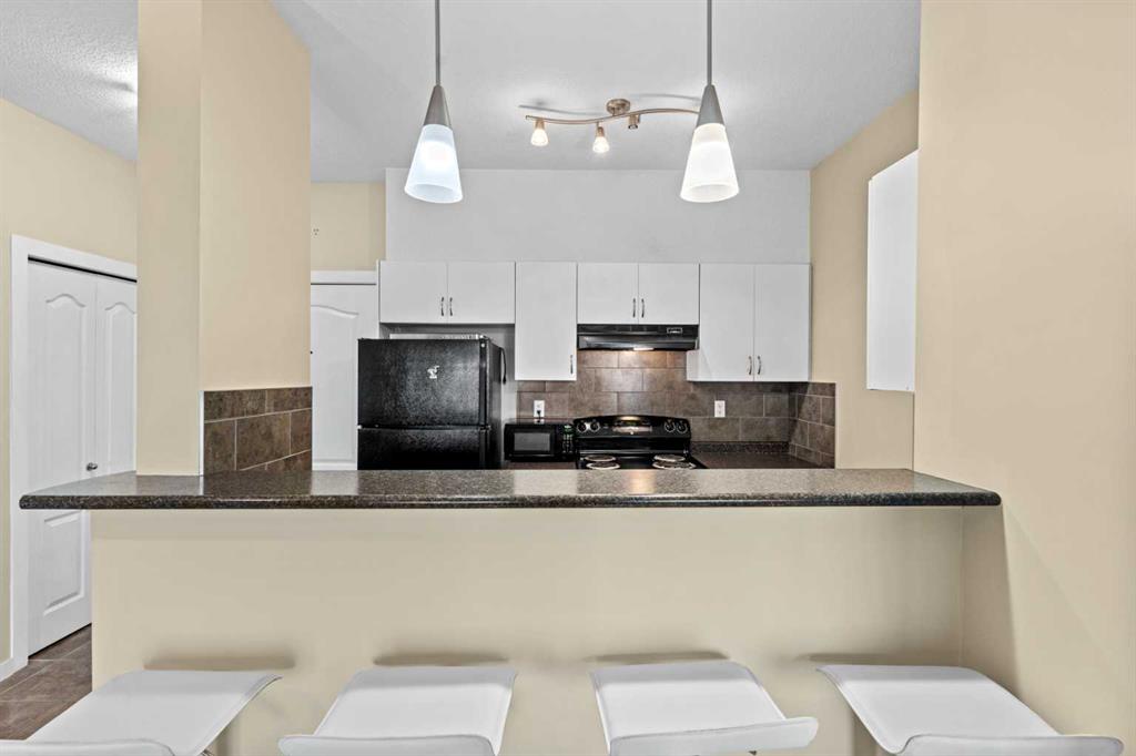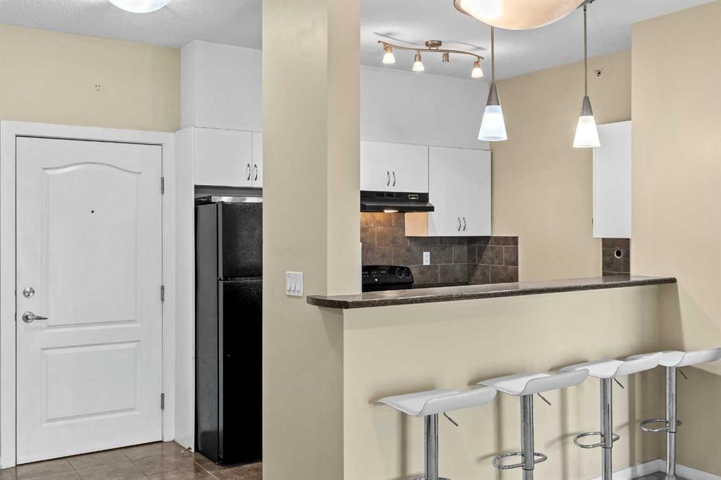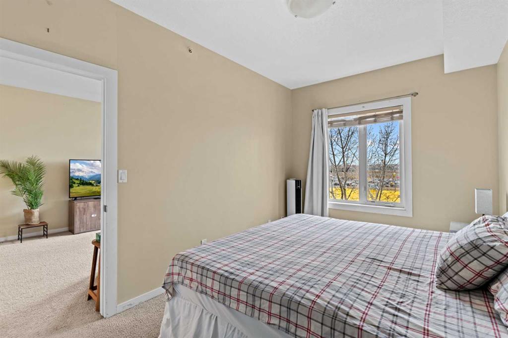 Top-floor 2 Bedroom + Den condo with 2 full bathrooms, heated underground parking, and west-facing mountain views. Enjoy a bright, open layout filled with natural light, large windows, and a private balcony surrounded by mature trees for added privacy. Sunlight pours through the west-facing windows, highlighting an open floor plan designed for comfort and everyday living. The kitchen anchors the space with a large eating bar — perfect for morning coffee or casual evenings with friends — flowing seamlessly into the inviting living area. Step out onto your private balcony and take in the unobstructed mountain views — your own peaceful escape at the end of the day. This home offers a versatile den ideal for a home office or guest room, along with two spacious bedrooms. The primary suite features a walk-through closet and private ensuite, while in-suite laundry adds everyday convenience. Additional highlights include titled heated underground parking, bike storage, a welcoming lobby, and ample visitor parking. Located steps from the Genesis Centre and East Lake, with easy access to shopping, dining, schools, transit, and Highway 2.