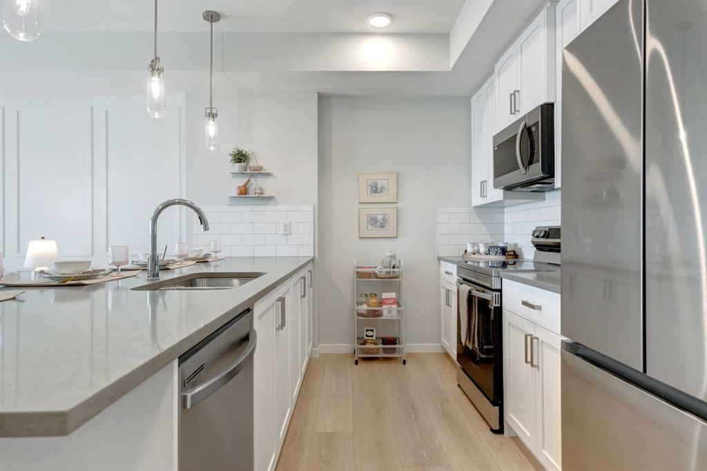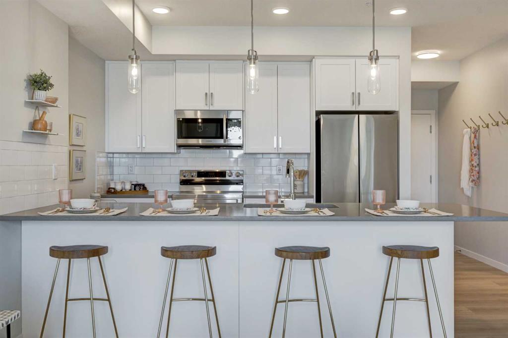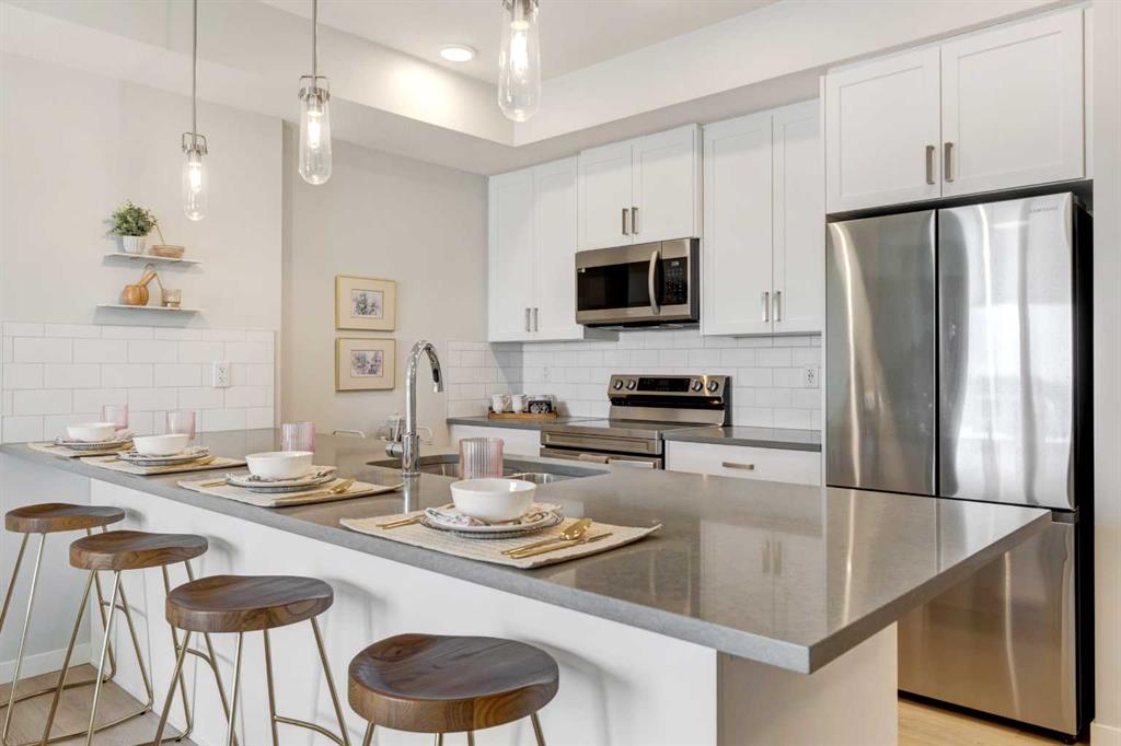 **Please contact the listing agent for information regarding available units and current inclusions - estimated completion April 2027-December 2028*** PHOTOS ARE OF FORMER SHOW SUITE - ACTUAL UNIT FINISHES WILL VARY. Welcome to MINTOFT PLACE ON BLACKFOOT TRAIL, a brand-new development by CEDARGLEN LIVING, 6x Customer Insight Builder of Choice Award winner. This “N4” floor plan offers 776.02 sq. ft. RMS (837 sq. ft. builder size) with 2 beds + 2 baths, a bright open-concept layout with 9’ ceilings and LVP flooring throughout common areas, carpets in the bedrooms and closets (option to upgrade to LVP). The modern kitchen features quartz countertops, large island, stainless steel appliances, undermount sink, and flush countertop eating area. The living area is ideal for entertaining and relaxing after a long day. The primary bedroom includes a large bright window and 4pc ensuite, while the second bedroom is thoughtfully positioned for added privacy near the 2nd 4pc bathroom. Additional highlights include Low-E triple-glazed windows, ERV fresh air system, BBQ gas line, in-suite laundry, sound-reducing membrane, glass patio railing, and 1 titled underground parking stall. Once in a lifetime community off Blackfoot Trail and Southland Drive in Calgary. Nature lovers will appreciate that Sue Higgins park and Carburn Park are a short stroll away. Deerfoot meadows shopping centre, anchored by Costco, Ikea and Walmart, along with many other amazing shops and restaurants are located in very close proximity. Pet and rental friendly complex.