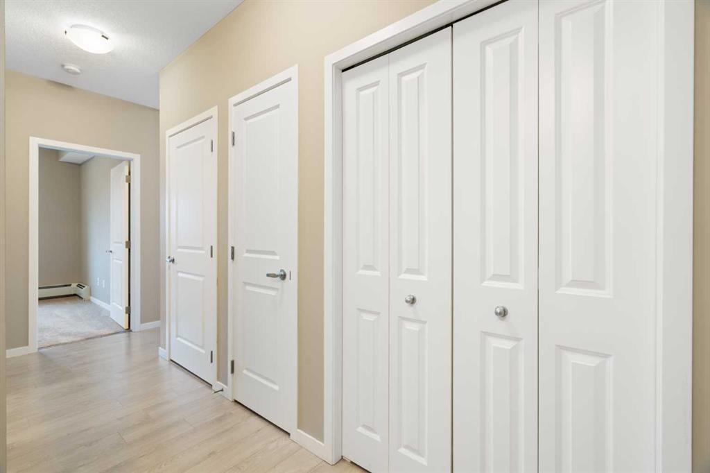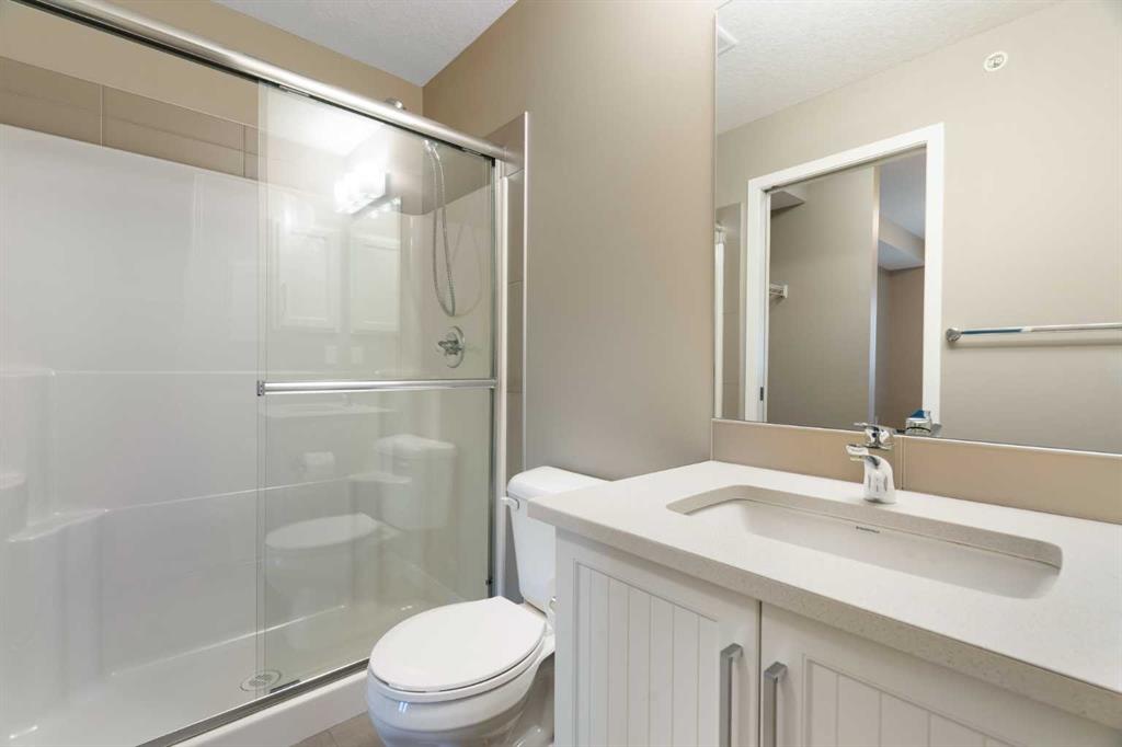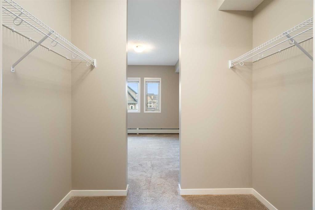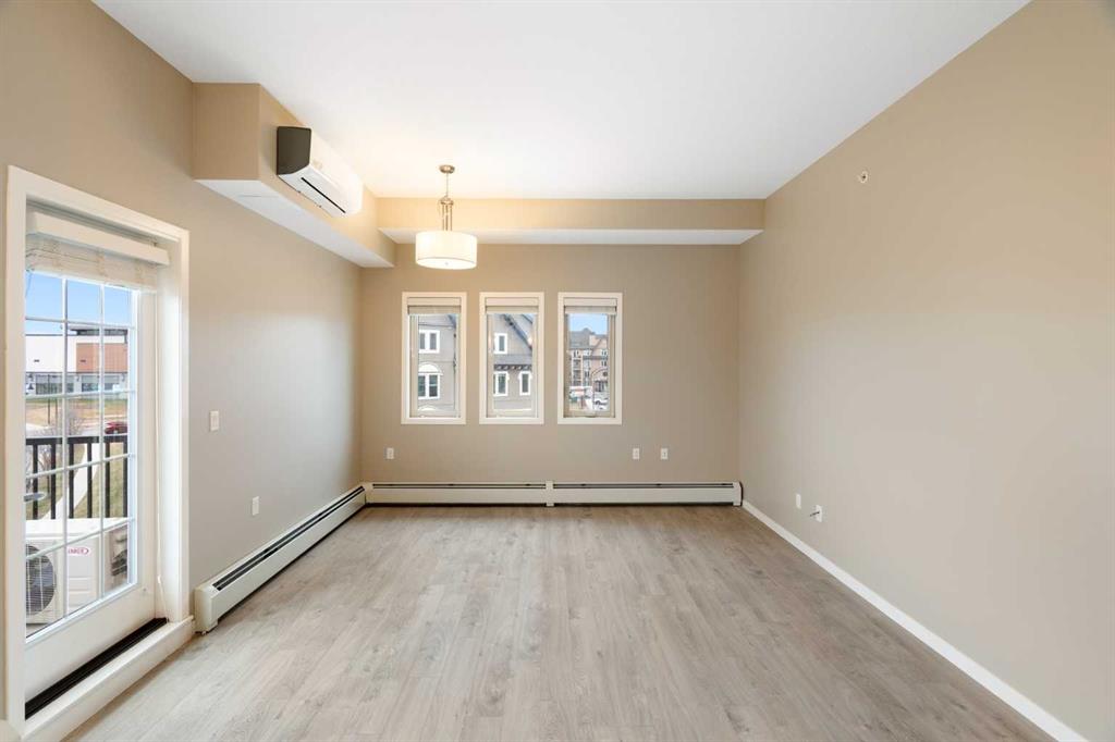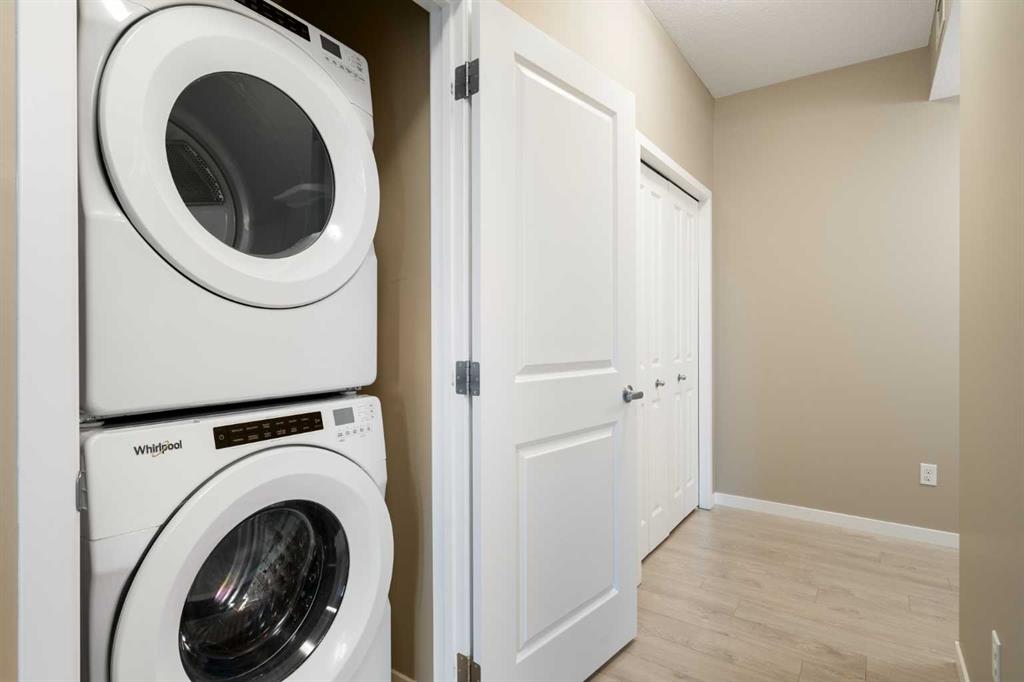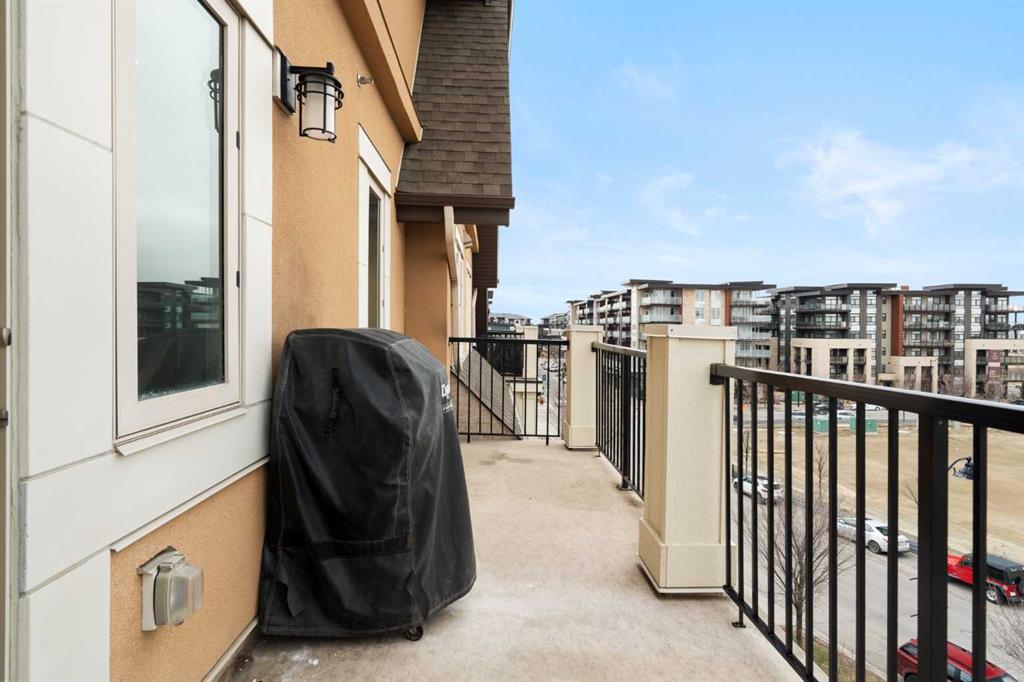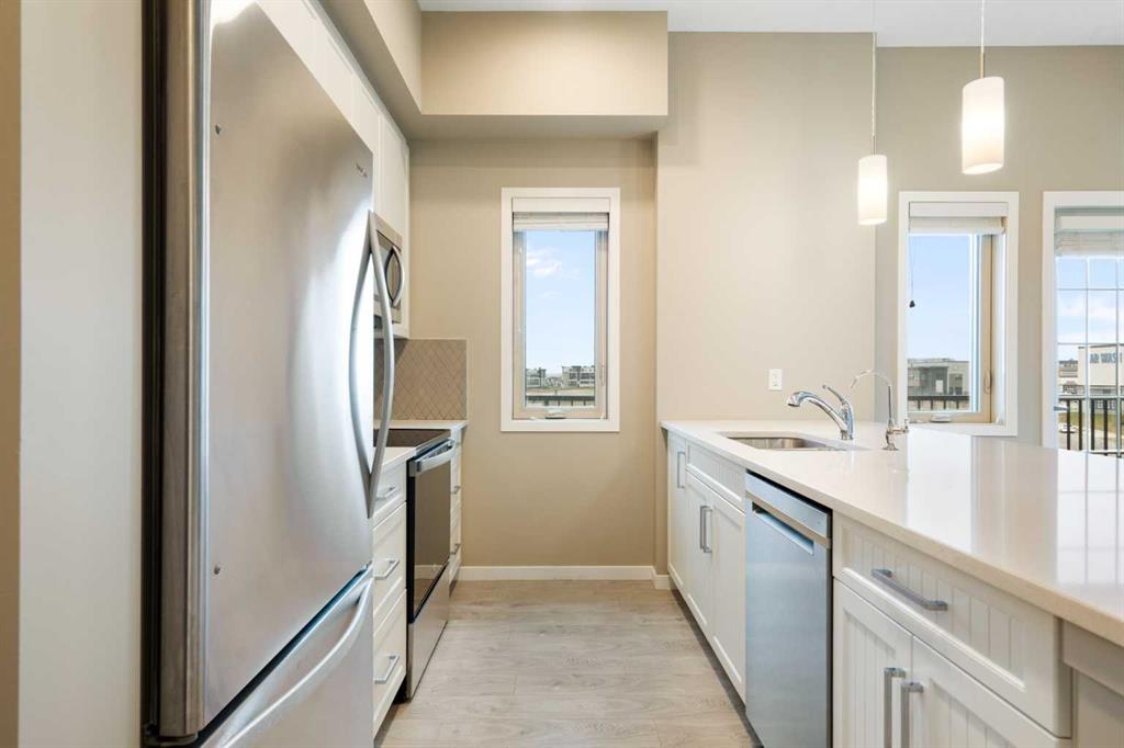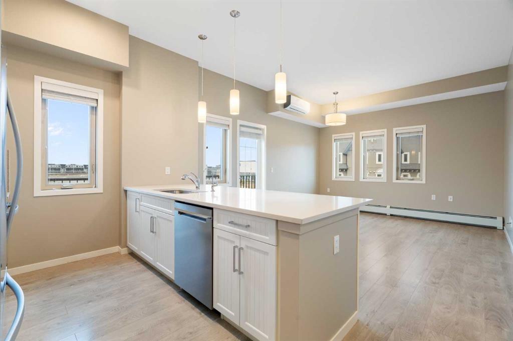 Your opportunity to make your next home in Sandgate, a great condo complex in the highly desirable lake community of Mahogany. This well designed and upgraded 2-bedroom, 2-bathroom corner unit with 900 sq. ft. of living space located on the top floor with a southwest exposure is a rare find. As you approach the unit, you will notice it is located at the end of the wide hallway, being one of 2 units sharing the entire end of the building. Open the door and you will experience the bright crisp freshness of this contemporary home. The 9’ knock down ceilings, vinyl plank flooring, and 2 closets for plenty of storage are great features. A few steps forward and you will be in the open living area with a 10’ ceiling and many windows flooding the space with natural light. Take a look at the gourmet kitchen. There is a massive island with breakfast bar, white quartz counter tops, an abundance of upgraded shaker cabinets with tall upper cabinets, soft closing doors and drawers, an abundance of pot drawers with under-mounted rollers, stainless steel appliances and a water purifier. The generous living room opens to the south facing large balcony with gas line and barbeque. A wall mounted air conditioner with separate compressor keeps the living area comfortable on those wonderful summer days. Wide slat venetian blinds throughout the unit provide the option to block out the light and heat. The spacious primary bedroom features a large walk-through closet and a 3-piece en-suite bathroom with quartz counter, tile floor, walk-in shower and a medicine cabinet. On the opposite side of the unit there is a second bedroom located beside a 4-piece bathroom with quartz counter, tile floor and a medicine cabinet. The stacked front-loading washer/dryer complete this wonderful home. Lightly lived in and well maintained, this unit has been professionally repainted in neutral colours and is move-in ready. There is a titled underground parking stall with a caged storage locker just down the stairwell beside this unit or take a short walk and ride the elevator. The complex offers a bicycle storage room, fitness center in building 10 and 2 guest suites. All this is located within walking distance of the heart of Mahogany with shops, services and all of the lake amenities including a clubhouse, swimming, skating, tennis courts, fishing and so much more. You have easy access to Stoney Trail and only minutes to the South Calgary Health Campus, Brookfield YMCA, public library and the future LRT station. Check it out today!
