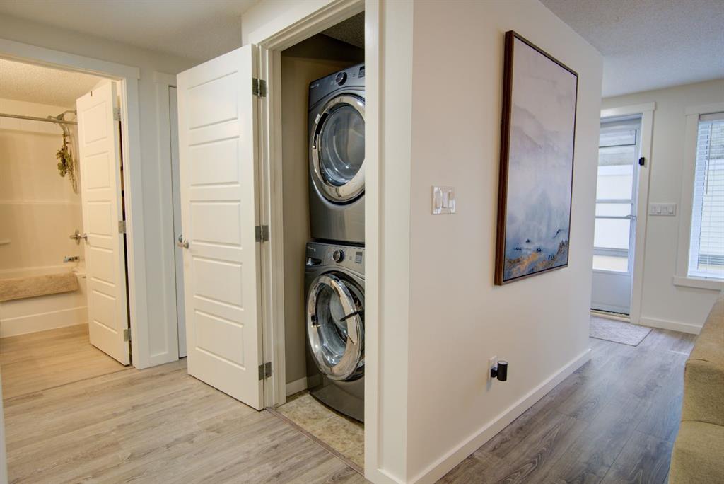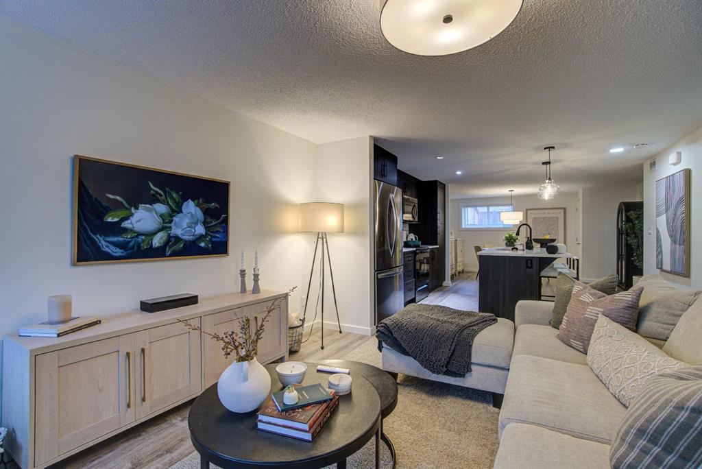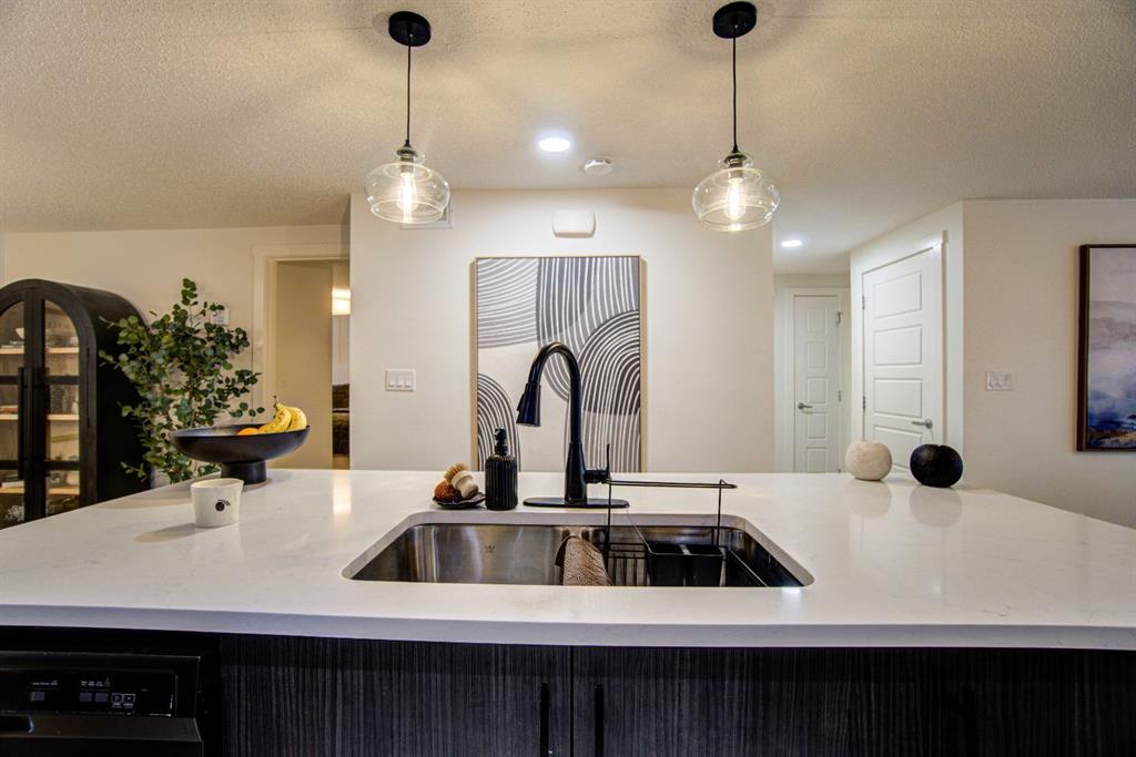 Have you been waiting for the perfect home that offers simple living at its finest? Look no further. Welcome to this beautifully maintained 2-bedroom, 2-bathroom pet-friendly condo located in the charming community of Okotoks, just steps from shopping, amenities, and more. Designed with an open-concept layout, this home features a warm and inviting living room paired with a stunning modern kitchen complete with quartz countertops, full-height cabinetry, and a large eat-up island—perfect for entertaining or casual dining. The adjacent dining area offers an ideal space for hosting family and friends. The spacious primary bedroom includes a generous closet and a private 4-piece ensuite, while the second bedroom is perfectly situated near the main bathroom—ideal for guests, a home office, or additional living space. Convenience is key with in-suite laundry and added storage within the furnace room. Step outside to your private south-facing patio, offering plenty of sunshine, privacy, and the perfect setting to unwind or entertain. A gas BBQ hookup adds even more functionality to this outdoor space. Say goodbye to yard work, this is low-maintenance living at its best.