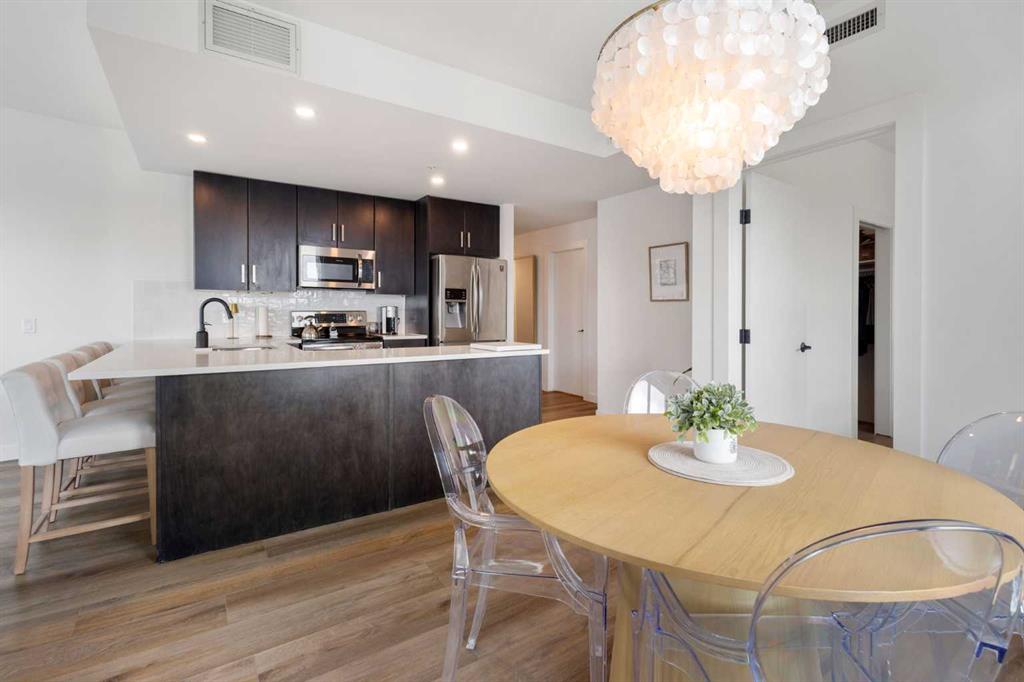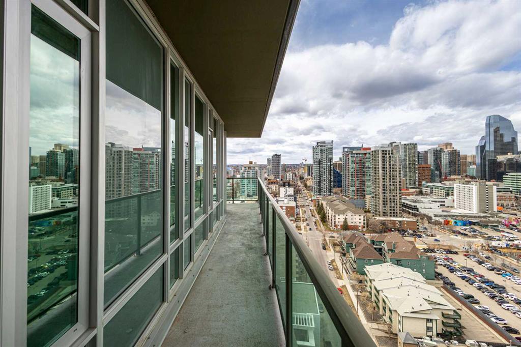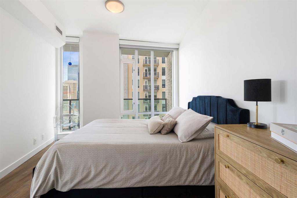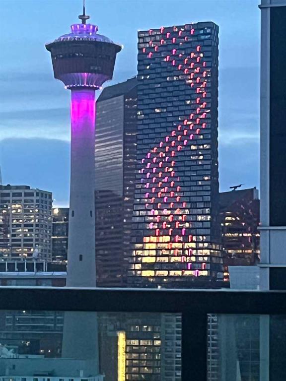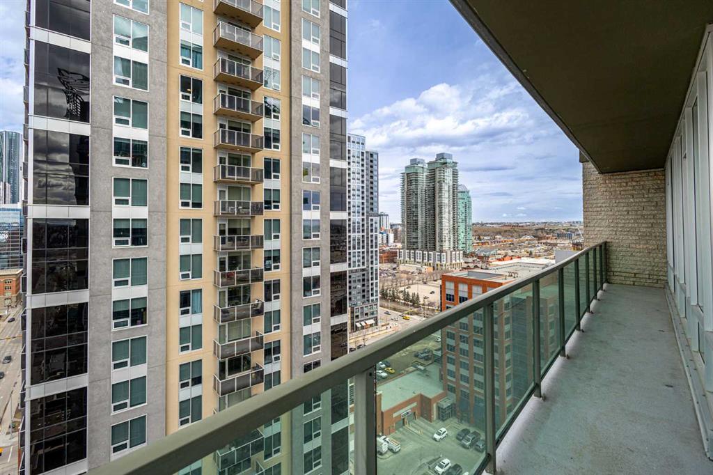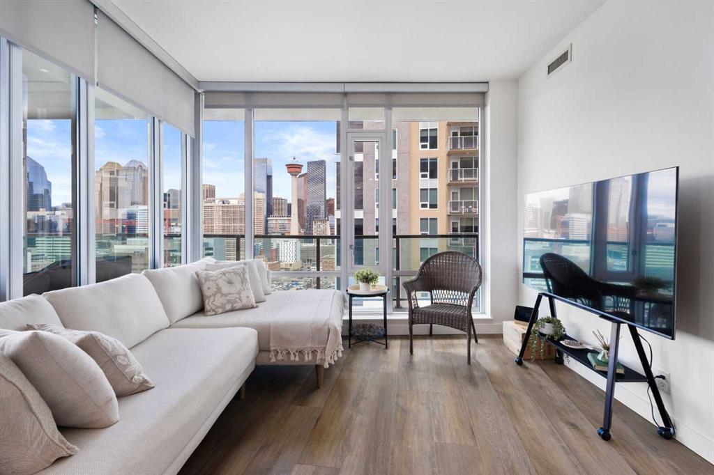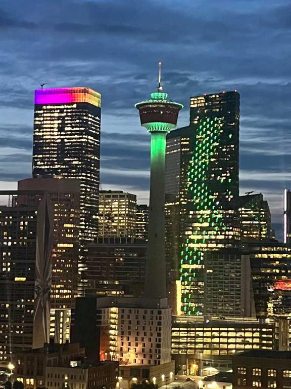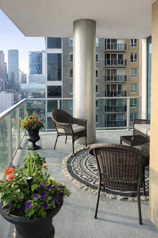 Welcome to this stunning 18th-floor sky suite offering breathtaking panoramic views of the city skyline and Rocky Mountains. Located in Sasso, a 18+ concrete building in the heart of Calgary’s vibrant Beltline, this home combines lifestyle, location, and flexibility. Recently updated throughout, this unit features new luxury vinyl plank flooring, fresh paint, new bathroom tile, and quartz countertops in both the kitchen and bathrooms, giving the home a clean, modern feel. The open-concept layout is designed for both everyday living and entertaining, with floor-to-ceiling windows that flood the space with natural light and showcase the incredible views. The modern kitchen is both stylish and functional, complete with quartz countertops, sleek tile backsplash, stainless steel appliances, double sink, and a breakfast bar. This unit offers two generously sized bedrooms, each with ample closet space, along with two full bathrooms. The primary ensuite features a relaxing jetted tub, perfect for unwinding at the end of the day. A dedicated desk area near the entrance provides the ideal setup for working from home. Step outside to your large private balcony with a gas hookup, ideal for summer BBQs while enjoying the city and mountain backdrop. Additional features include in-suite laundry with washer and dryer, a titled underground parking stall, and a storage locker. Residents of Sasso enjoy a full range of amenities including a fitness centre, sauna, hot tub, games room, lounge, private theatre, outdoor patio, visitor parking, and part-time concierge and security. Unbeatable location just steps to the Scotiabank Saddledome, Stampede Park, and Victoria Park/Stampede Station, plus all the dining, shopping, and nightlife along 17 Avenue SW.