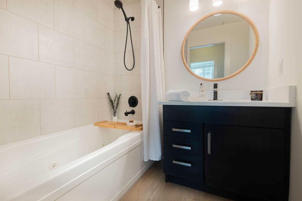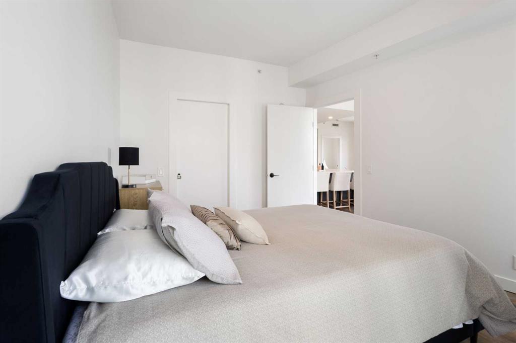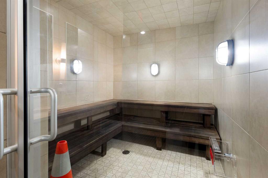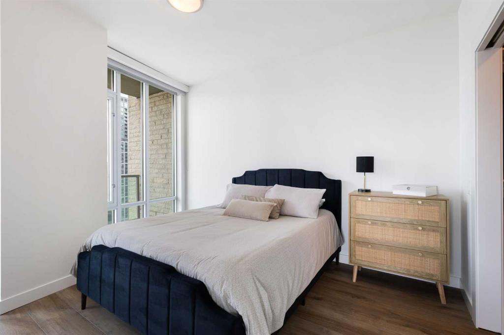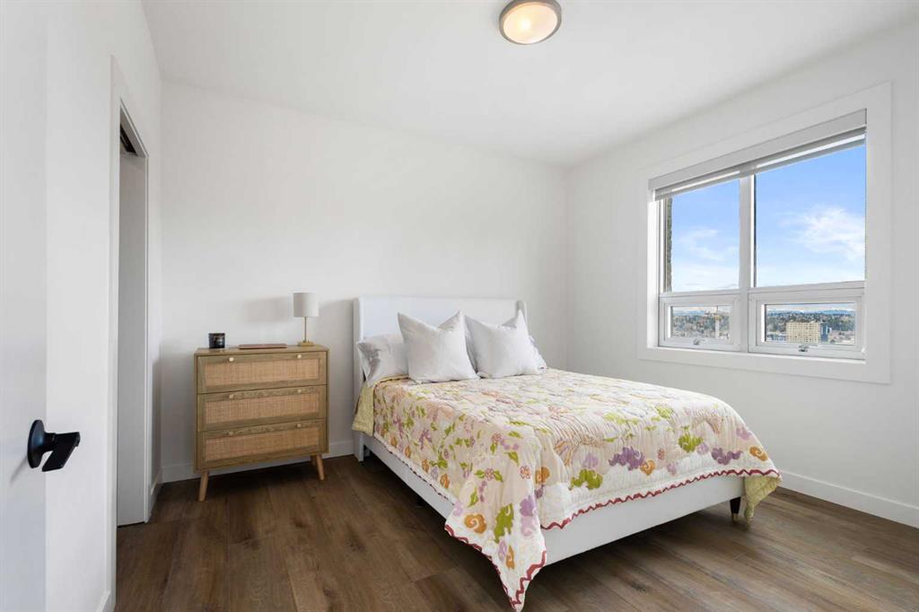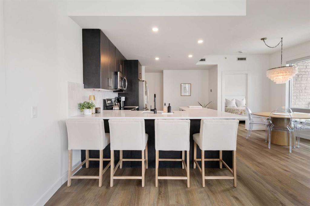 Welcome to this stunning 18th-floor sky suite offering breathtaking panoramic views of the city skyline and Rocky Mountains. Located in Sasso, a 18+ concrete building in the heart of Calgary’s vibrant Beltline, this home combines lifestyle, location, and flexibility. Recently updated throughout, this unit features new luxury vinyl plank flooring, fresh paint, new bathroom tile, and quartz countertops in both the kitchen and bathrooms, giving the home a clean, modern feel. The open-concept layout is designed for both everyday living and entertaining, with floor-to-ceiling windows that flood the space with natural light and showcase the incredible views. The modern kitchen is both stylish and functional, complete with quartz countertops, sleek tile backsplash, stainless steel appliances, double sink, and a breakfast bar. This unit offers two generously sized bedrooms, each with ample closet space, along with two full bathrooms. The primary ensuite features a relaxing jetted tub, perfect for unwinding at the end of the day. A dedicated desk area near the entrance provides the ideal setup for working from home. Step outside to your large private balcony with a gas hookup, ideal for summer BBQs while enjoying the city and mountain backdrop. Additional features include in-suite laundry with washer and dryer, a titled underground parking stall, and a storage locker. Residents of Sasso enjoy a full range of amenities including a fitness centre, sauna, hot tub, games room, lounge, private theatre, outdoor patio, visitor parking, and part-time concierge and security. Unbeatable location just steps to the Scotiabank Saddledome, Stampede Park, and Victoria Park/Stampede Station, plus all the dining, shopping, and nightlife along 17 Avenue SW.