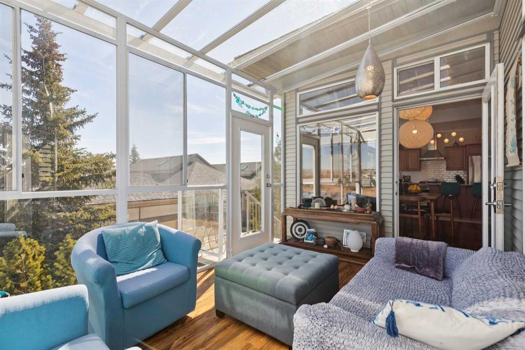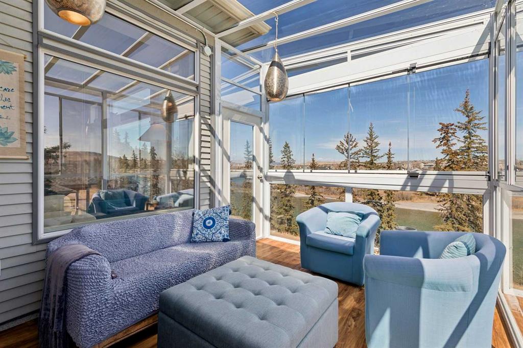 WOW! Prepare to be impressed by this stunning, ultra-stylish, recently updated TOP FLOOR condo offering breathtaking, UNOBSTRUCTED VIEWS of the Bow River, River valley and ROCKY MOUNTAINS! This exceptional home delivers a truly unique lifestyle, featuring a PRIVATE ELEVATOR with direct access to your unit and a HEATED DOUBLE GARAGE with additional storage. Nestled along the Bow River and Jumping Pound Creek, this tranquil setting is surrounded by scenic pathways, creating the perfect backdrop for relaxing, entertaining, and enjoying the outdoors year-round. Inside, the home is flooded with natural light, showcasing soaring 10-foot ceilings and beautiful engineered flooring throughout. The open-concept main living area is both elegant and functional, highlighted by a modern kitchen complete with a gas stove, stainless steel appliances, and granite countertops—ideal for hosting or everyday living. To the front of the unit, you’ll find two spacious bedrooms, including a large primary retreat with a luxurious 4-piece ensuite featuring a soaker tub. A second 4-piece bathroom also offers granite countertops. A bright and spacious office provides an ideal work-from-home space. This home is loaded with premium features, including AIR CONDITIONING and convenient ATTIC STORAGE for seasonal items. Recent upgrades elevate both comfort and style, including a STUNNING 3 SEASON SUNROOM ($34,000 ), new sliding doors and designer lighting throughout the entire home. Additional updates include LG washer and dryer (Nov 2023), Whirlpool refrigerator (2022), and Bosch dishwasher (2025). With unparalleled views, upscale finishes, and a serene natural setting, this is a rare opportunity to enjoy refined riverside living at its finest. Book your showing today!!