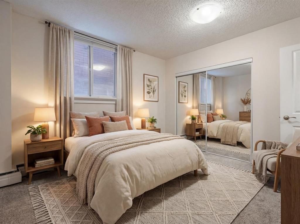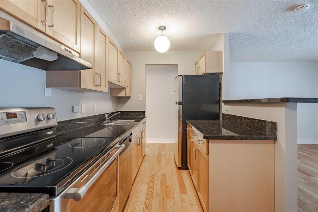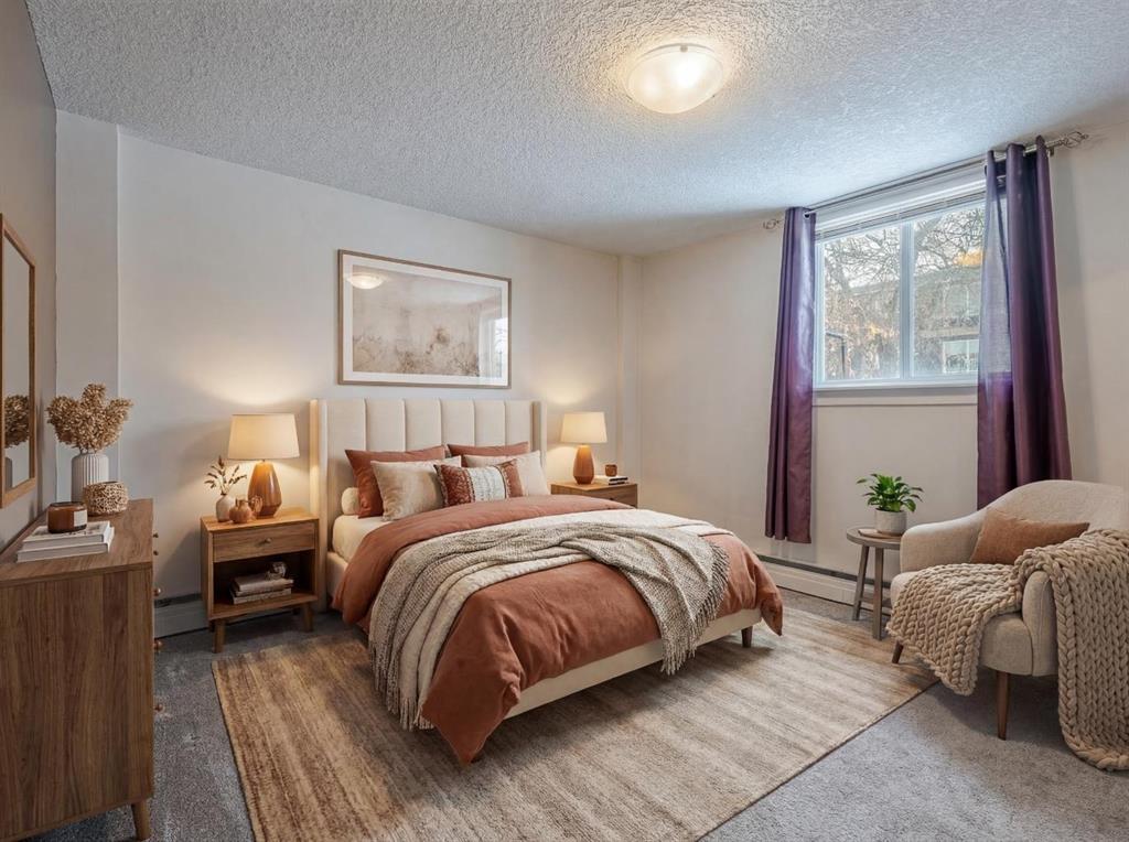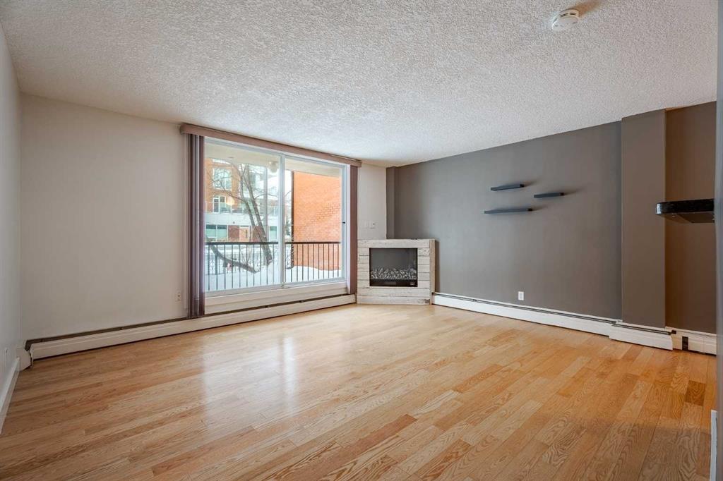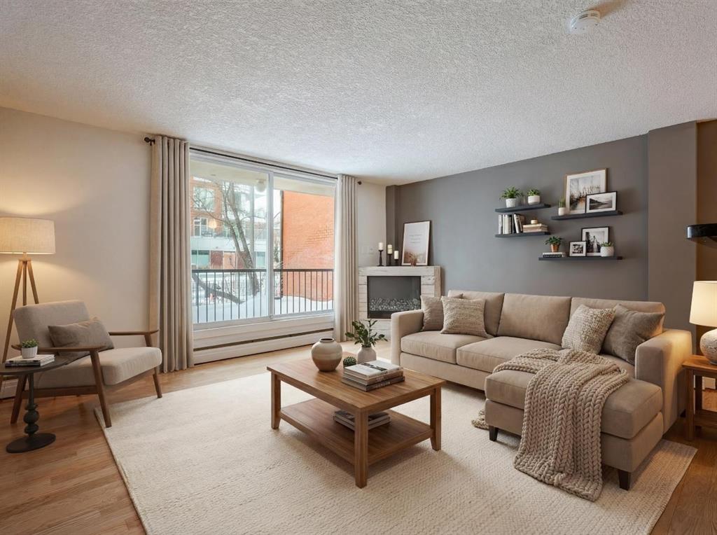 Charming and spacious ground-floor corner condo offering around 800 sq ft of comfortable, low-maintenance living in a highly walkable location. This beautifully updated 2-bedroom, 1 full 4-piece bath unit features gleaming hardwood floors and fresh paint throughout, creating a warm, move-in-ready space in Sunnyside! You’ll love the open-concept layout that seamlessly connects the renovated kitchen to the living room. The kitchen boasts granite counter tops, newer cabinets, and modern finishes, making it perfect for cooking and entertaining. The bright living room includes an elegant electric fireplace and opens onto a large, private south facing balcony – ideal for relaxing or enjoying your morning coffee. The totally renovated bathroom offers contemporary fixtures and a clean, stylish design. Additional updates include newer windows and interior doors, as well as a convenient new stacked washer and dryer in-suite. There is a handicap accessible ramp in front of the building . An assigned surface parking stall is included for your convenience. Located just a short walk to shops (Safeway), bus stops, Sunnyside LRT station, next door to Acme Pizza and nearby parks, this condo combines comfort, style, and an unbeatable inner-city lifestyle. Aggudo Coffee, Flippin Burgers, Kim’s Katsu, Regal Cat Café, Bombay Tiger, Red’s Diner.. just to name a few eateries minutes from your home. Perfect for first-time buyers, downsizers, or investors!