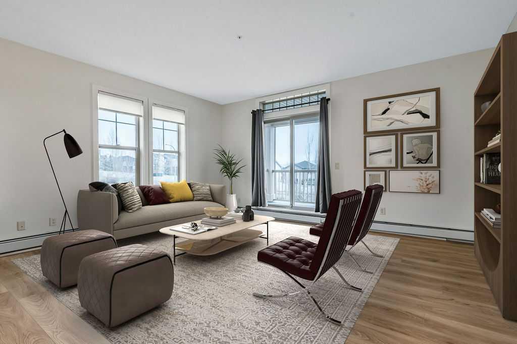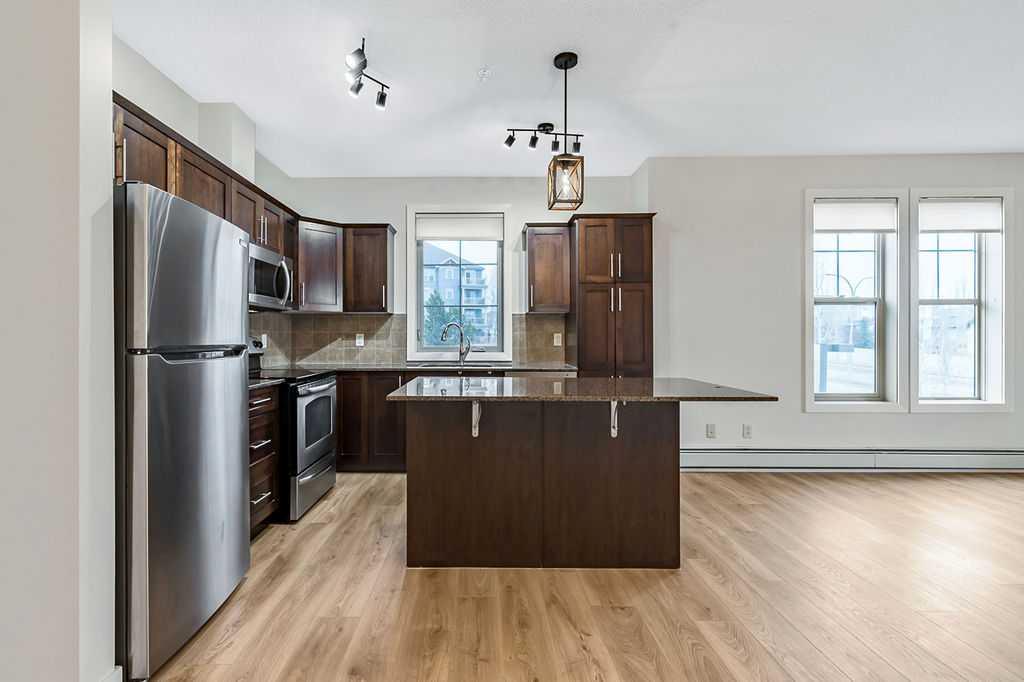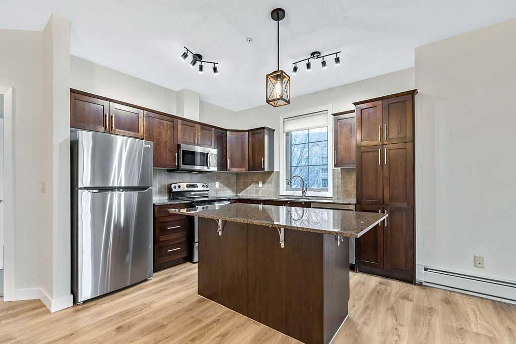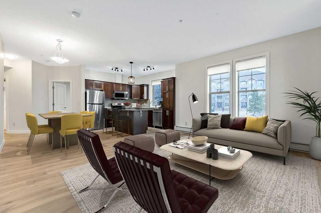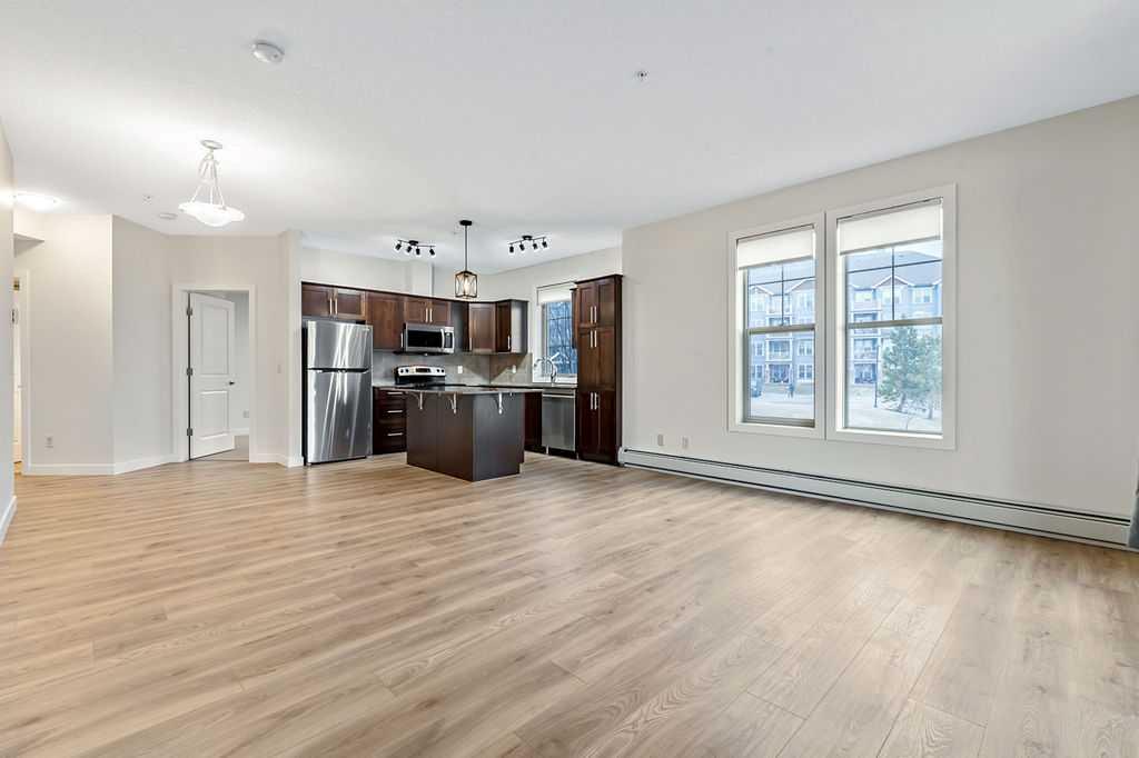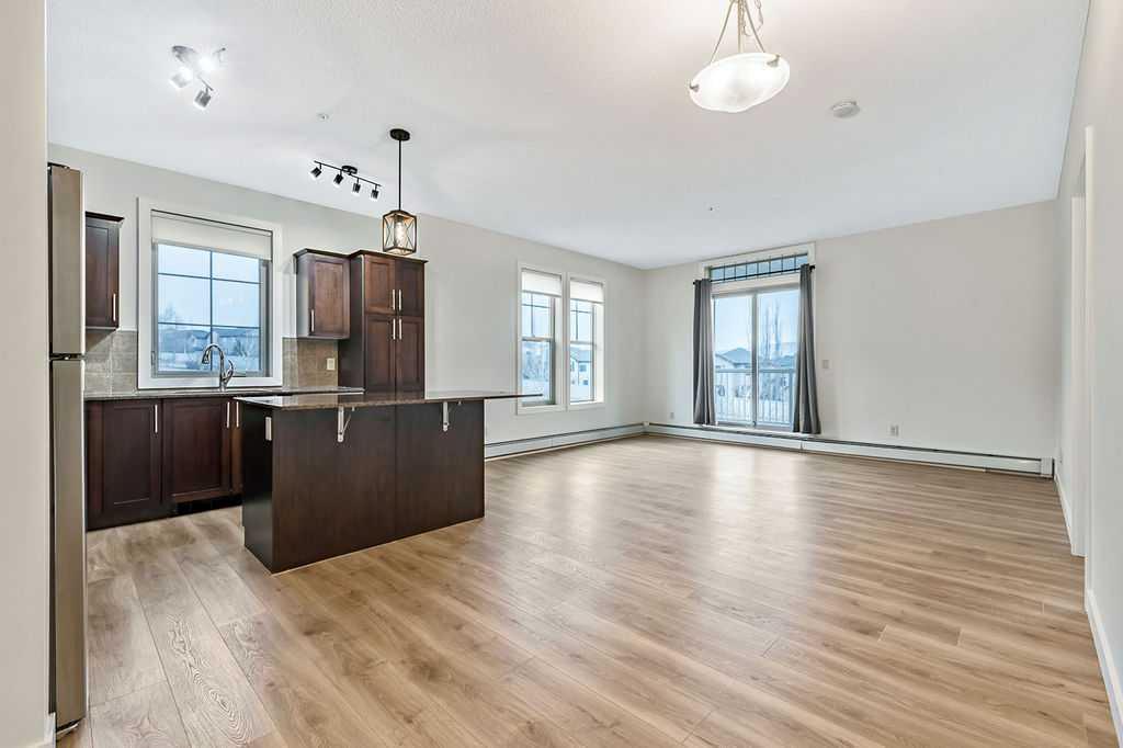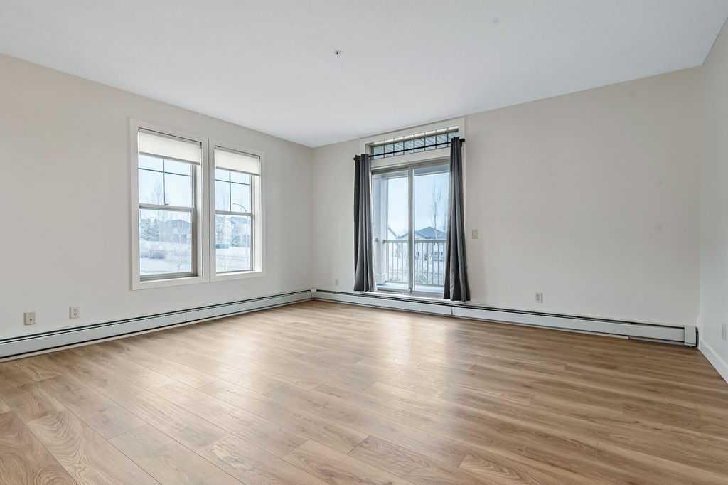 Bright corner unit at 'Alora at Sunset Ridge' — rare and ready to enjoy! This recently updated 2 bedroom + den condo is situated at the end of the floor, next to the stairwell, so it actually has no common walls! This lovely unit offers 2 full baths, in-suite laundry, brand new laminate floors, fresh paint throughout and a recently replaced dishwasher. The open-plan living area is bright and spacious, filled with natural light thanks to the corner placement, and flows seamlessly to a very large southwest facing deck with stunning mountain views on a clear day — perfect for morning coffee or evening sunsets. The primary bedroom includes a walk-in closet and private ensuite for added comfort and convenience. The second bedroom is ideally situated on the opposite side of the unit, next to the second bathroom. You’ll also appreciate two parking stalls and a large storage locker. Alora is well managed and maintained, with an active social club, fitness facility, and a guest suite for visiting family and friends. Cochrane is a vibrant, growing centre that still feels like small-town living — close-knit, friendly, and full of amenities. If you’re looking for a bright, move-in ready home with great facilities and spectacular views, this one’s worth a look — contact your Realtor to arrange a showing.