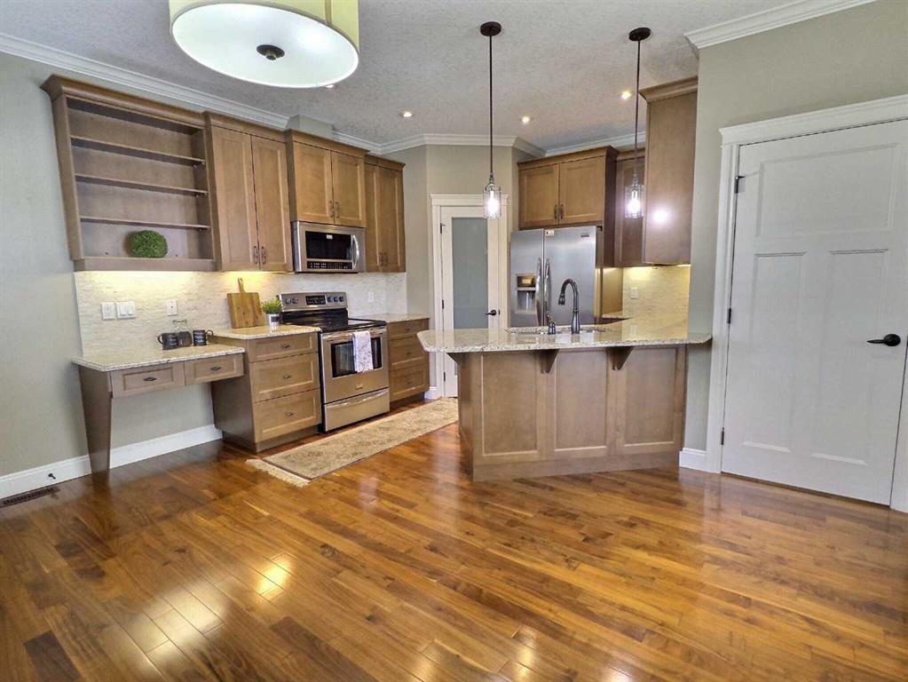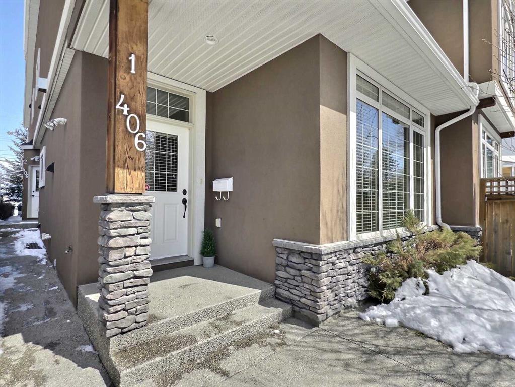 Welcome to this bright and beautiful front unit featuring 2 bedrooms, 2.5-bathrooms in this highly sought-after location. With almost 1,400 sq. ft. of well-designed living space, this property offers exceptional comfort and style. Gorgeous acrylic stucco, stone work aggregate walkways and mature trees, give this home amazing curb appeal. Both master bedrooms feature their own 4-piece ensuite bathrooms and large walk in closets, making it ideal for privacy and convenience. Enjoy the beautiful downtown skyline view from the front bedroom. The main floor is graced with stunning hardwood floors and a cozy gas fireplace that adds warmth and charm. 9-foot ceilings throughout the main level provide an open, airy atmosphere. The kitchen is a dream with ample storage, a huge pantry, loads of counter work space, stainless steel appliances, and beautiful granite countertops, along with a generous sized dining area perfect for dinner parties. The home is equipped with a vacuflo system, including attachments as well. Outside, you can have a BBQ off your front porch, which is very private with the beautiful trees. You will also find a detached garage offering a single titled parking space, perfect for those cold winter months. There is additional street parking available for guests and one guest parking spot in the back. The full basement, though unfinished, is full of potential, with a large window providing natural light, rough in for bathroom and the possibility for your future needs. New hot water tank installed in 2026. Don’t miss the opportunity to make this wonderful home yours. Schedule a viewing today!