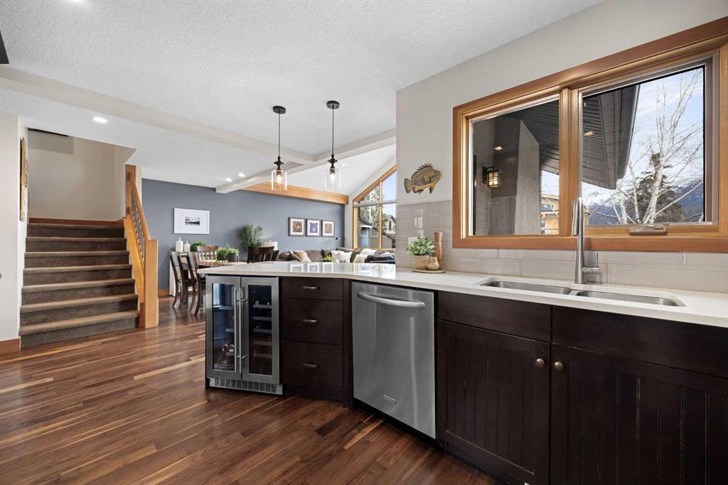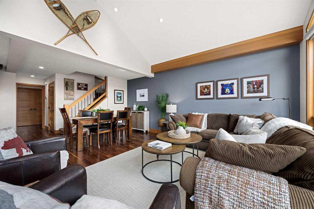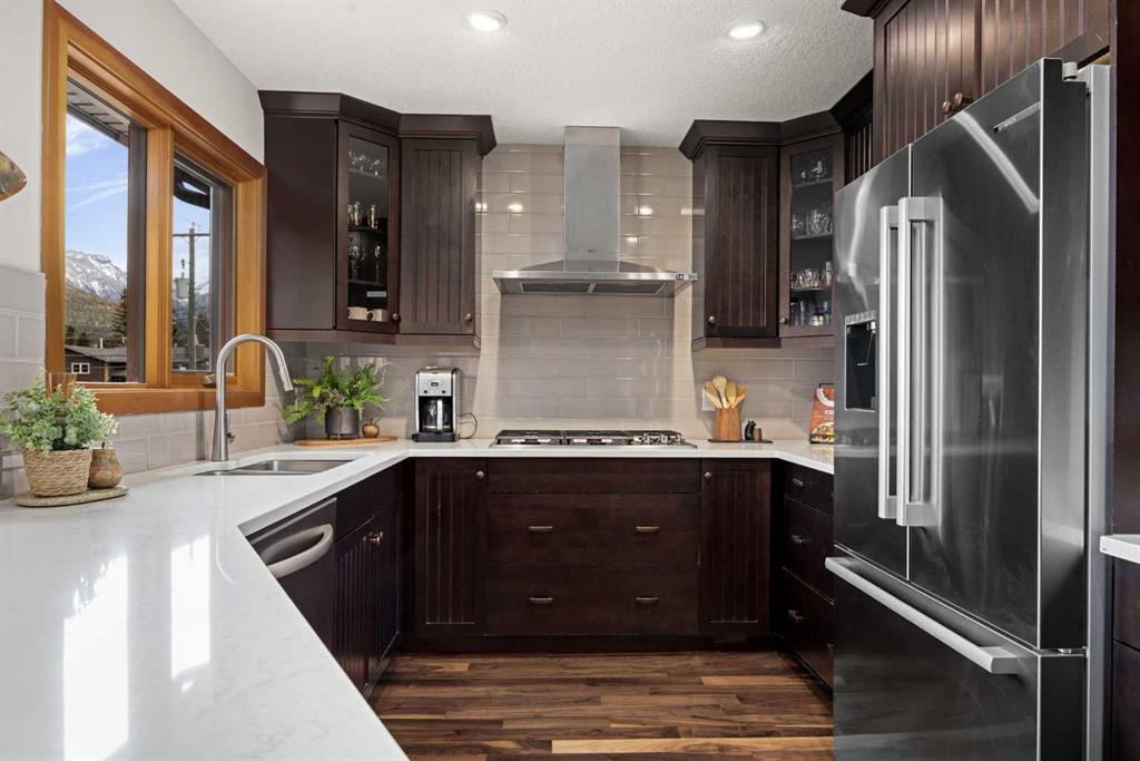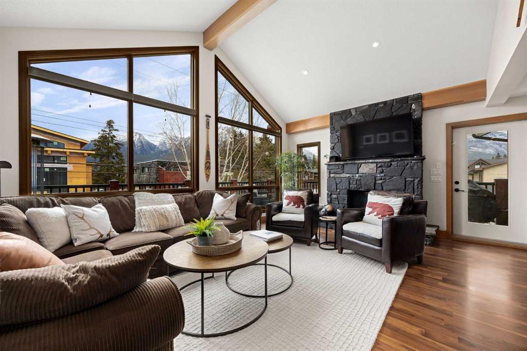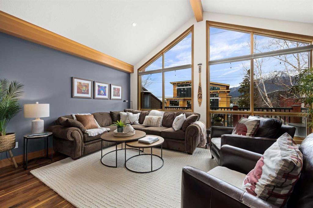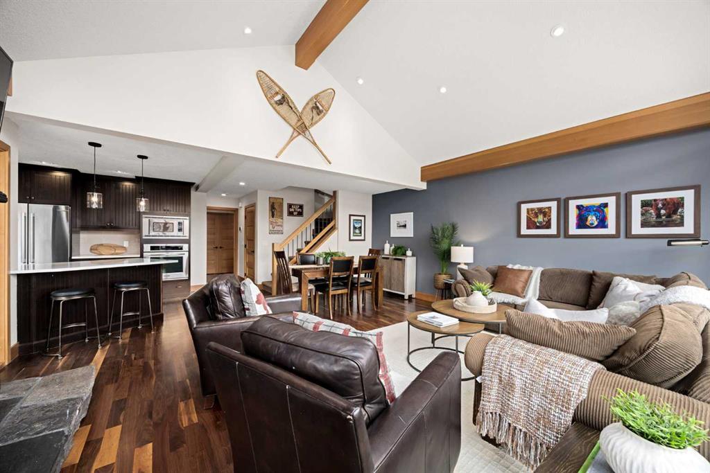 If you've been searching for the idyllic Canmore vacation property or a full-time mountain home that truly has it all, your search ends here. Nestled in the heart of South Canmore just a short walk from Main Street and the river valley, this 3-bedroom, 4-bathroom townhome is one of the finest examples of mountain residential craftsmanship you will find in the Bow Valley. Masterfully built by Fournier Construction, the interior is timeless and elegantly finished throughout. Rich Douglas Fir trim and doors, pristine Walnut hardwood floors, and a heated tile foyer set the tone from the moment you step inside. The dream living room commands your attention with soaring vaulted ceilings centered by a bold Rundle Stone fireplace, oversized view windows that frame the mountains in every direction, and a large wrap-around sundeck that invites you outside to take it all in. The kitchen is appointed with stainless steel appliances, a gas countertop range, and a built-in oven, bar fridge and wine bar, newly installed Quartz countertops, designed for those who love to cook and entertain. A convenient half bath rounds out the main level as well as a private master suite with ensuite. Upstairs, you will find two generous bedrooms each with their own ensuite, plus the added convenience of upper floor laundry. All bedrooms are complete with ensuites ensuring every guest has their own private retreat. With over 1,600 sq ft of meticulously maintained living space, a single car garage, and a spacious entryway, this property shows like new from top to bottom. You will not find a better maintained home in Canmore. Properties of this caliber, in this location, rarely come to market. Reasonable condo fees of $306/monthly and a healthy condo corporation round out your lifestyle investment in Canmore.