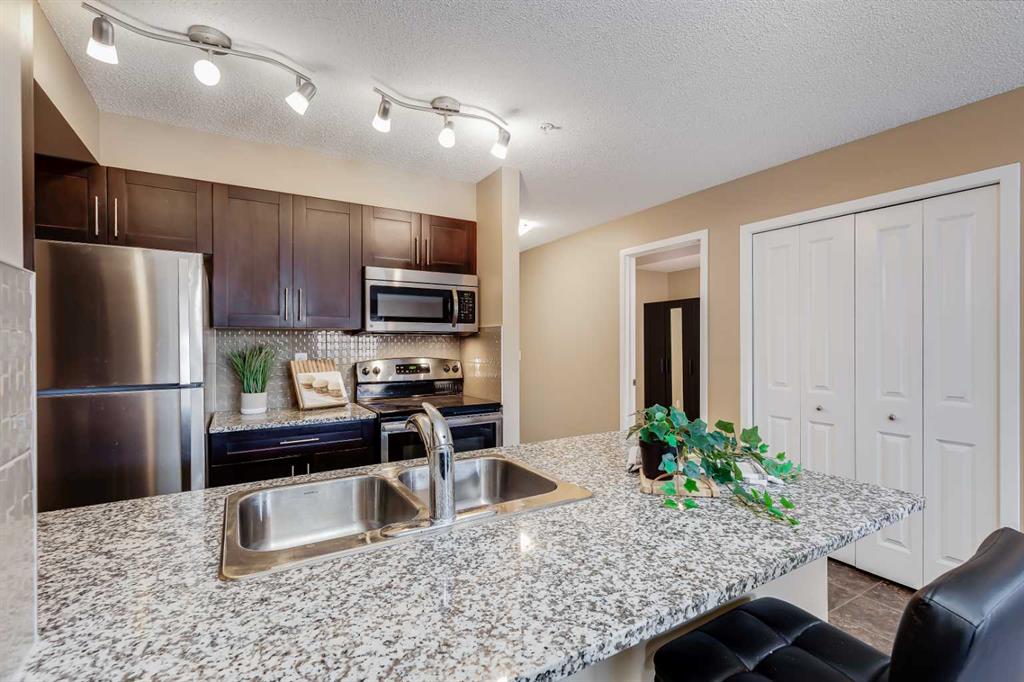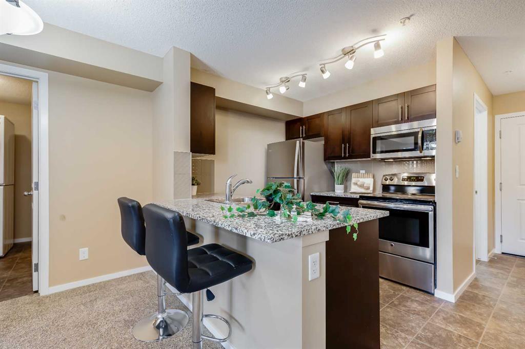 This well-appointed main floor condo offers over 950 square feet of thoughtfully designed living space, featuring three bedrooms and two full bathrooms. A spacious entryway welcomes you in, leading to an open-concept kitchen, dining, and living area that balances function and comfort. The kitchen stands out with granite countertops, stainless steel appliances, real wood cabinetry with soft-close doors, and a convenient breakfast bar for casual meals or entertaining. The living room provides a comfortable place to relax, with direct access to a large patio overlooking a quiet green space, an ideal setting to enjoy some fresh air or unwind at the end of the day. Positioned with neighbors on only one side and located close to the elevator, the unit offers a more private atmosphere along with easy access to the heated underground parkade. The primary bedroom is generously sized and features a walk-through closet leading to a private three-piece ensuite complete with an oversized shower. Two additional rooms offer flexibility for family, guests, or a dedicated home office. A full four-piece bathroom serves the secondary spaces, while the in-suite laundry and storage room add everyday practicality. This home includes a titled underground parking stall in a heated parkade, along with secure bicycle storage. Pet owners will appreciate that cats and dogs up to 15 kg are permitted with board approval. Situated in the established and growing community of Legacy, this location offers a strong balance of natural surroundings and urban convenience. Residents enjoy access to extensive walking paths, parks, playgrounds, and nearby environmental reserves, along with a variety of shops, restaurants, fitness options, and essential services just a short distance away. The area is also home to All Saints High School and a brand-new K–9 school opening in 2026, making it a practical choice for a range of lifestyles. Commuting is straightforward with quick connections to major routes including Macleod Trail and Stoney Trail, while public transit options are close by. Nearby destinations such as Fish Creek Park, Spruce Meadows, and the Bow River add to the appeal for those who enjoy outdoor activities, with the mountains within reasonable reach for weekend trips. Take advantage of your opportunity to see this incredible property in person, book your showing today! Be sure to check out the floor plans and 3D tour for a closer look before your visit.