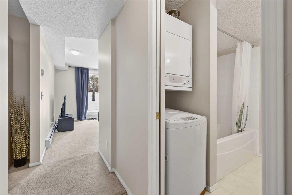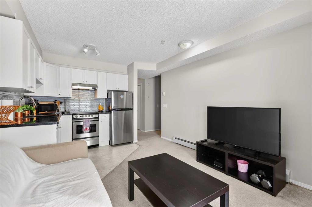 Welcome to this beautifully updated main floor unit in the well-maintained complex of Evergreen Pointe. Perfectly situated near golf courses, shopping, Fish Creek Park, and public transit, this home offers both convenience and an exceptional lifestyle. Thoughtfully designed, the open-concept layout maximizes every inch of living space. The fully renovated L-shaped kitchen is a standout feature, showcasing crisp white cabinetry, granite countertops, and sleek stainless steel appliances—perfect for both everyday living and entertaining. The bright and spacious living area flows seamlessly from the kitchen and provides direct access to a large south-facing patio, ideal for enjoying afternoon sun and outdoor relaxation. The unit is completed by a generously sized bedroom and a full 4-piece bathroom with the added convenience of in-suite laundry. Additional highlights include an assigned parking stall and ample visitor parking for guests. With low condo fees that include all essential utilities, including electricity. This home offers truly low-maintenance living. Move-in ready and waiting for you—just bring the key.