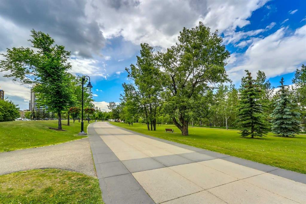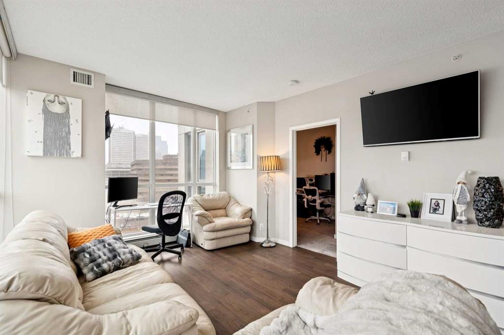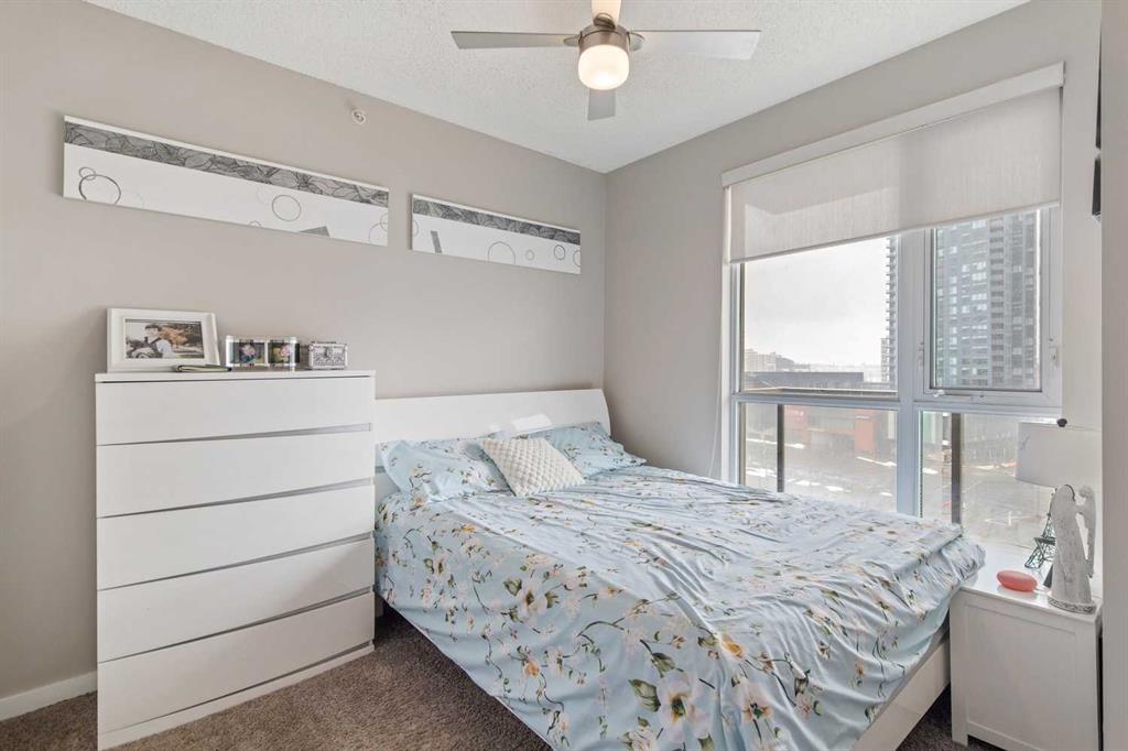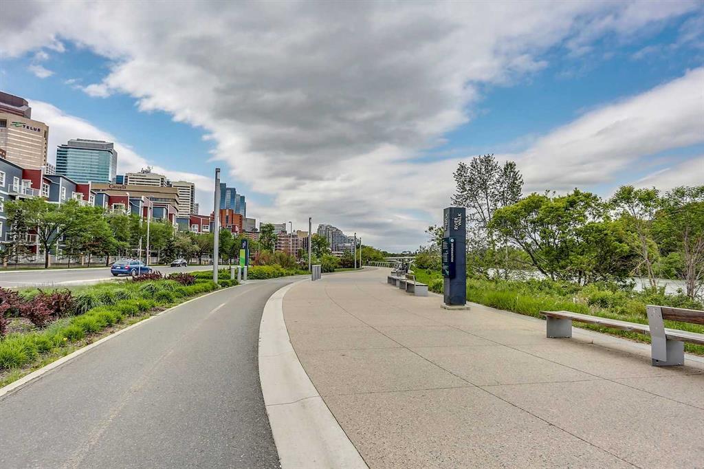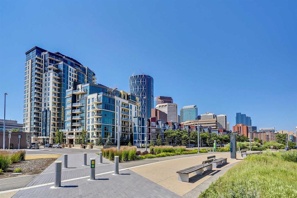 Welcome to Riverfront Pointe—where modern, sophisticated urban living meets everyday convenience in the heart of East Village, one of Calgary’s most vibrant and evolving communities. This thoughtfully designed 2BD/2BA condo offers an ideal layout for urban professionals, couples, or roommates seeking both comfort and flexibility. The MASTER BEDROOM features a full-size closet, 4-piece ensuite, and easily fits a king-sized bed, while the SECOND BEDROOM is generously sized with its own full bathroom—perfect for guests or shared living. FLOOR-TO-CEILING WINDOWS flood the space with natural light, enhancing the open-concept design. The kitchen features S/S APPLIANCES and flows seamlessly into the living and dining areas—ideal for entertaining or unwinding after a long day. Step outside to your expansive S/SW-FACING BALCONY, perfect for summer evenings and front-row views of the Stampede fireworks. A true standout is the RARE TITLED TANDEM PARKING STALL - FITS TWO FULL-SIZE VEHICLES - IN A HEATED, SECURED PARKADE—an exceptional find in a downtown location. Positioned above the third floor—where homes are typically quieter—THIS UNIT OFFERS A PEACEFUL ESCAPE from street-level noise, while still being steps from everything East Village has to offer. Enjoy 24-HOUR SECURITY, an ON-SITE GYM, and unbeatable access to the Bow River pathways, Superstore, Shoppers Drug Mart, Winners, and countless dining and lifestyle amenities. With the NEW EVENT CENTRE AND ENTERTAINMENT DISTRICT just a few blocks away, East Village continues to evolve—making this not only a home, but a smart investment in location and lifestyle. Set on a quiet cul-de-sac with ample visitor parking and pet-friendly (with board approval), this building offers both comfort and convenience. Units with this combination of layout, location, and titled tandem parking rarely come available—don’t miss this opportunity. Call your favourite realtor and book a private showing today!