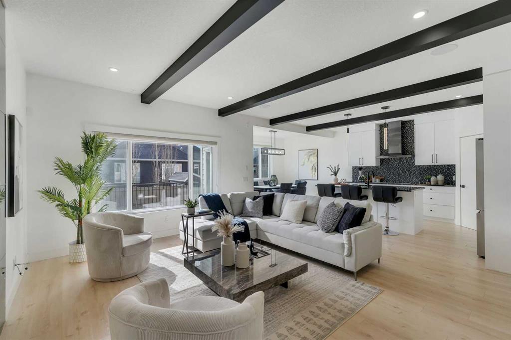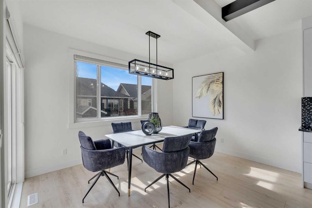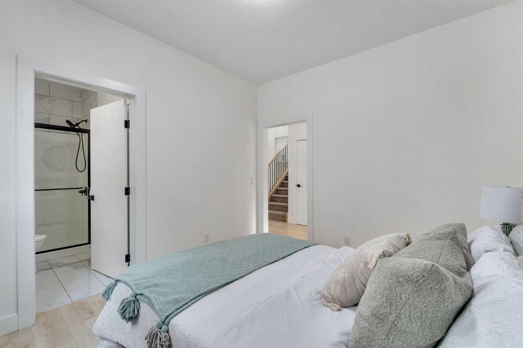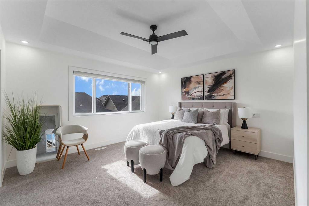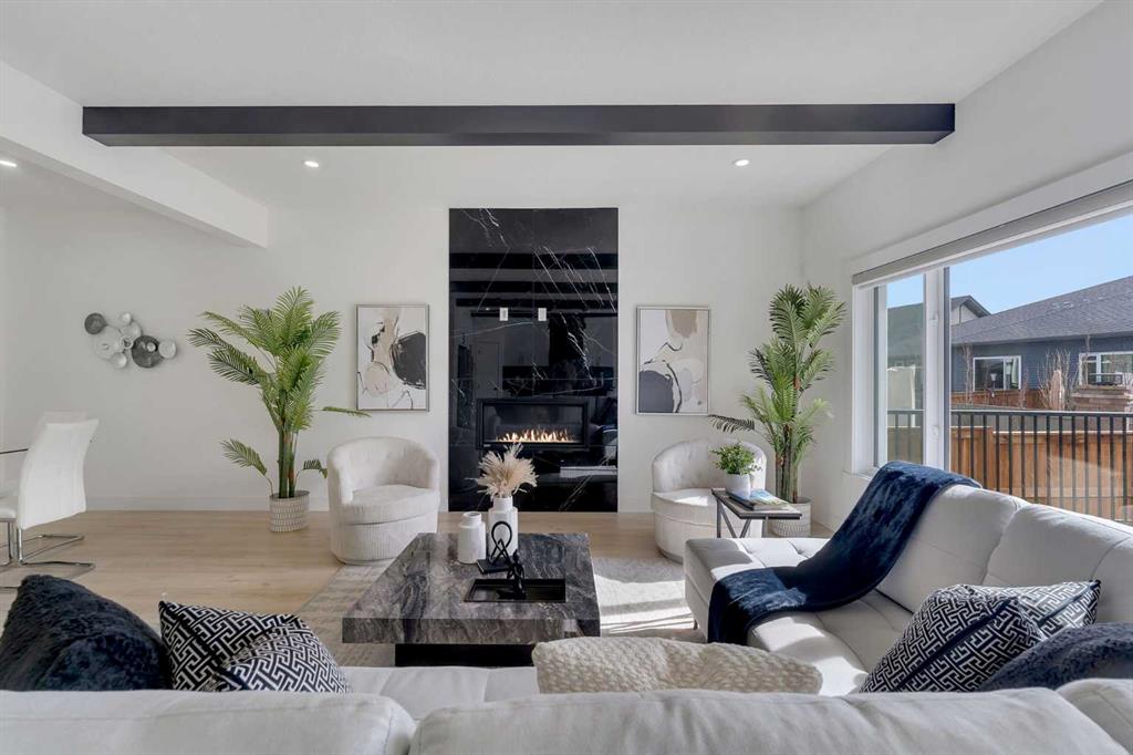 Welcome to this stunning luxury home located in the highly sought-after community of Coopers Crossing. Offering approximately 2,637 sq. ft. of thoughtfully designed living space, this elegant two-storey residence perfectly combines modern upgrades with timeless style. This home features 5 spacious bedrooms and 4 full bathrooms, ideal for growing families or multi-generational living. The main floor boasts a bright and open layout, complete with two dining areas, a full bedroom, and a 3-piece bathroom with a standing shower. The grand double-door entrance creates a welcoming first impression. The chef-inspired kitchen is beautifully upgraded with built-in appliances, a chimney-style hood fan, ceiling-height cabinetry, and sleek black hardware throughout. The living room showcases a striking feature fireplace with bold black tile detailing, adding warmth and sophistication. Large windows across the main floor allow for an abundance of natural light, while the elegant spindle railing enhances the overall design. Upstairs, you will find 4 generously sized bedrooms and 3 full bathrooms, along with a spacious bonus/family room featuring a vaulted ceiling—perfect for relaxation or entertainment. The primary bedroom offers a tray ceiling, a luxurious 5-piece ensuite with a jetted tub, separate glass shower, and a large walk-in closet. The upper-level laundry room is equipped with a sink and additional storage for convenience. All secondary bedrooms are well-proportioned, with access to two additional full bathrooms. Step outside to enjoy a large rear deck and fully fenced backyard—ideal for outdoor living. A side entrance to the basement provides excellent potential for future development. The home is further enhanced with durable and premium James Hardie (Hardie Board) exterior siding and features a Double wide car garage, offering extended parking space or additional storage flexibility. Conveniently located close to schools, parks, playgrounds, and shopping plazas, this home delivers exceptional value in one of Airdrie’s most prestigious neighbourhoods. Don’t miss this incredible opportunity to own a premium home in Coopers Crossing.