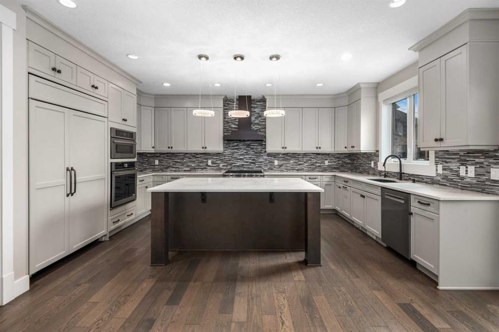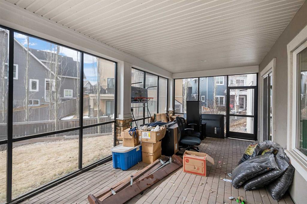 One of the best designed homes in Rocky Ridge! Built by Crystal Creek, this custom designed home has a complete floor plan that provides the large family with most everything that you need! Quality finishing detail is provided throughout this home, a 2 Storey, 8 Bedroom (not a typo) 5 Bathroom Design with a Total of 5,051 sq ft Developed! Fully Finished Walkout basement, with a Quad attached garage (a triple front with a tandem parking bay). The 1,557 sq ft main level features a front bedroom, full bathroom with a stand up shower, ideal for parents, large living room with gas fireplace and built in shelving, open dining area, and gourmet kitchen with panel Sub Zero Fridge and Freezer, Wolf Gas Cooktop Stove, Jenn Air built in oven and microwave oven, and built in dishwasher. Also a central office/study room, ideal for a homework station! A portion of the walkout deck is enclosed with a Sunroom off the dining area to enjoy the westerly views from. The 1,973 sq ft upper level has a front Bonus Room, and a total of 5 bedrooms. The primary bedroom features a Tray Ceiling design, and it's own Upper Balcony! The ensuite spa has a relaxing steam shower with sitting bench, large jetted tub, double vanity counter, and enclosed toilet. There is a Junior Master Bedroom with a full ensuite bathroom, and an upper floor laundry room. The 1,521 sq ft lower walkout level has 2 bedrooms, one currently has a rubber mat flooring for a gym setup, full bathroom, huge L-shaped wet bar with bar fridge installed, and an open rec room area. The walkout patio level is screened. The SW backyard is fenced and landscaped, and there is in ground sprinklers. There are two furnaces, and Central Air is installed for the upper floor. Quality Finishing throughout, as you have come to expect from Crystal Creek. Spacious, luxurious, and well designed! And a quick possession! Be sure to book your showing soon!