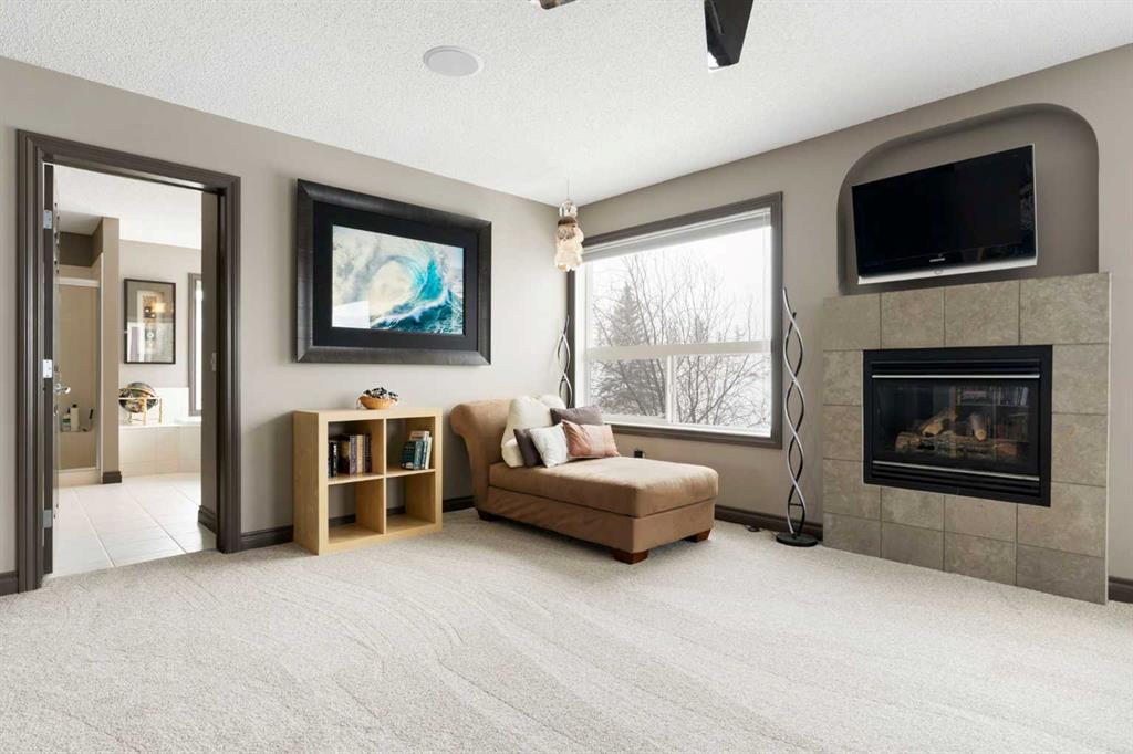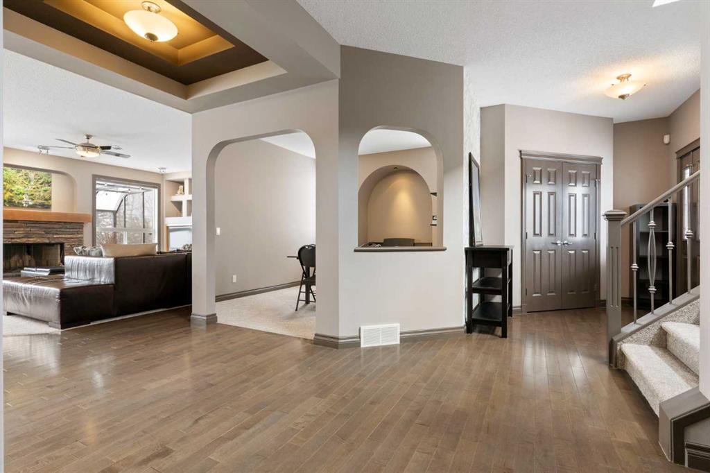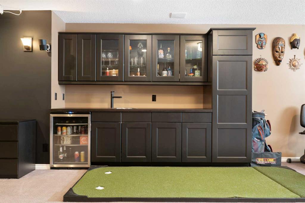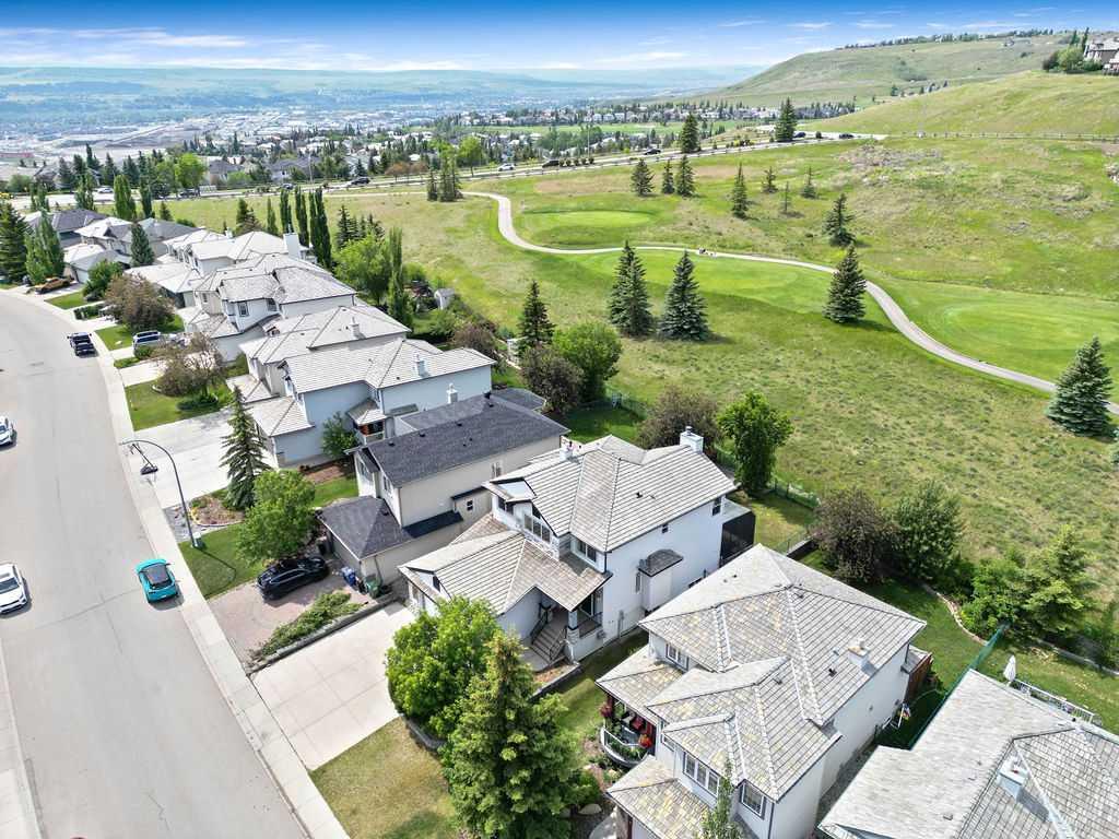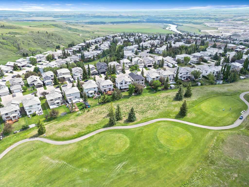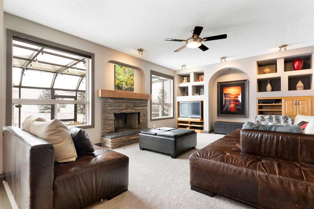 Welcome home to this beautifully designed, 3600+ sqft executive home with a 400+ sqft 3-season outdoor screen room, backing onto the 11th tee box of GlenEagles Golf Course. This home is perfectly positioned to enjoy tranquil views without the worry of stray balls in your back yard—zero in 20 years! Flooded with natural light, this home offers refined character blended with function, ideal for a growing family. Main highlights include hardwood floors, new plush carpet throughout the upper and main floor, charming archways, a wood-burning fireplace with gas lighter in the living room and a gourmet kitchen. Custom millwork cabinets and built-ins enhance both the living room and kitchen, which features a smart ‘triangle’ work flow of stainless steel gas stove, refrigerator with ice/water hookup and sink in the island. The kitchen also features premium quartz countertops with a slate backsplash, a corner pantry, Vacuflo floor sweeper, and extended sideboard with a built-in desk. A versatile flex room off the kitchen is perfect for a formal dining room, home office, or playroom. The patio doors off the dining nook feature a built-in pet door and opens to a fully screened-in large deck that spans the rear of the home, complete with a light-diffusing waterproof ceiling, built-in speakers, gas BBQ hookup, and secure pet access to the yard. The expansive screened in deck truly expands the main floor living space to the outdoors, enabling full enjoyment of the natural beauty surrounding this home and even allowing for BBQing in the rain. The backyard also offers a built in stone patio with a firepit and plenty of private greenspace for the kids or pets. The oversized double garage includes extra storage and a triple-wide driveway, so this home offers 5 private parking spaces (room for two inside & three out front!) The upper level offers a spacious primary suite across the back of the home and features a cozy gas fireplace, built-in speakers, and incredible golf course views. The spa-inspired ensuite is your private sanctuary, featuring a corner jetted tub, standalone shower, private lavatory, and a generous walk-in closet. The upstairs also offers 2 additional bedrooms which are equitably-sized, a stylish 4-piece main bath, a separate laundry room and ample closet space. Downstairs, the fully developed basement offers a large family / rec room for family movie or game nights, with a wine shelf and wet bar for effortless entertaining. There is a 5 piece bathroom and an enclosed room with french doors and an egress window that would be perfect as a guest bedroom suite, hobby space or a space to set up your home gym. This neighbourhood features walking paths with stunning, expansive views of the river valley and the Rocky mountains, playgrounds and easy access into Cochrane, or east on Hwy 1A to the City of Calgary. Don't miss the chance to make this one-of-a-kind golf course retreat, the backdrop to your family’s next chapter. It’s more than a home... it’s a lifestyle!