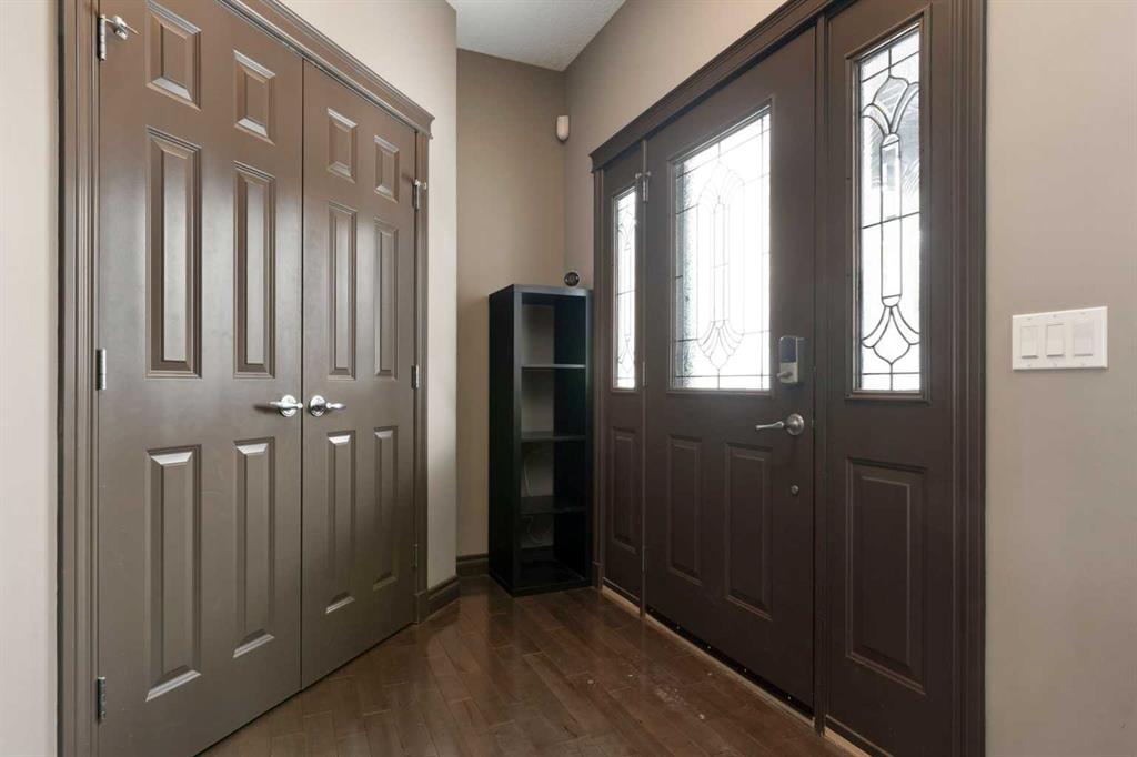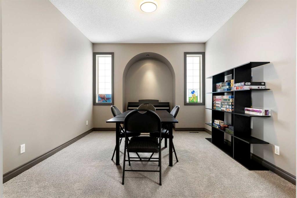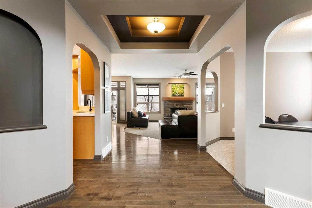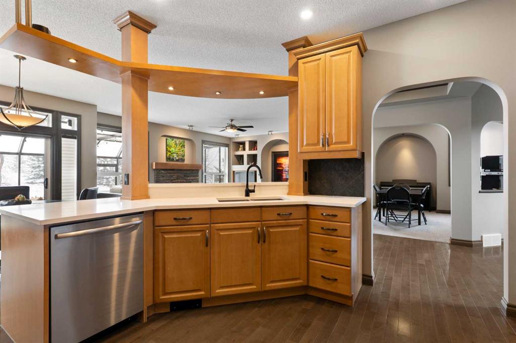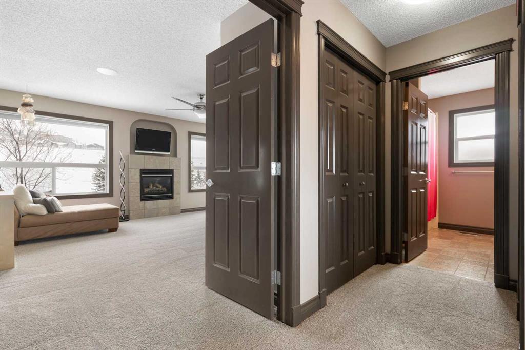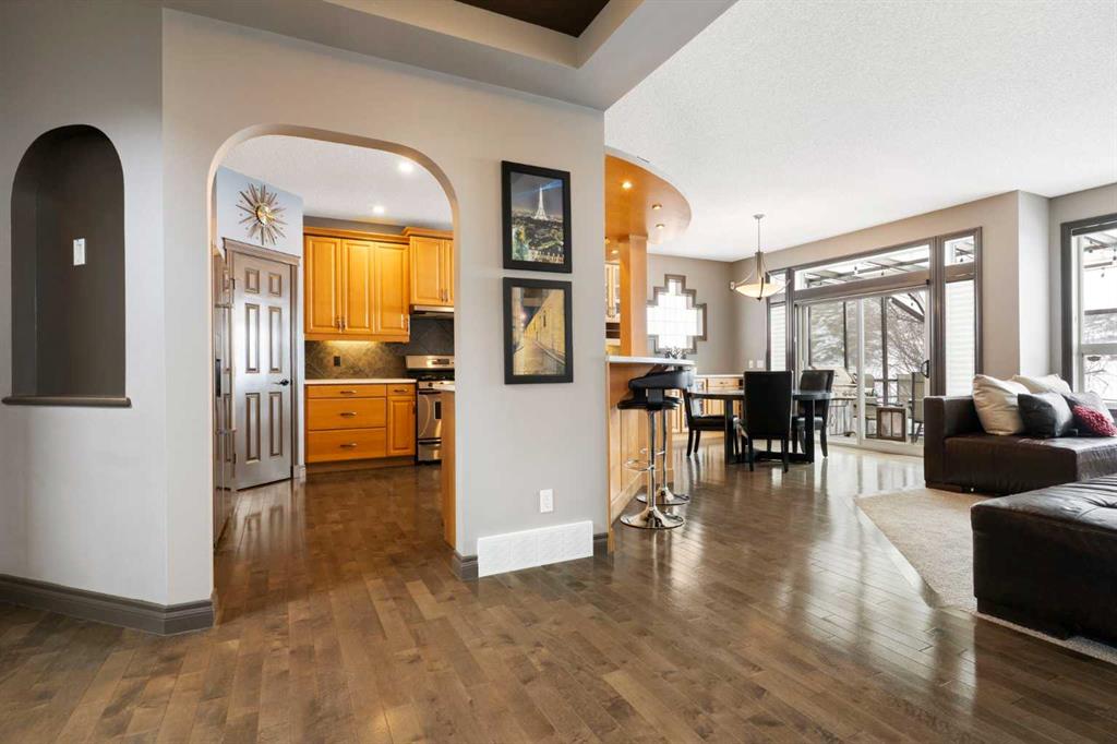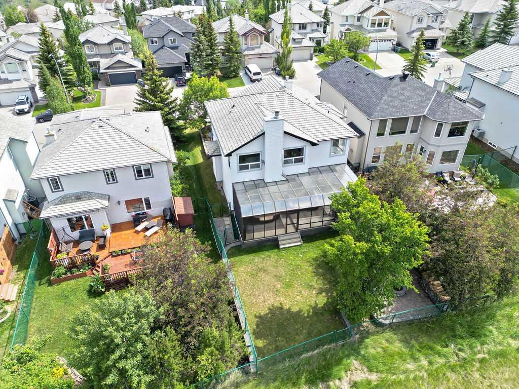 Welcome home to this beautifully designed, 3600+ sqft executive home with a 400+ sqft 3-season outdoor screen room, backing onto the 11th tee box of GlenEagles Golf Course. This home is perfectly positioned to enjoy tranquil views without the worry of stray balls in your back yard—zero in 20 years! Flooded with natural light, this home offers refined character blended with function, ideal for a growing family. Main highlights include hardwood floors, new plush carpet throughout the upper and main floor, charming archways, a wood-burning fireplace with gas lighter in the living room and a gourmet kitchen. Custom millwork cabinets and built-ins enhance both the living room and kitchen, which features a smart ‘triangle’ work flow of stainless steel gas stove, refrigerator with ice/water hookup and sink in the island. The kitchen also features premium quartz countertops with a slate backsplash, a corner pantry, Vacuflo floor sweeper, and extended sideboard with a built-in desk. A versatile flex room off the kitchen is perfect for a formal dining room, home office, or playroom. The patio doors off the dining nook feature a built-in pet door and opens to a fully screened-in large deck that spans the rear of the home, complete with a light-diffusing waterproof ceiling, built-in speakers, gas BBQ hookup, and secure pet access to the yard. The expansive screened in deck truly expands the main floor living space to the outdoors, enabling full enjoyment of the natural beauty surrounding this home and even allowing for BBQing in the rain. The backyard also offers a built in stone patio with a firepit and plenty of private greenspace for the kids or pets. The oversized double garage includes extra storage and a triple-wide driveway, so this home offers 5 private parking spaces (room for two inside & three out front!) The upper level offers a spacious primary suite across the back of the home and features a cozy gas fireplace, built-in speakers, and incredible golf course views. The spa-inspired ensuite is your private sanctuary, featuring a corner jetted tub, standalone shower, private lavatory, and a generous walk-in closet. The upstairs also offers 2 additional bedrooms which are equitably-sized, a stylish 4-piece main bath, a separate laundry room and ample closet space. Downstairs, the fully developed basement offers a large family / rec room for family movie or game nights, with a wine shelf and wet bar for effortless entertaining. There is a 5 piece bathroom and an enclosed room with french doors and an egress window that would be perfect as a guest bedroom suite, hobby space or a space to set up your home gym. This neighbourhood features walking paths with stunning, expansive views of the river valley and the Rocky mountains, playgrounds and easy access into Cochrane, or east on Hwy 1A to the City of Calgary. Don't miss the chance to make this one-of-a-kind golf course retreat, the backdrop to your family’s next chapter. It’s more than a home... it’s a lifestyle!
