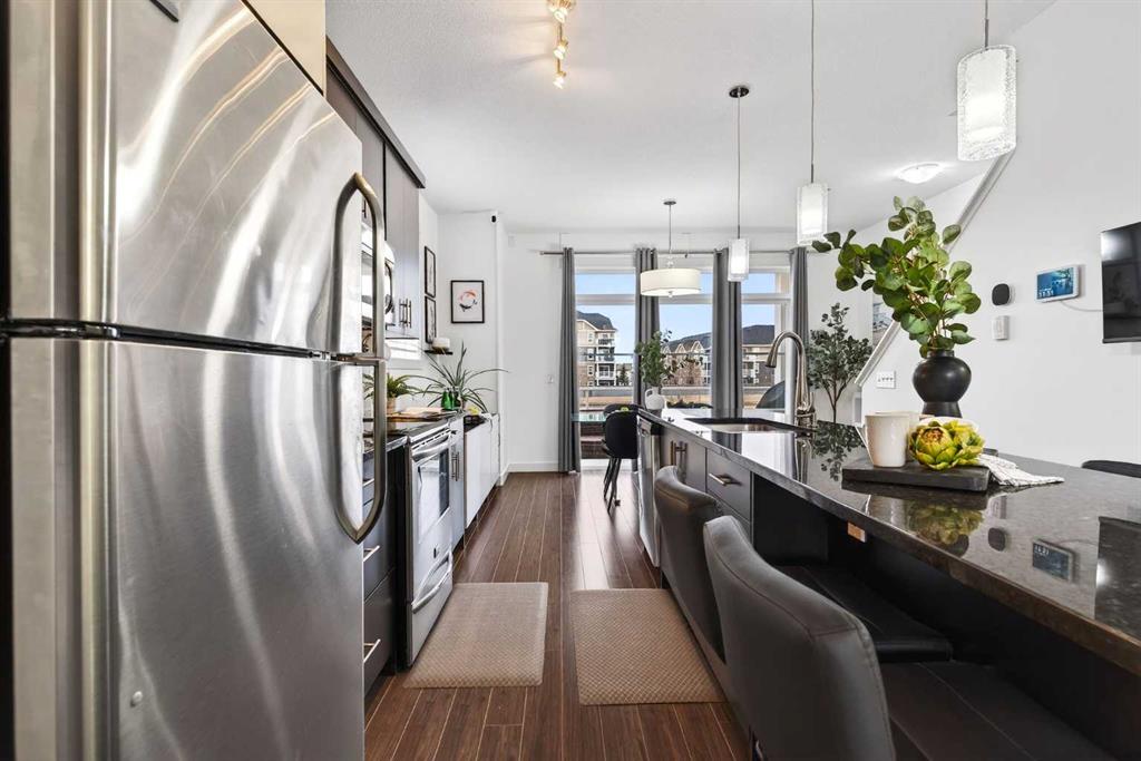 SHOW HOME upgrades - END-UNIT 1,380 sq. ft., this bright townhouse in Redstone features 2 bedrooms, 2.5 bathrooms, with unobstructed Mountain VIEWS off the dining room balcony & master bedroom, a main-level office/den/gym/ flex room, and an extra-large single attached garage. Enjoy bright sunshine throughout the entire home, the large windows in the primary bedroom. Added privacy bonus: NO neighbours directly facing your front door. The ground level welcomes you with a spacious front entry and a versatile office/den or recreation space, along with a convenient 2-piece bathroom, an oversized attached heated garage with ample storage, built in desk & shelves, and enough room for a workbench. Upstairs, laminate flooring flows through the open-concept main level. The kitchen offers dark cabinetry, stainless steel appliances, and an extra-large island (ideal for casual seating and hosting), opening to a family-sized dining area with patio doors to the generous balcony with gas line for BBQ—perfect for morning coffee with the views. The living room is anchored by a custom built feature wall/wall unit, creating a stylish and functional gathering space. The upper level includes a primary bedroom with mountain views, a 4-piece ensuite, and double closets, plus a second spacious bedroom, walk in closet and another 4-piece bathroom. A dedicated laundry and storage room completes the layout. Close to parks, pathways, schools, transit, and major routes for commuting, this Redstone home delivers space, light, privacy, and views. Call for viewing.