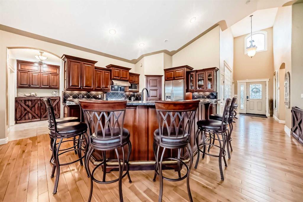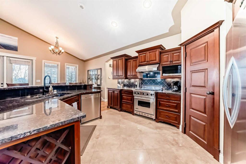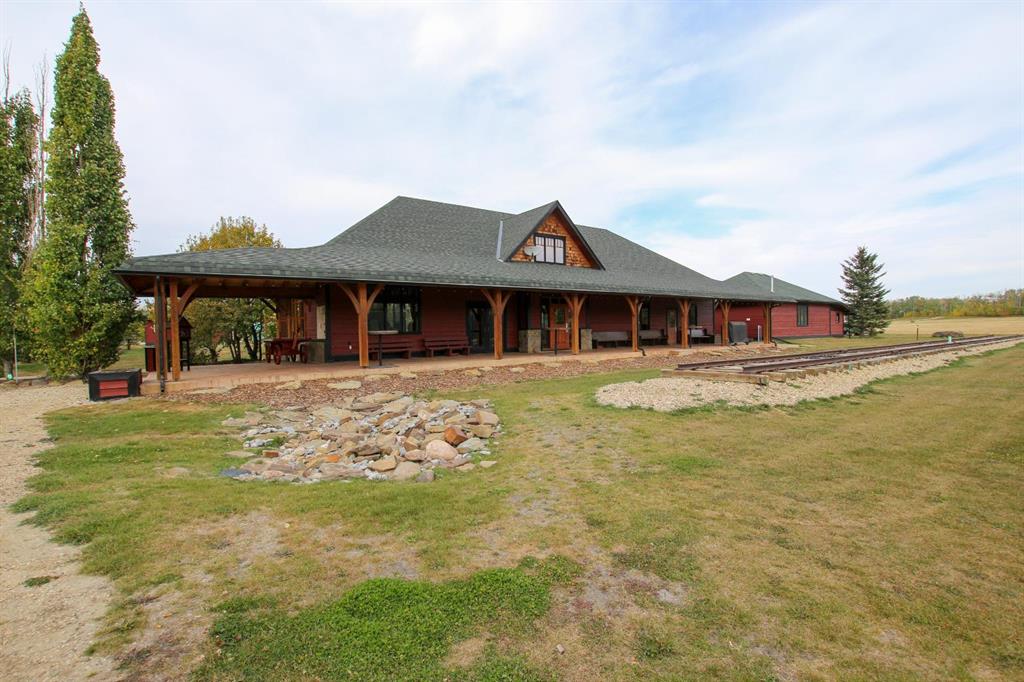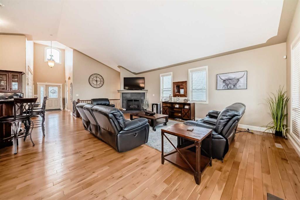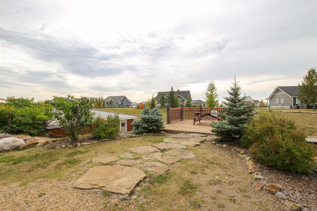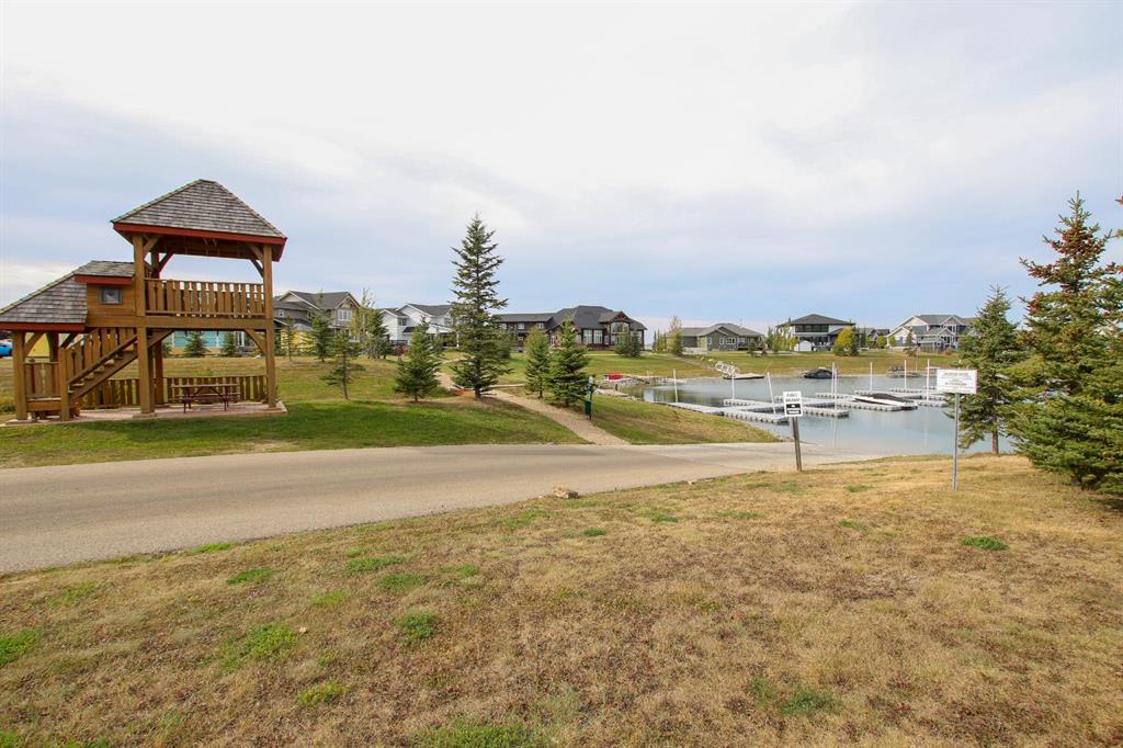 FULLY DEVELOPED 5 BEDROOM, 3 BATHROOM WALKOUT BUNGALOW IN MERIDIAN BEACH ~ LARGE SOUTH FACING BACKYARD WITH MATURE TREES & BACKING ONTO CANAL ~ LOADED WITH UPGRADES THROUGHOUT ~ Covered front entry and a stone accented exterior welcome you to this well cared for home ~ Bright and spacious foyer with high ceilings and tile flooring lead to the open concept main living space with hardwood flooring, soaring vaulted ceilings and tons of floor to ceiling windows that fill the space with natural light ~ The living room features a cozy fireplace and great views ~ The stunning custom kitchen offers an abundance of dark stained cabinets with crown moulding, large drawers and glass fronts; tons of granite space including an island with a raised eating bar; full tile backsplash; upgraded stainless steel appliances; and a large pantry ~ easily host large gatherings in the dining room with patio door access to the covered deck with canal views ~ The oversized primary bedroom can easily accommodate a king size bed plus multiple pieces of furniture or a sitting area, has a garden door to the deck, a spa like ensuite with a corner tub, and a spacious walk in closet ~ Two additional main floor bedrooms are both a generous size with ample closet space ~ 4 piece main bathroom has a tile tub surround, transom window, and granite topped vanity ~ The fully finished walkout basement offers large above grade windows, high ceilings and operational in floor heat ~ Huge family/media room opens to a recreation room with a bar, space for a games table, and garden door access to the covered patio and backyard ~ 2 generous size bedrooms share a 4 piece bathroom ~ Large laundry room plus ample space for storage ~ Heated double attached garage is insulated, finished with painted drywall, has high ceilings and two overhead doors ~ Large paved driveway offers tons of additional parking with space for RV/boat parking ~ The fully fenced backyard is landscaped with mature trees, has a fire pit and direct access to a walking trail, spring fed canal and boat dock ~ Located in Meridian Beach, with two sandy beaches, nature trails, architecturally unique footbridges, community halls, tennis/pickle ball courts and pavilions with year round activities ~ Easy access to Rimbey, Ponoka, Lacombe and Gull Lake.