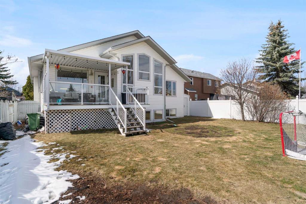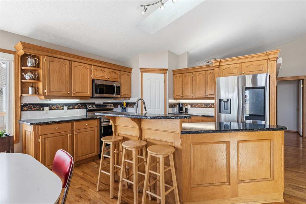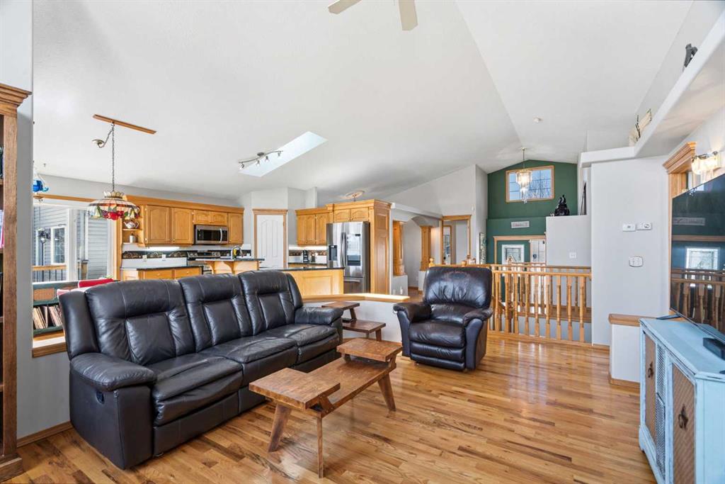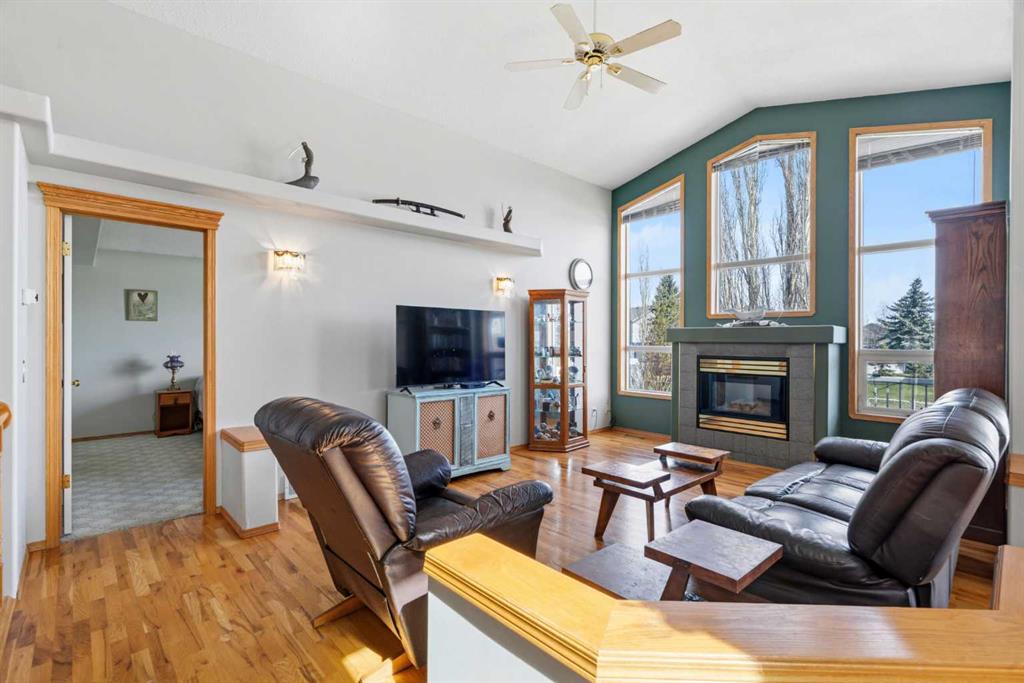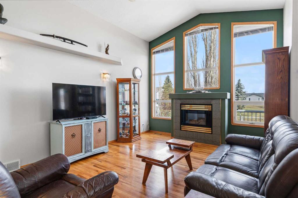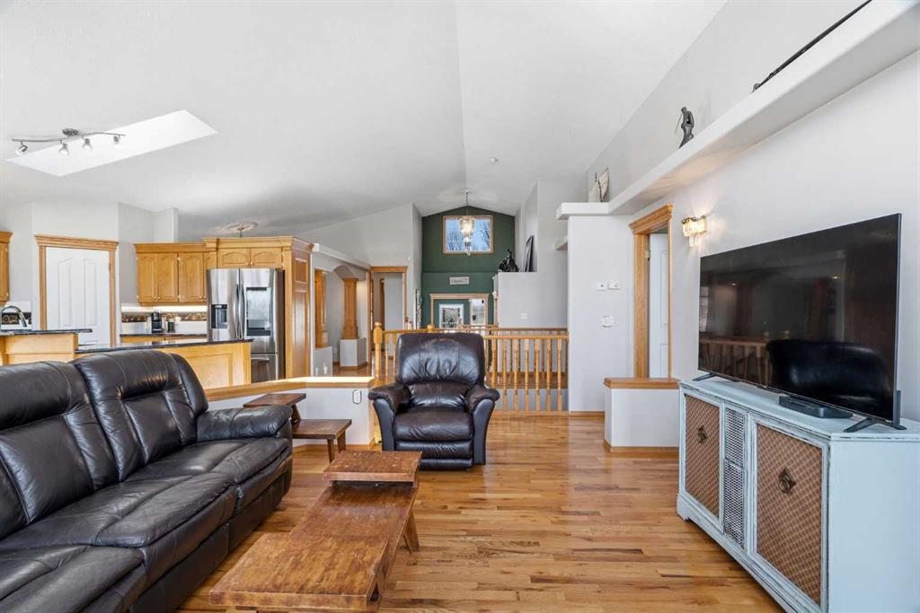 Welcome to this exceptional raised bungalow in the sought after community of Cambridge Glen in Strathmore, an ideal home for the discerning buyer seeking space, quality & a truly special setting. Backing directly onto a massive green space & park, this beautifully maintained & updated residence offers 1,482 sq. ft. above grade & 1,298 sq ft of professional development in the lower level, delivering outstanding functionality for families of all sizes. From the moment you arrive, the home’s curb appeal, featuring stone trim detail & an oversized, double-attached garage with direct interior access & thoughtful built-in storage, sets the tone for what lies within. Inside, the bright, open concept layout greets you, enhanced by soaring vaulted ceilings, new skylights, solid hardwood flooring & expansive windows that flood the home with natural light. The main floor is designed for both everyday comfort & elegant entertaining. A stunning great room features a cozy gas fireplace & a full wall of windows overlooking the park behind, while a formal dining room with artistic pillar detailing adds a touch of sophistication. The spacious kitchen is well appointed with granite countertops, newer stainless steel appliances, including a side-by-side fridge with front display, ample solid oak cabinetry, a central island with a raised eating bar, a corner walk-in pantry & an adjacent spacious nook area surrounded by windows. The primary suite is a true retreat, showcasing vaulted ceilings, a spacious walk-in closet & a luxurious 4 piece ensuite complete with a deep soaker tub, plus a separate shower & water closet area. A second main floor bedroom, also ideal as a home office, along with convenient main floor laundry enhances the home’s versatility. The raised bungalow design & oversized windows make the lower level incredibly bright & inviting, offering incredible additional living space. Here you’ll find three generous bedrooms, a large recreation and games area (perfect for a pool table or movie nights), a full 3-piece bathroom & abundant additional storage. Step outside to your private backyard oasis. The covered composite deck overlooks a beautifully landscaped, fully fenced yard that seamlessly extends into the expansive park / green space beyond, connecting you to many parks including Dinosaur Hill - an unbeatable setting for families, entertaining, or simply enjoying the outdoors. This home has been meticulously maintained & thoughtfully upgraded. Updates include new shingles (2025), fresh interior paint (2026), newer appliances, furnace serviced & air ducts cleaned(2025), water tank (2023), updated skylights (2023), removal of all Poly-B plumbing, central A/C, central vacuum & underground irrigation. With five bedrooms, 2.5 bathrooms, multiple living & entertaining spaces, plus a premium park location, this home offers an exceptional balance of luxury, practicality & lifestyle. Close to schools, pathways, recreation facilities, shopping, hospital, golf course