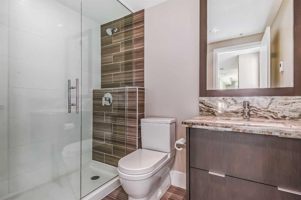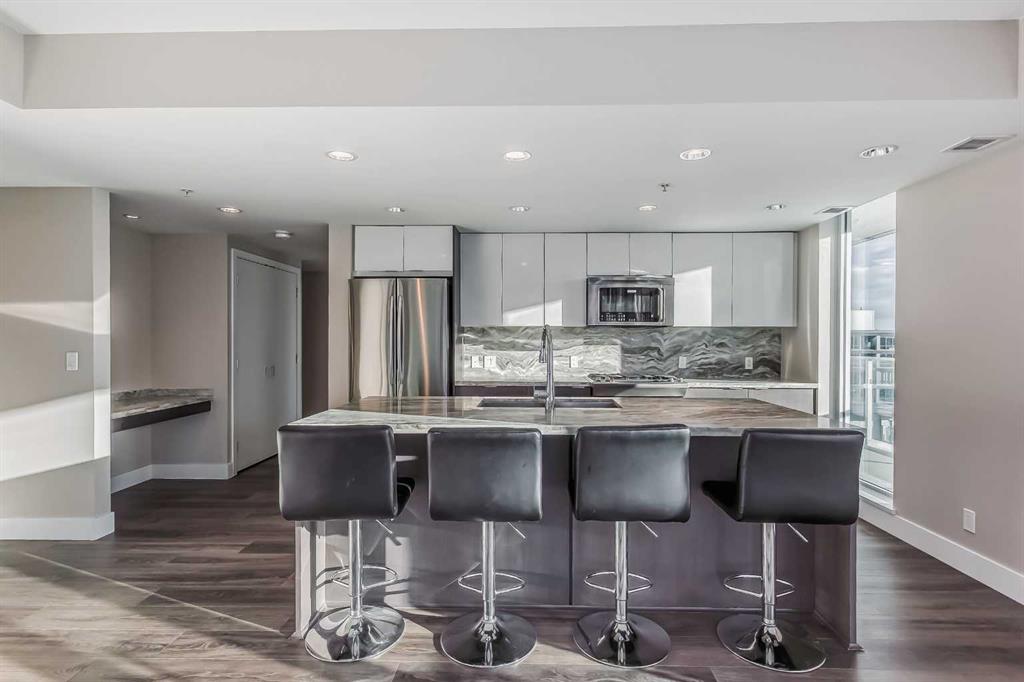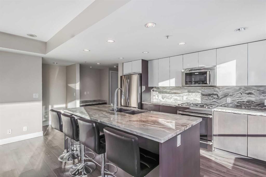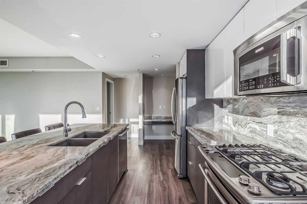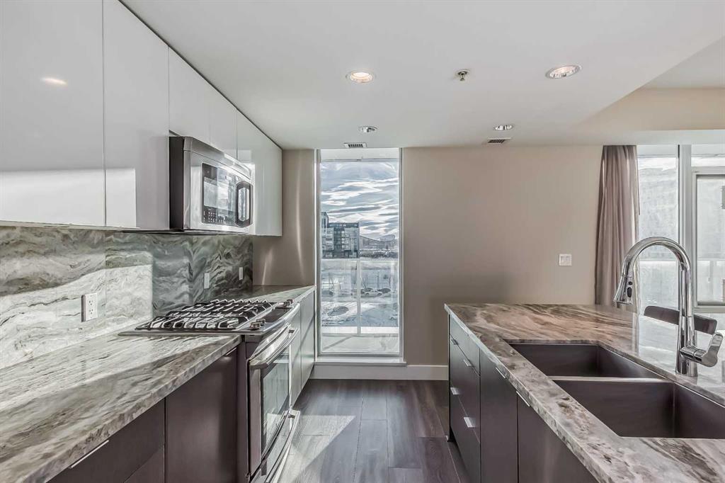 Welcome to Evolution in East Village, where elevated urban living meets exceptional design. This stunning 2 bedroom, 2 bathroom condo offers over 1000 sq ft of thoughtfully designed space, perfect for professionals, couples, or a small family seeking both comfort and lifestyle. The heart of the home is the sleek, modern kitchen featuring quartz countertops, a gas range, stainless steel appliances, and a large island—ideal for entertaining or casual everyday living. The open-concept layout flows seamlessly into a bright and spacious living area, framed by floor-to-ceiling windows that fill the space with natural light. One of the standout features of this home is the massive private balcony, offering an incredible extension of your living space. Whether you're hosting friends, enjoying a quiet morning coffee, or taking in the vibrant East Village views, this outdoor area is truly something special. The well-designed floor plan provides excellent bedroom separation for privacy. The primary suite features a walk-through closet and a private ensuite, while the second bedroom and full bath make this home ideal for guests, a home office, or a growing family. Additional highlights include in-suite laundry, central air conditioning, high-end finishes throughout, storage locker and underground parking. Residents of Evolution enjoy premium amenities including a fitness centre, sauna & steam room, concierge service, and a rooftop terrace with BBQs and panoramic city views. Book your private showing today! Located steps from the Bow River pathways, cafes, restaurants, Studio Bell, Superstore, and transit, this is your opportunity to own in one of Calgary’s most dynamic and walkable communities.