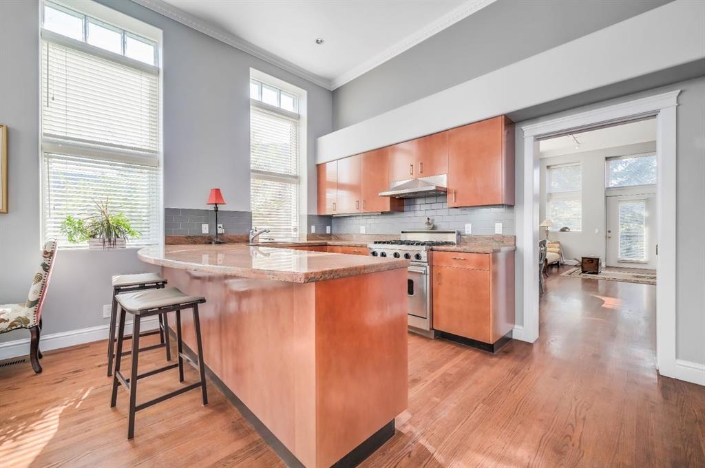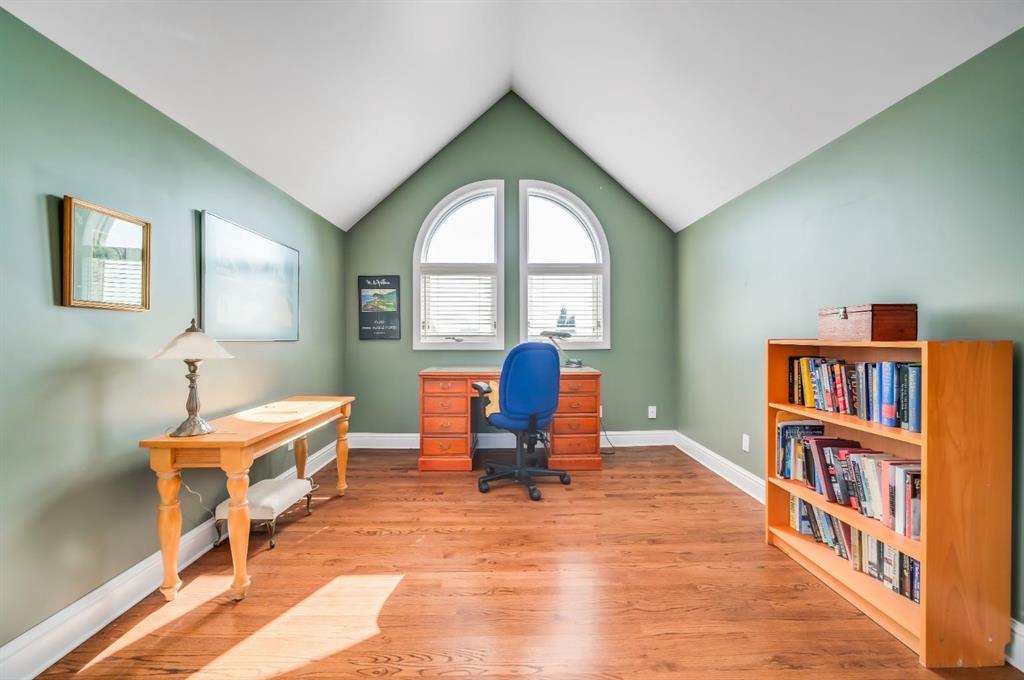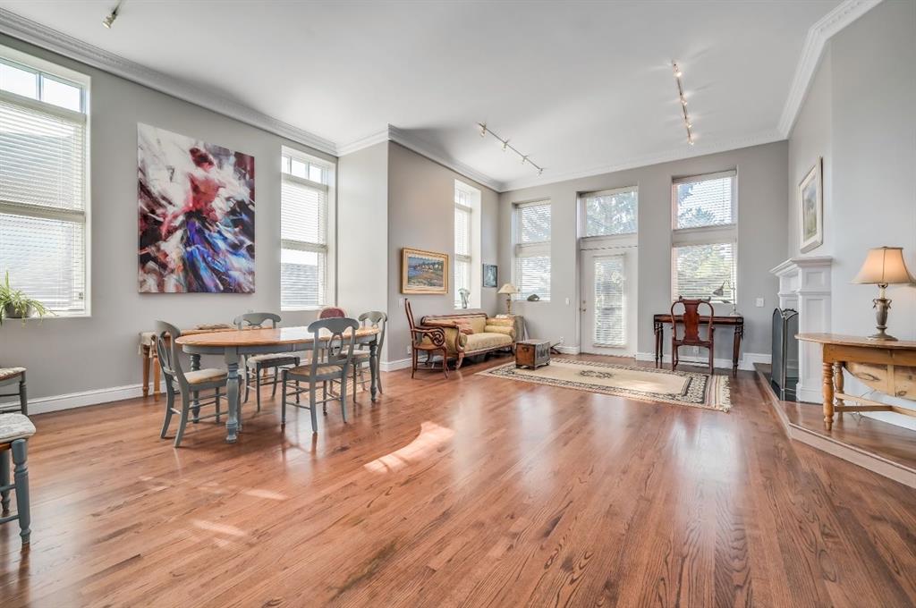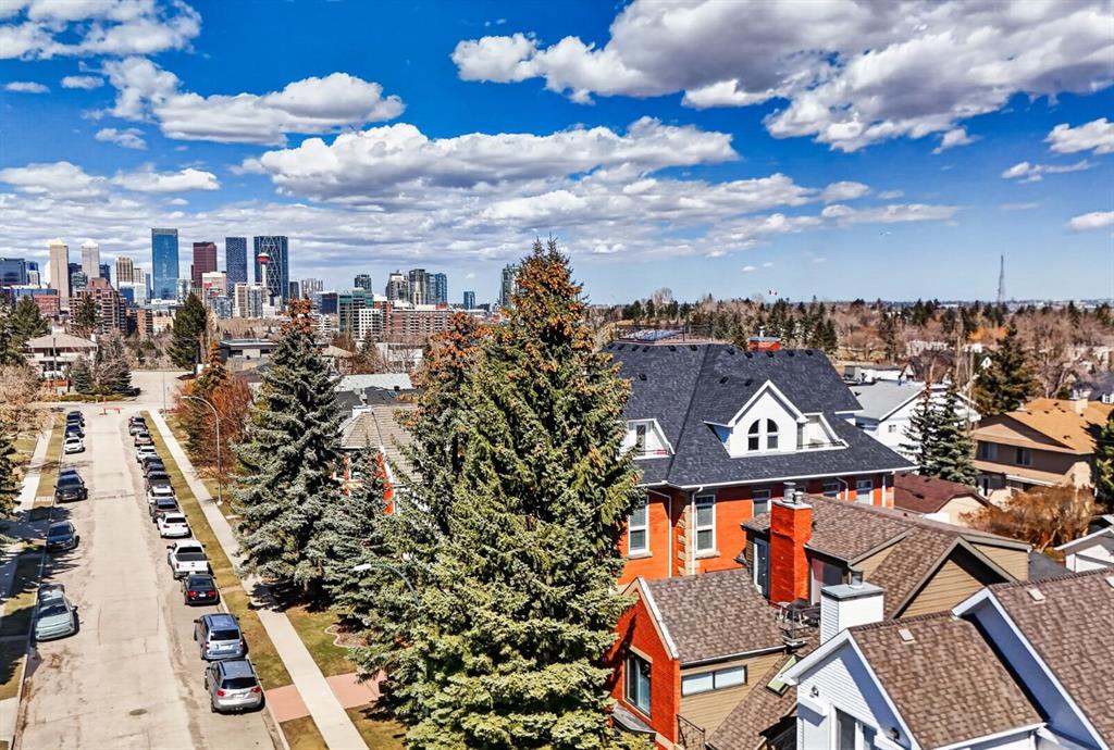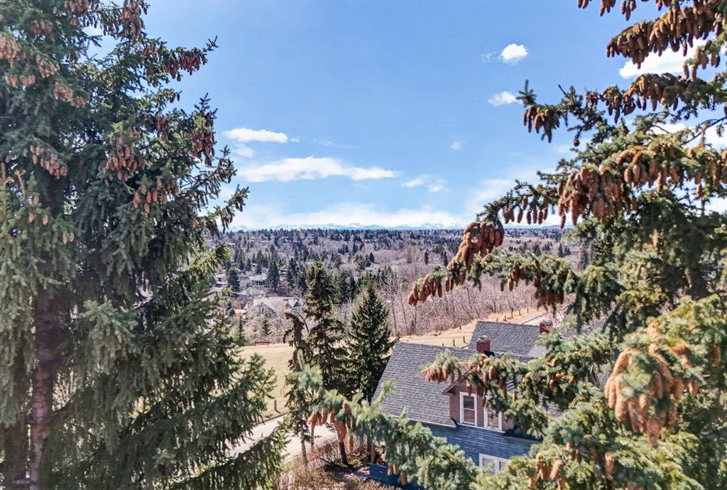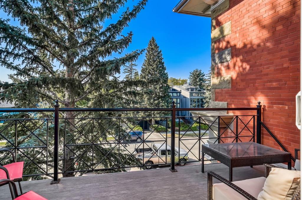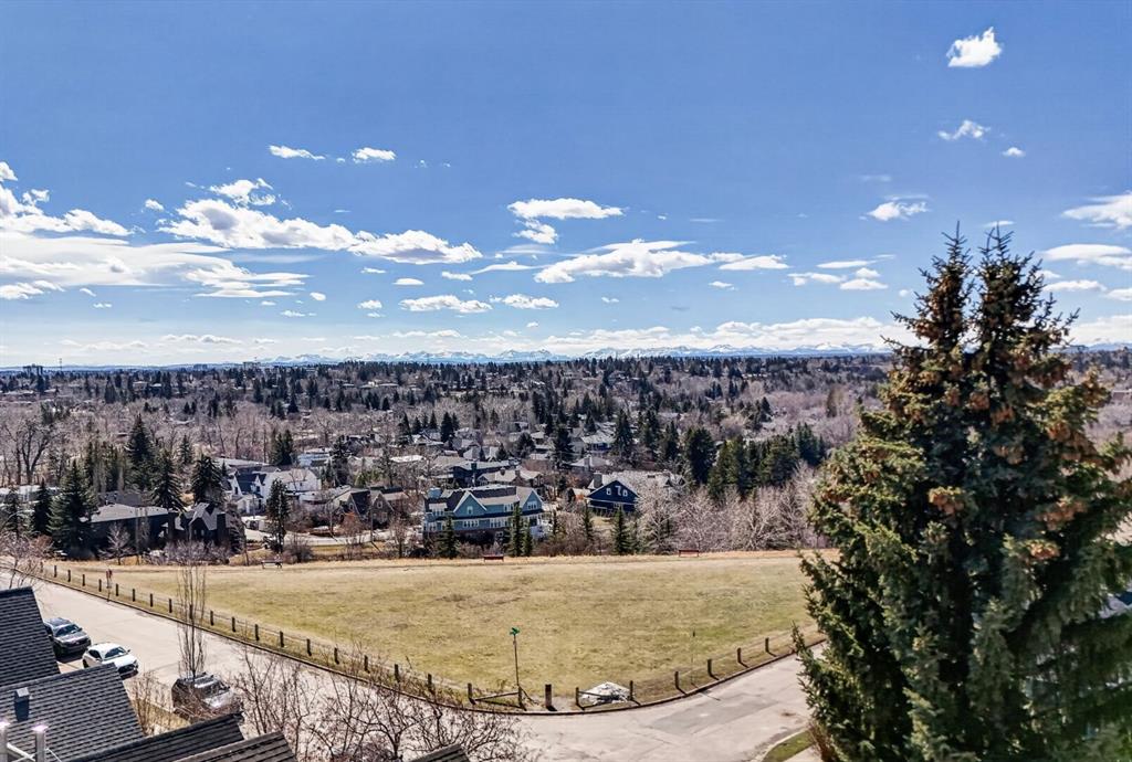 Welcome to the prestigious Parkhill School. Constructed with a distinctive blend of brick and sandstone, this cherished historic landmark was thoughtfully converted in 1993 into four exclusive residences. This top floor suite occupies the premier position in the building, offering three exposures (south, east, and west) and breathtaking panoramic views of the Elbow River valley and the Rocky Mountains. Designed over two expansive levels, this unique home features soaring 12 foot ceilings on the main floor, beautiful hardwood flooring, and an abundance of natural light through oversized windows, skylights, and French doors. The elegant living and dining areas open onto a spacious west facing balcony, while the sunlit kitchen and family room at the rear of the home flow out onto your private deck, perfect for morning coffee or evening entertaining. Upstairs, a stunning skylit staircase leads to two generously sized bedrooms, both with vaulted ceilings, private ensuite bathrooms, and individual balconies. The primary suite boasts an attached office that could easily be converted into a 3rd bedroom. Additional features include a common elevator, a private back entrance with mudroom and laundry/storage area, plus a rare double detached garage with a massive (over 400 sq/ft) rooftop deck ideal for taking in the serene surroundings. Situated in one of Calgary’s most desirable communities, this one of a kind home offers the perfect balance of heritage charm and contemporary sophistication.