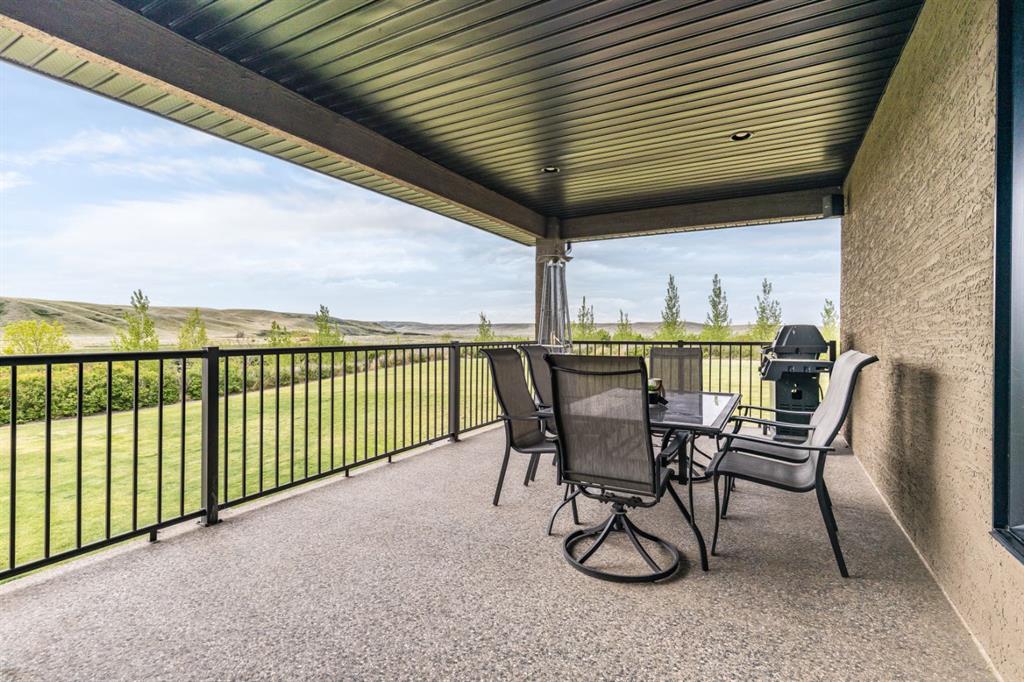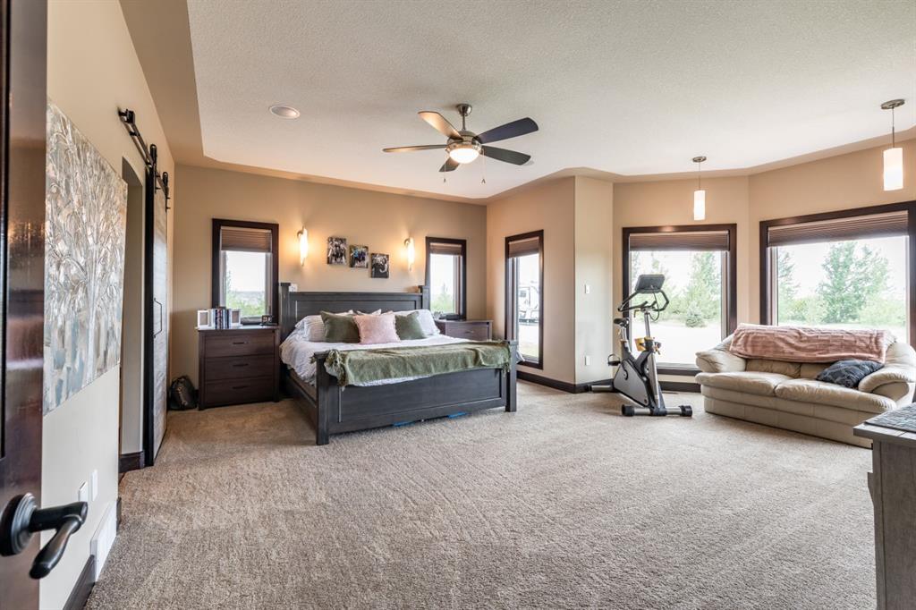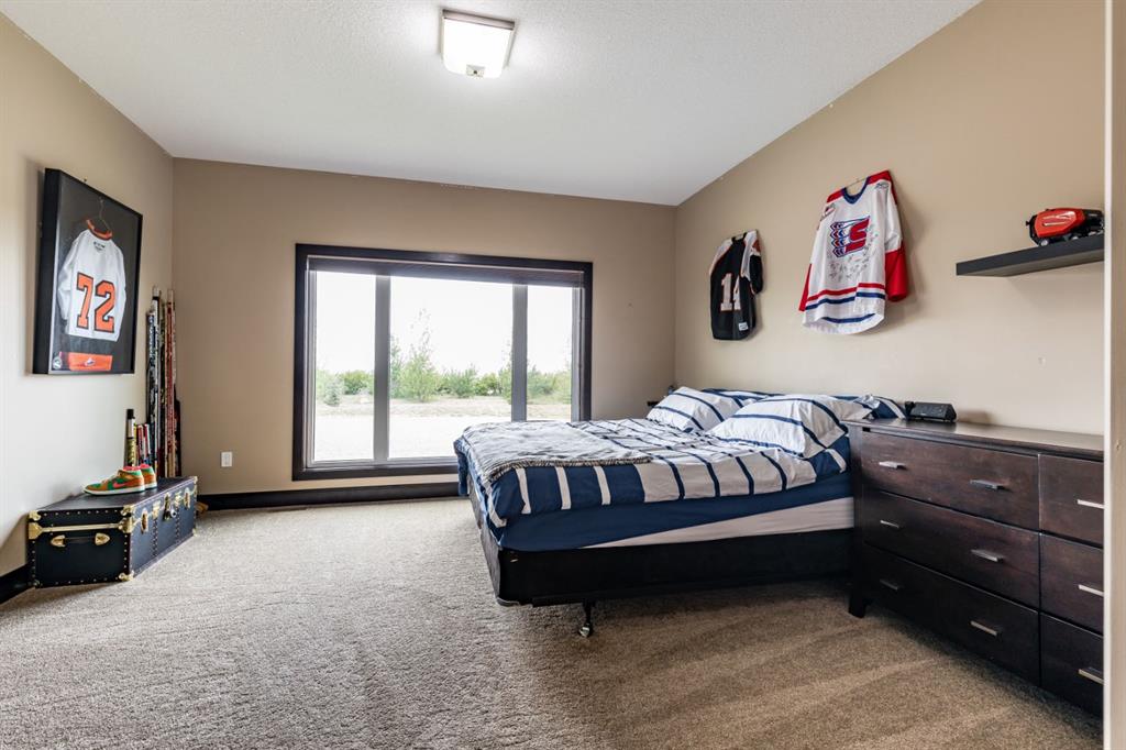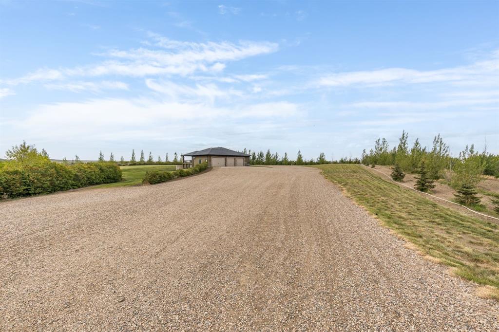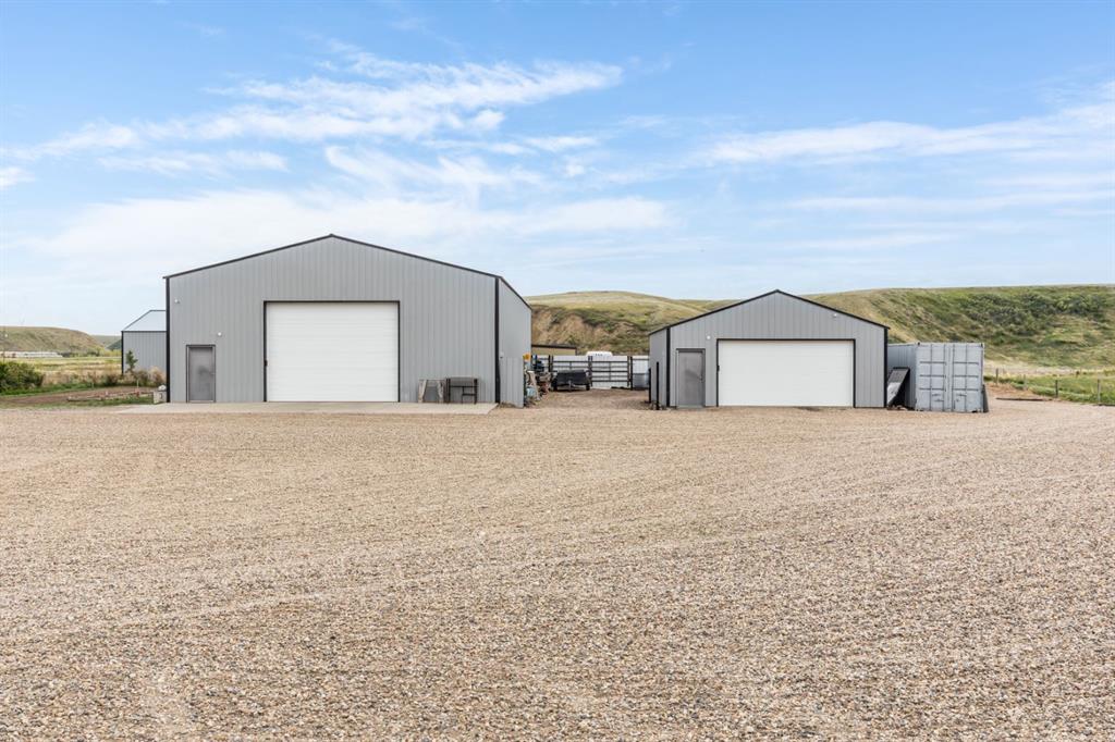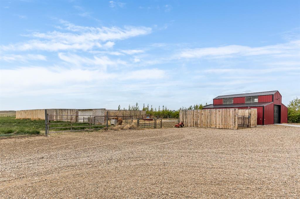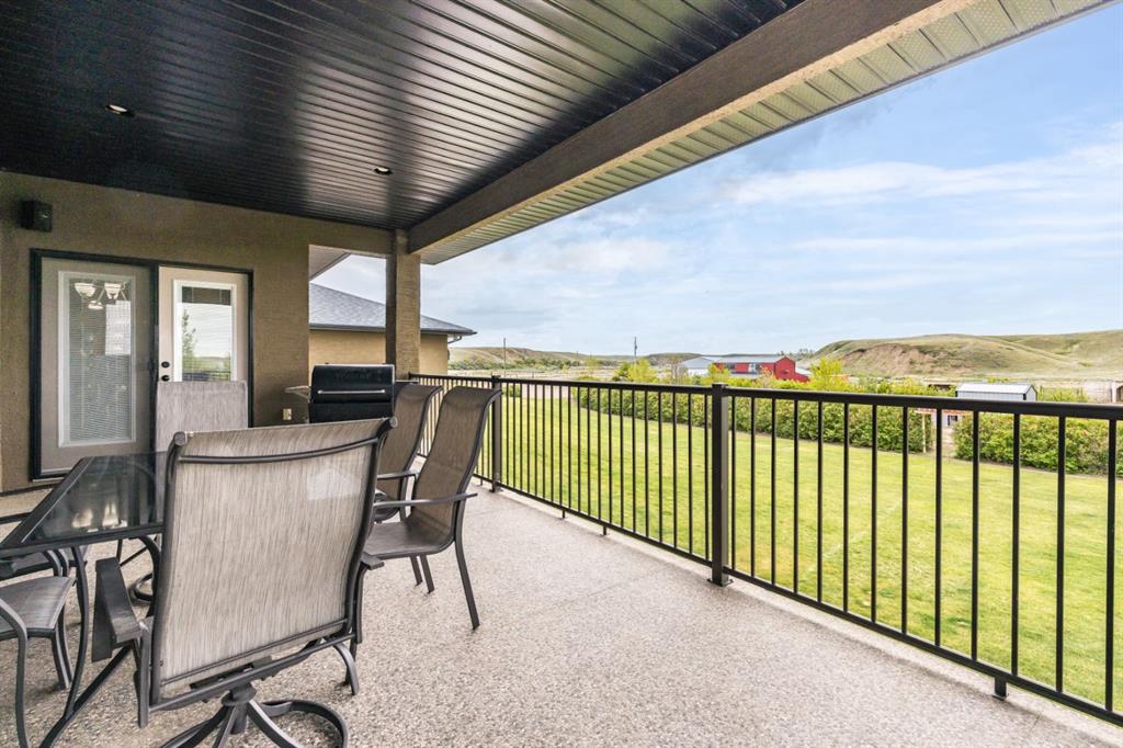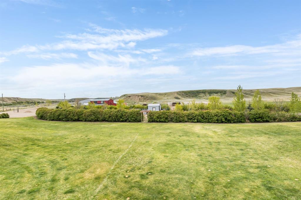 Refined Living. Expansive Land. Unmatched Opportunity. Welcome to an exceptional, meticulously maintained acreage just minutes from the city, offering a rare combination of luxury living, functional infrastructure, and breathtaking views. This impressive 2,522 sqft walkout bungalow is thoughtfully designed with 5 bedrooms, an office, den, and 4 full bathrooms, delivering both comfort and versatility. From the moment you arrive, the pride of ownership is evident. Step inside to a bright, open-concept main floor featuring 9 ft ceilings, tray ceiling detail, rich hardwood flooring, and expansive windows that frame the stunning landscape. A striking double-sided stone fireplace anchors the living space and connects seamlessly to the private office, complete with French doors, built-in desk, shelving, and cabinetry. The chef-inspired kitchen is truly a showpiece, offering a double oven, oversized fridge/freezer, prep island, and abundant cabinetry, all flowing effortlessly into the dining area where oversized windows showcase incredible views. Step out onto the covered deck with gas BBQ hookup—an ideal setting for summer dining and entertaining. Designed for everyday ease, the spacious laundry and mudroom includes a sink, ample counter space, and direct access to the walk-through pantry and attached quad garage. The primary suite is a true retreat, featuring generous space for a sitting area, a spa-like 4 pc ensuite, and a large walk-in closet. An additional bedroom and full bathroom complete the main level. The walkout basement is equally impressive, offering a massive recreation room with wet bar, direct access to the covered patio and hot tub area, a large den perfect for a home gym or media space, 2 additional bedrooms, 2 full bathrooms, and substantial storage. Set on 4.1 acres and zoned Country Residential, this property is fully equipped for a range of rural lifestyles and business opportunities. The land includes all fencing, corrals, and a stock waterer. Outbuildings are a standout feature, including an 80’x40’ insulated shop with two overhead doors and a 2 pc bathroom, a 50’x30’ insulated shop, and a 21’x26’ shop—providing exceptional flexibility for work or storage needs. This is a rare opportunity to own a turn-key acreage that seamlessly blends upscale living with the freedom and functionality of country life, just a short drive from city amenities. This property must be sold with attached 74.7 acre Agricultural land; MLS A2303885. Asking price includes both properties.