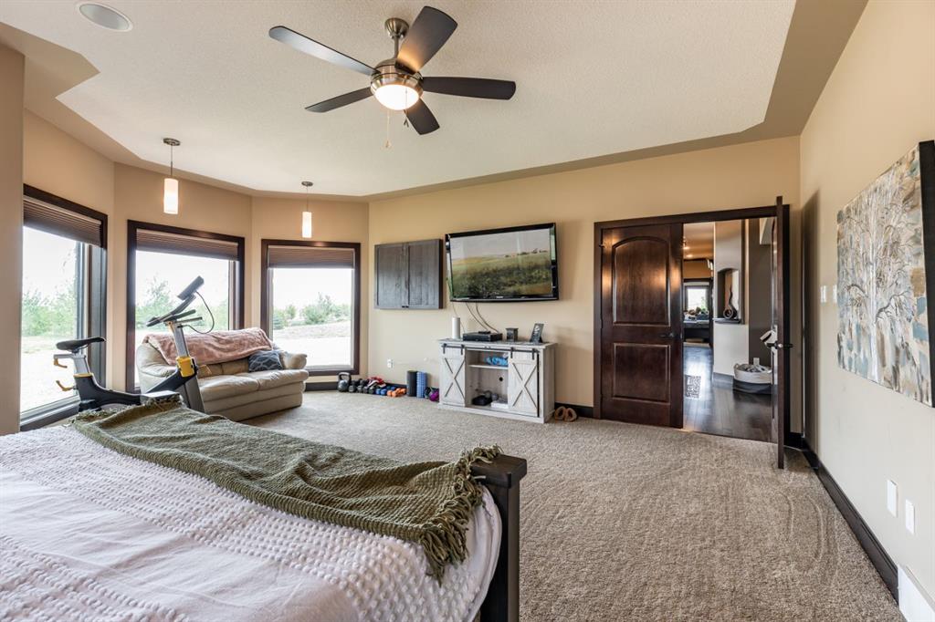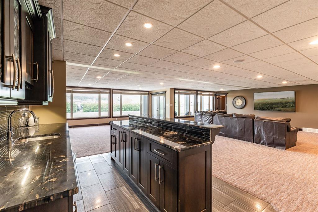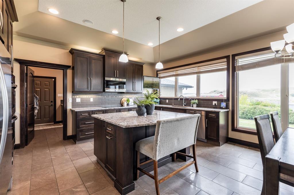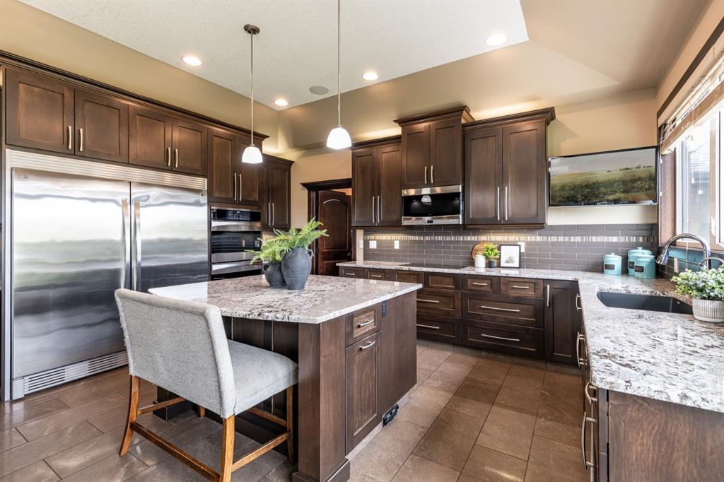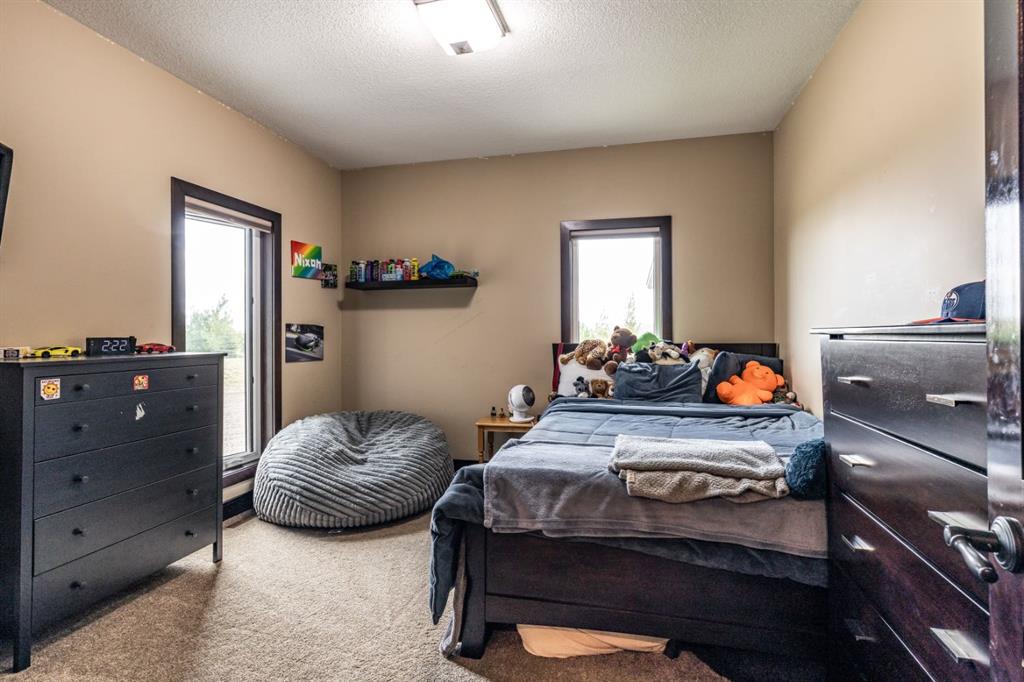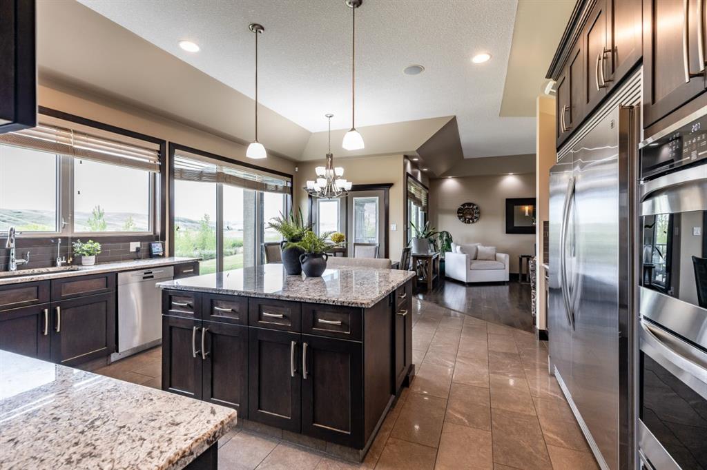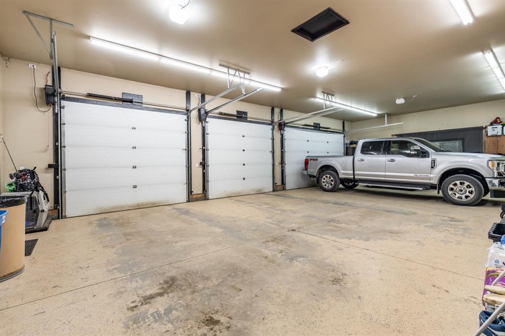 Refined Living. Expansive Land. Unmatched Opportunity. Welcome to an exceptional, meticulously maintained acreage just minutes from the city, offering a rare combination of luxury living, functional infrastructure, and breathtaking views. This impressive 2,522 sqft walkout bungalow is thoughtfully designed with 5 bedrooms, an office, den, and 4 full bathrooms, delivering both comfort and versatility. From the moment you arrive, the pride of ownership is evident. Step inside to a bright, open-concept main floor featuring 9 ft ceilings, tray ceiling detail, rich hardwood flooring, and expansive windows that frame the stunning landscape. A striking double-sided stone fireplace anchors the living space and connects seamlessly to the private office, complete with French doors, built-in desk, shelving, and cabinetry. The chef-inspired kitchen is truly a showpiece, offering a double oven, oversized fridge/freezer, prep island, and abundant cabinetry, all flowing effortlessly into the dining area where oversized windows showcase incredible views. Step out onto the covered deck with gas BBQ hookup—an ideal setting for summer dining and entertaining. Designed for everyday ease, the spacious laundry and mudroom includes a sink, ample counter space, and direct access to the walk-through pantry and attached quad garage. The primary suite is a true retreat, featuring generous space for a sitting area, a spa-like 4 pc ensuite, and a large walk-in closet. An additional bedroom and full bathroom complete the main level. The walkout basement is equally impressive, offering a massive recreation room with wet bar, direct access to the covered patio and hot tub area, a large den perfect for a home gym or media space, 2 additional bedrooms, 2 full bathrooms, and substantial storage. Set on 4.1 acres and zoned Country Residential, this property is fully equipped for a range of rural lifestyles and business opportunities. The land includes all fencing, corrals, and a stock waterer. Outbuildings are a standout feature, including an 80’x40’ insulated shop with two overhead doors and a 2 pc bathroom, a 50’x30’ insulated shop, and a 21’x26’ shop—providing exceptional flexibility for work or storage needs. This is a rare opportunity to own a turn-key acreage that seamlessly blends upscale living with the freedom and functionality of country life, just a short drive from city amenities. This property must be sold with attached 74.7 acre Agricultural land; MLS A2303885. Asking price includes both properties.