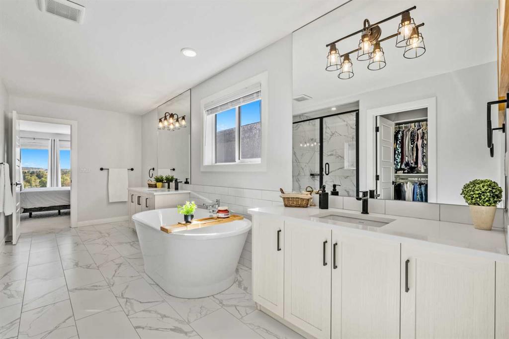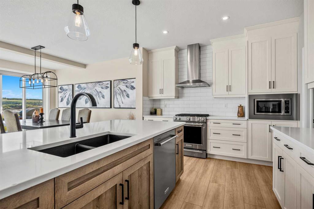 The One You’ve Been Waiting For – A Rare Find in Hudson at Pine Creek. Some homes check boxes - this one stops you in your tracks! A fully finished 2-storey walk-out in Hudson at Pine Creek, crafted for those waiting for the perfect home. With 2,600+ sq. ft. above grade and a beautifully developed lower level for 3,700+ sq. ft. total, it delivers lifestyle and setting. Towering windows frame rolling Foothills views, endless south/west skies, and trails steps from your back gate - a backdrop you won’t find again. Inside, every detail feels elevated yet inviting. The gourmet kitchen commands attention with its oversized island, gas range, full coffee bar and walk-through Butler’s pantry with custom live-edge countertop - ideal for daily living and stylish hosting. The open layout flows across wide-plank blond LVP floors under a soaring staircase that floods the entry with drama and light. Off the main living area, a massive deck with gas BBQ hookup and updated Tuff deck finish spans the back. Function meets polish with a spacious double garage leading to a mudroom with custom built ins. A main floor office/library/playroom adds versatility. Upstairs, the private primary retreat impresses with double walk-in closets, spa-like en-suite, and elevated views. The bonus room showcases panoramas, while two more large bedrooms (both with walk-ins) sit nearby. A dream laundry and well-planned bath make the upper floor both practical and stylish. The finished walk-out basement sets this home apart. With its own kitchen, oversized bedroom, bright living space, and abundant natural light, it’s perfect for multi-generational living or adult kids needing independence. Not using the illegal suite? Imagine the ultimate games room, home theatre, or an epic bar—this level adapts to your vision. Step outside to a maintenance-free yard with premium artificial turf and direct trail access. A large playground across the street offers open space for games and gatherings. Extras push this home over the top: exterior wrapped lighting (no more Christmas lights), programable motorized blinds that let in light while blocking heat, custom built-ins, upgraded powder room vanity, AC, and dual-zoned HVAC. Even the exterior is fully finished for pure, no-maintenance enjoyment. If you’ve been waiting for a home that stands out—a rare blend of style, function, and setting—this is it! Move-in ready, unforgettable, and truly one-of-a-kind.