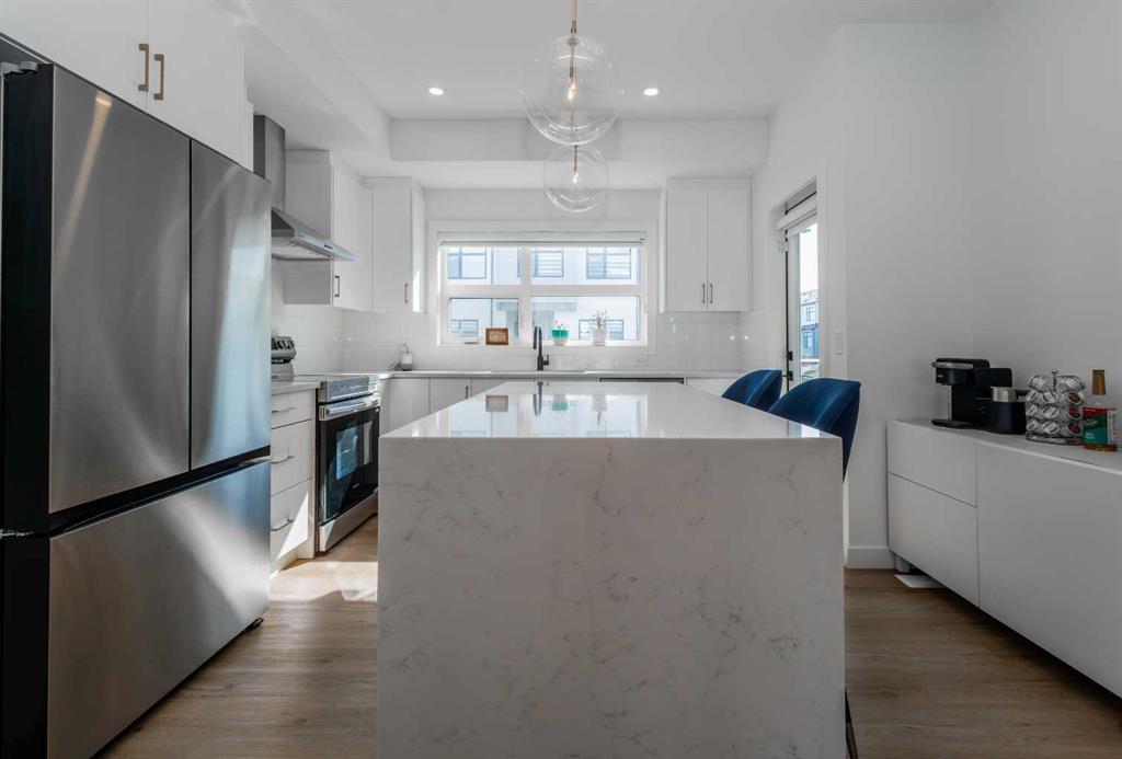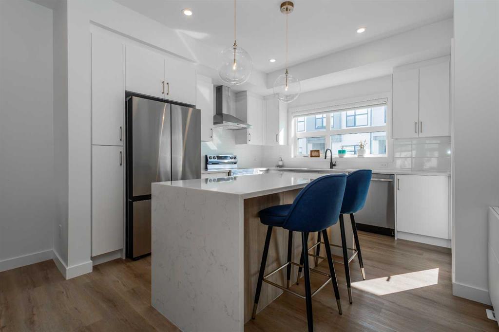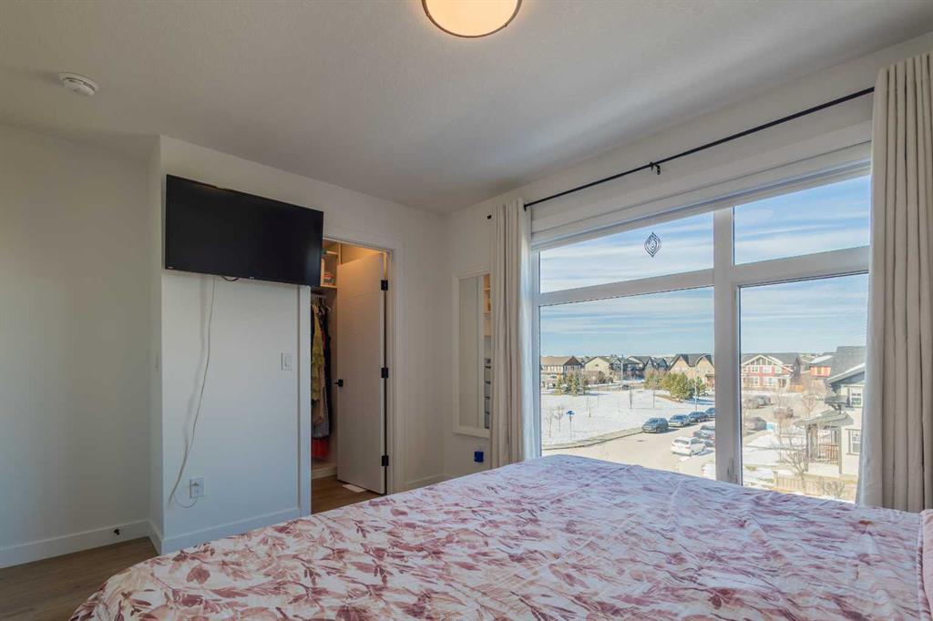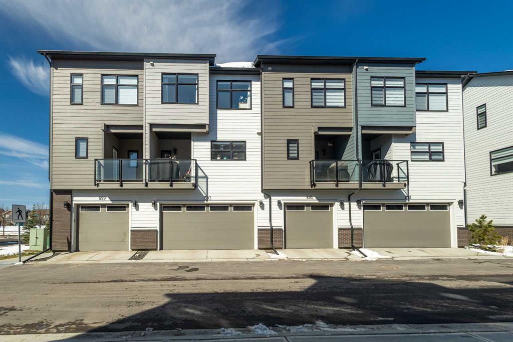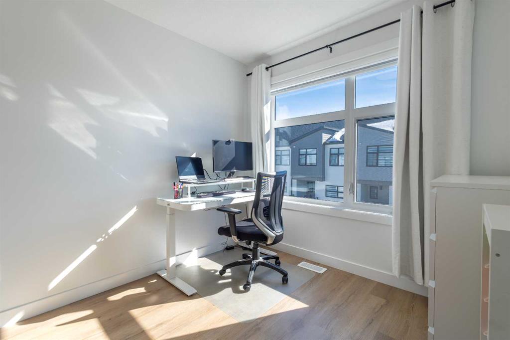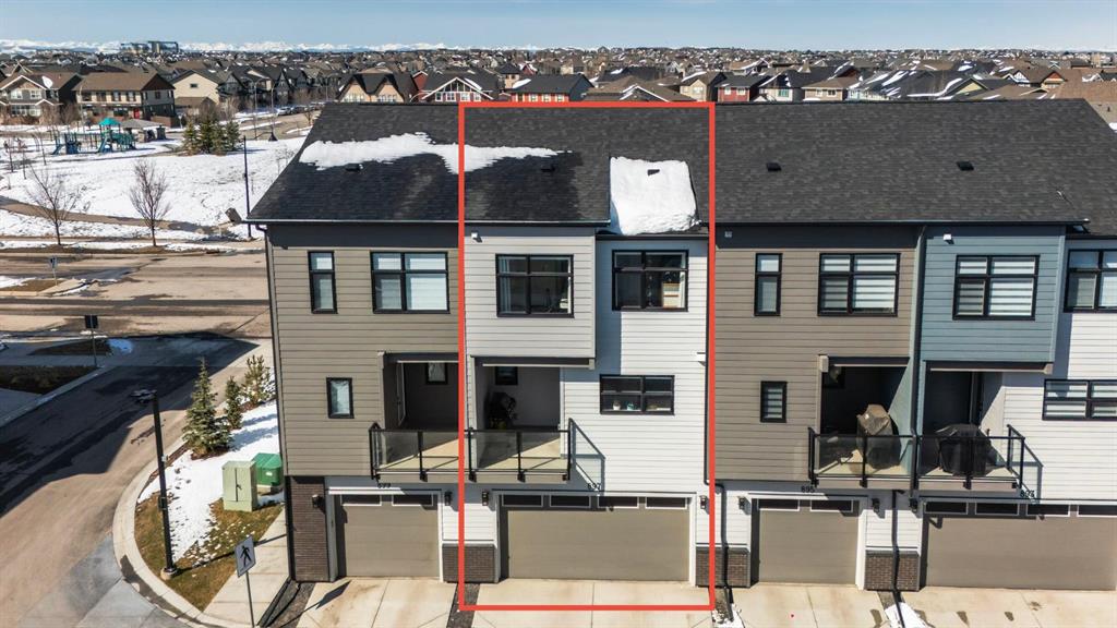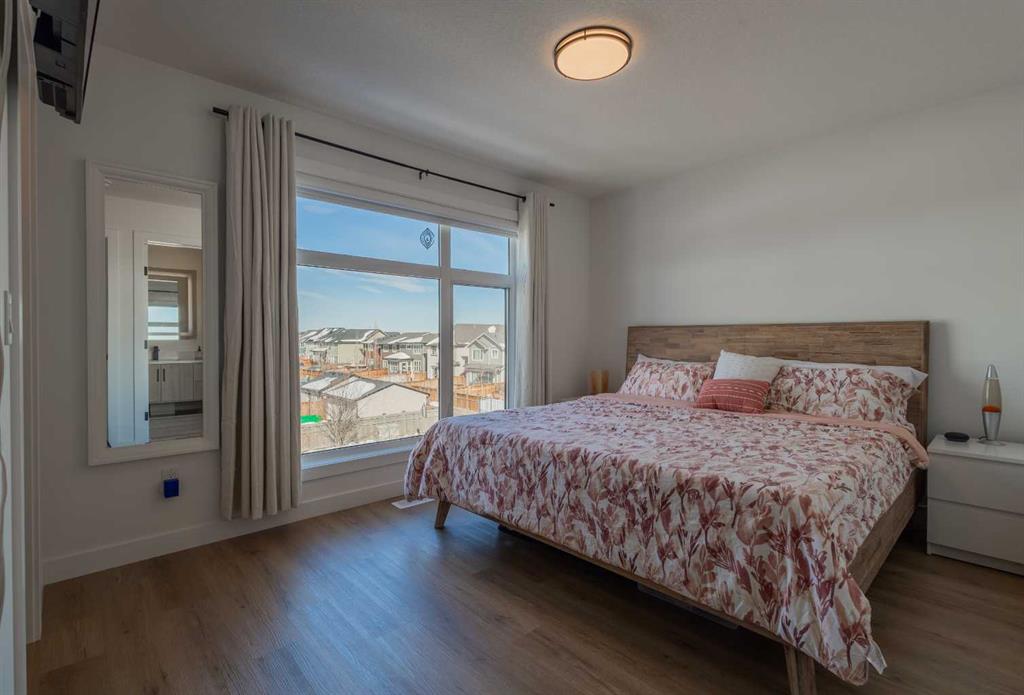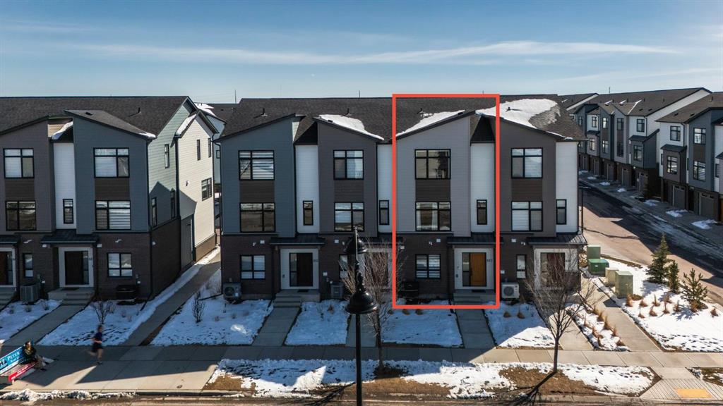 Welcome to refined living in this beautifully appointed townhome, where elegance meets everyday comfort. Bathed in an abundance of natural light, this residence offers a warm and inviting atmosphere from the moment you step inside. The entry level features a thoughtfully designed foyer, complemented by a private, enclosed office—ideal for working from home—alongside a spacious double attached garage. Ascending to the main level, you are greeted by a sophisticated open-concept layout that seamlessly blends the living, dining, and kitchen areas. This space is enhanced by high-end finishes and premium appliances, creating a perfect setting for both entertaining and daily living. Step out onto the balcony to enjoy a peaceful morning coffee or unwind with an evening barbecue. The upper level hosts a generously sized primary bedroom, complete with a walk-in closet featuring built-ins and a beautifully designed ensuite. Two additional well-proportioned bedrooms, a full bathroom, and a conveniently located laundry area complete this floor. This exceptional home is further elevated by modern comforts, including automated blinds throughout and air conditioning to keep you cool during the warmer months. Situated in the sought-after community of Mahogany, residents enjoy access to an unparalleled array of amenities—from scenic parks and playgrounds to schools, shops, and recreational opportunities. This vibrant lake community offers a lifestyle so complete, you may never need to leave the neighborhood.