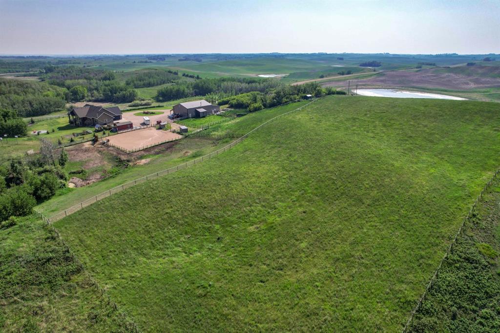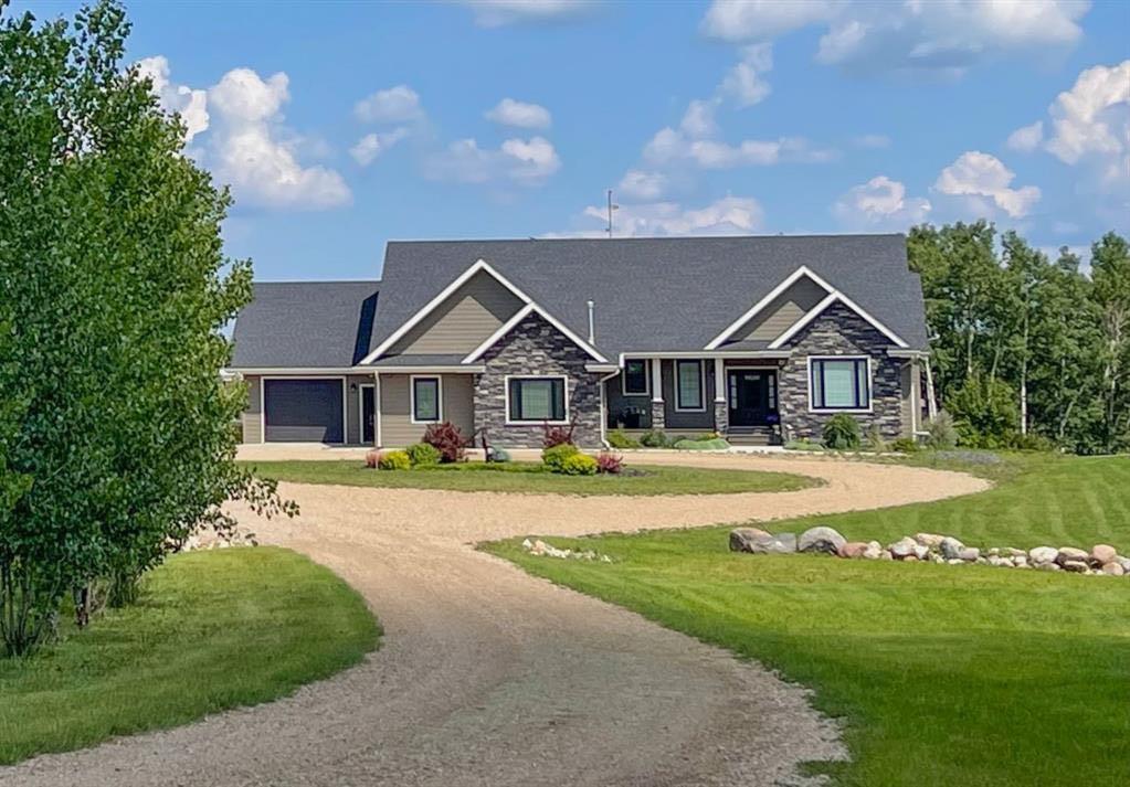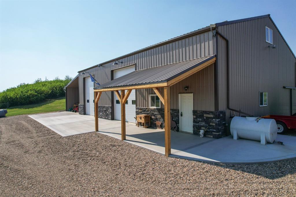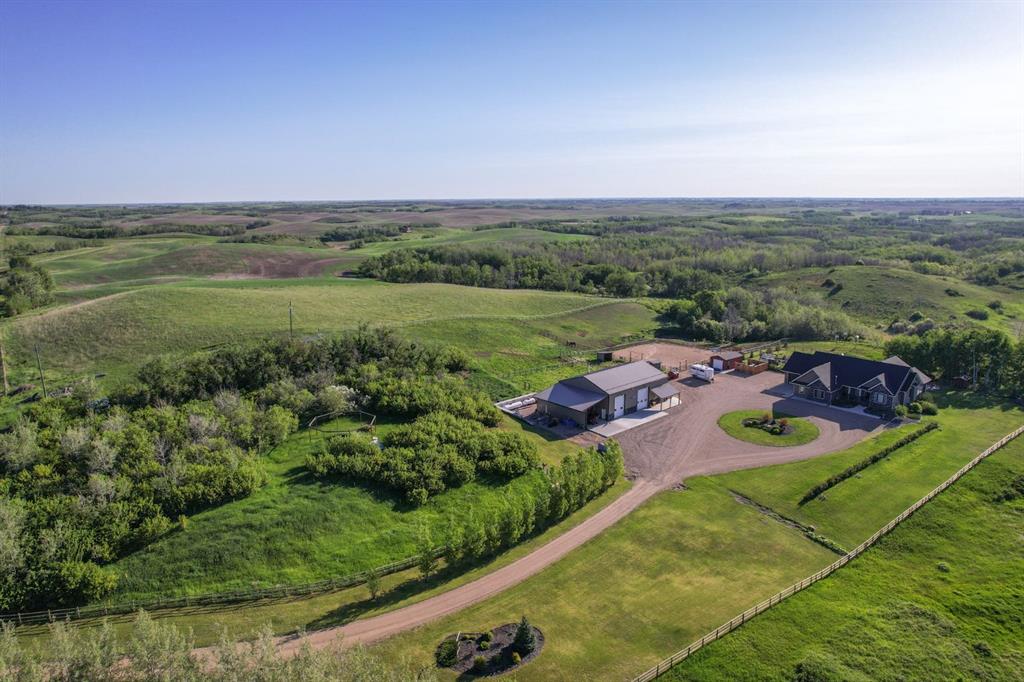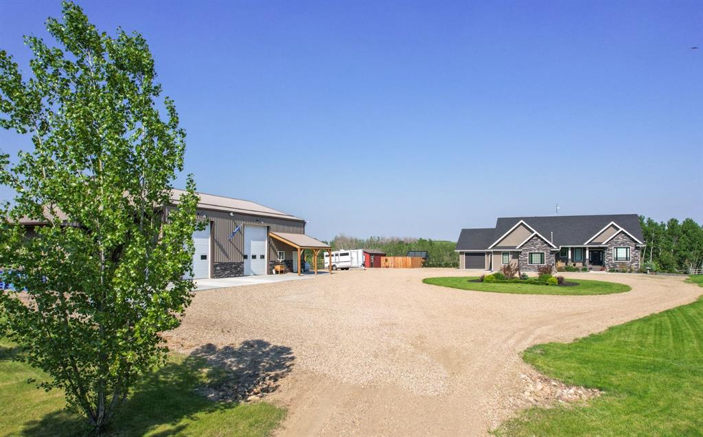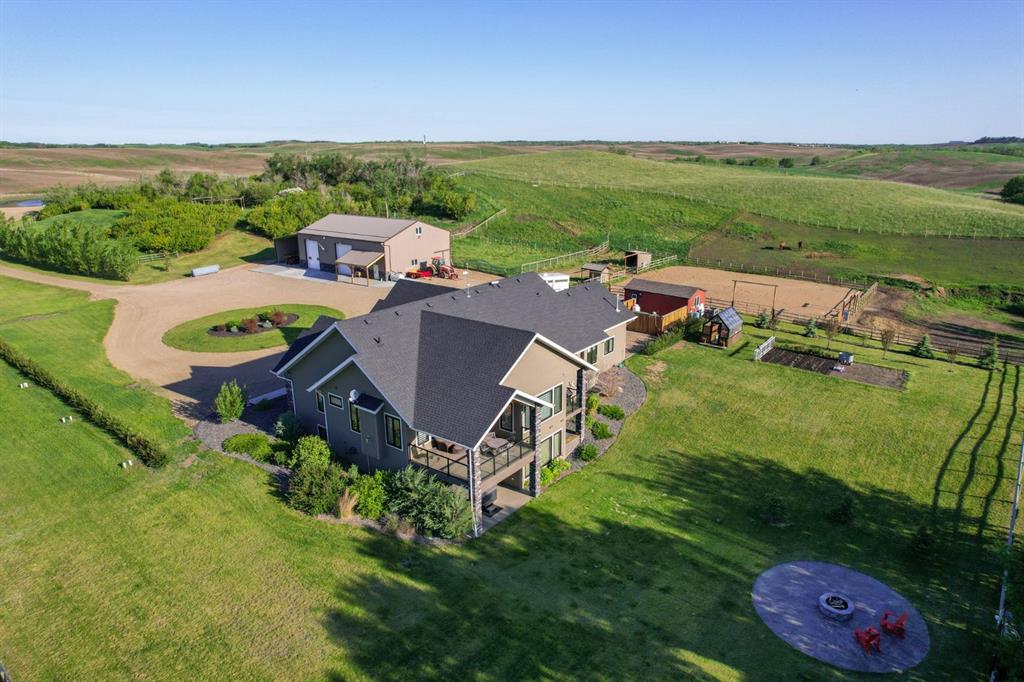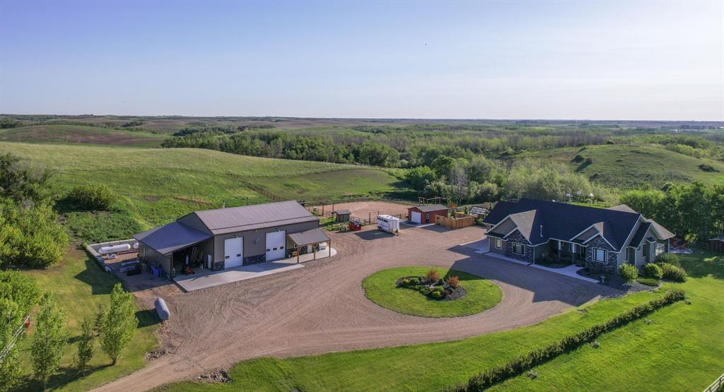 WELCOME TO ALBERTA! On offer is an immaculate acreage nestled in the hills of beautiful No. 6 Stettler County for those who want to spend their days in the epitome of western luxury. At over 4100 square feet of living space between the main level and walkout basement, no expense was spared in its premium finishes and masterful design. The grand entry makes a statement showcasing outstanding works of art, welcoming you through into the open concept kitchen and living area. Be awestruck by the gorgeous custom cabinetry, quartz counter tops, gas fireplace and covered balconies: one for visiting, the other just off the kitchen for barbecuing. Ultra high end stainless appliances including a gas cooktop, built-in oven and convection microwave, dishwasher and refrigerator and even a wine fridge tucked under the end of the sit-up island. A micro office hidden off to the side is very practical and very cool, the walk-in pantry at the other end checks off all the boxes to make this a dream kitchen. Vistas to the North, West & East incorporate the beautiful natural surroundings into your day. The Master is the gem we'd expect in a home of this calibre, dual vanity ensuite with walk in shower and walk-in closet. Spacious second bedroom on the main floor conveniently next door to the main floor bathroom. If the kitchen is the heart of the home, this basement is the pulse with a central family room ideal for entertaining with the pool table, wet bar and adorned with more brilliant artwork! Out on the patio for a quick dip in the hot tub and then back inside to the suite on the north end, or the pair of bedrooms on the south to tuck in for the night, even though we can't technically call the one bedroom a bedroom because the windows are solid. Massive three car garage set up to keep the vehicles clean and pristine and the SideXSide or ATV's in their own space, complete with its own washroom bringing the house total to 5. Out to the shop and you'll find everything needed for a hotblooded North American! 40X60', in-floor heat, totally finished and looking like a showroom for the tools. The office, a touch of class, with a bonus rec. room upstairs for a multitude of uses. A wood burning stove in the centre of it to keep things cozy or act as a backup heat source. A 20' lean-too built off the end for covered storage and a 10X20' overhang added on the front for a western flare while keeping the rain and mud away from the front door with the help of a new concrete skirting at the shop. Excellently set up for horses complete with outdoor riding arena, built in-shelter in the NW corner of the shop, covered hay storage and many paddocks + sheds & water bowls! The whole property is cross fenced, and the north field produces good hay. Even the greenhouse looks like it belongs in a magazine! The regional water line services the house and a good well takes care of the yard & stock. Lastly, multiple spots to have a bonfire and howl at the moon in the rolling hills of this 9.88 acre Masterpiece!