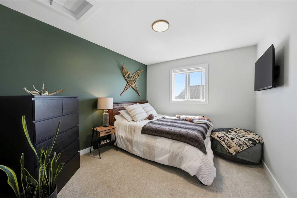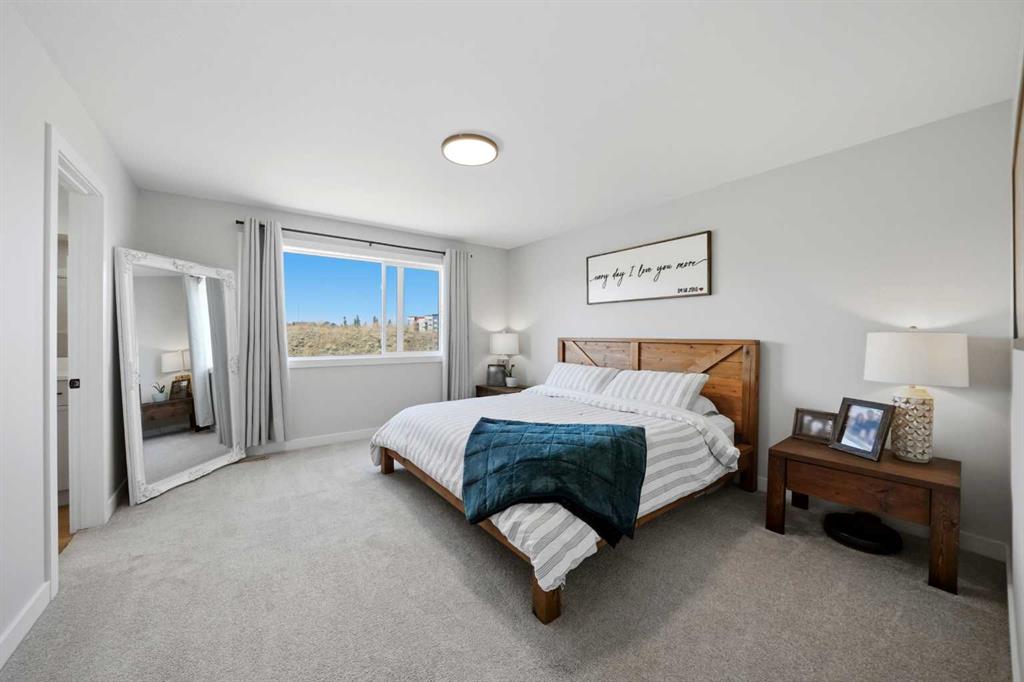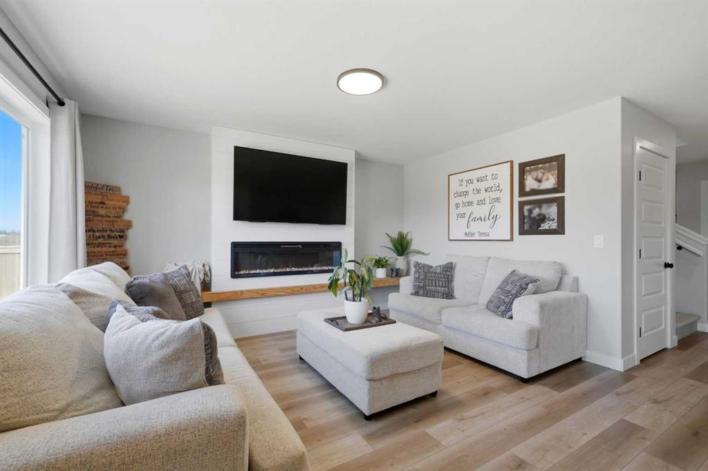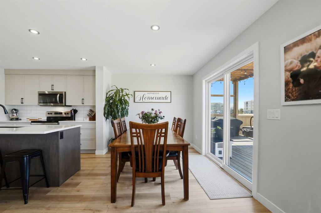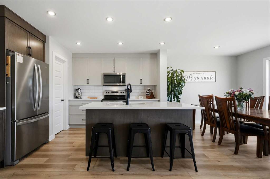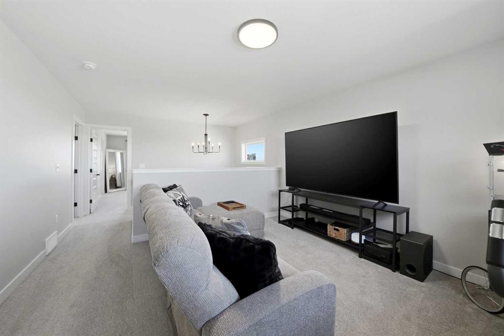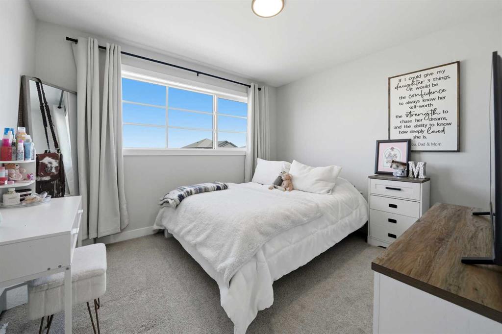 Welcome to this stunning fully finished two-storey home in the desirable community of Trinity Crossing. Offering the perfect blend of location, functionality, and modern design, this home is ideally situated just steps from a large green space, scenic pond walking paths, a school, and a playground. Making it an excellent fit for families looking to stay connected to outdoor living and everyday convenience. The thoughtfully designed 1,870 sq ft layout features a bright, open-concept main floor with luxury vinyl plank flooring, large windows, and clean, modern finishes throughout. The kitchen is both stylish and functional, showcasing two-toned cabinetry, quartz countertops, stainless steel appliances, a full tile backsplash, and a spacious sit-up island, along with a walk-in pantry for added storage. The adjacent dining area offers direct access to the back deck through oversized patio doors, creating a seamless flow for everyday living and entertaining. The living room is warm and inviting, filled with natural light and designed for comfort. Upstairs, you’ll find a spacious bonus room, two generously sized bedrooms, each complete with their own walk-in closet, a well-appointed 4-piece bathroom, and conveniently located upper-level laundry. The primary suite serves as a private retreat, featuring a large walk-in closet and a 3-piece ensuite with walk-in shower and a separate water closet for added privacy. The fully finished basement extends the living space even further, offering a large family room with a dry bar, an additional bedroom, and a 4-piece bathroom, perfect for guests, teens, or flexible use. Step outside and into your fully fenced and landscaped west facing backyard and enjoy the outdoor living space, complete with 2 decks, pergola and shed. Additional Features: Celebright Lighting (front of house), Underground Sprinklers, Finished & Heated Attached Double Garage. This 2-year-old home also offers the balance of the Alberta New Home Warranty Program, providing added peace of mind.