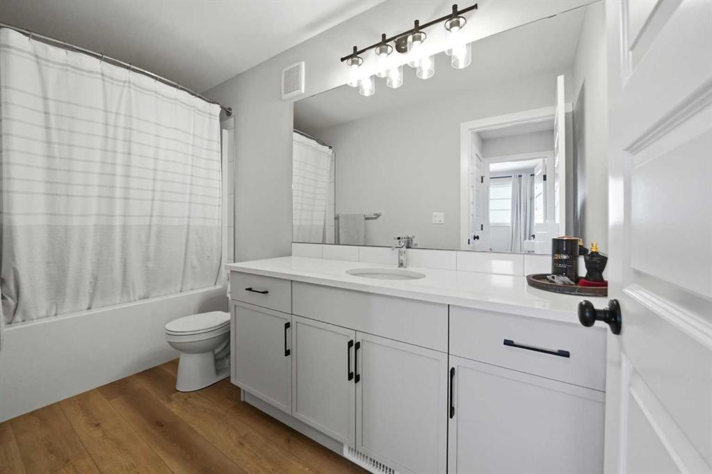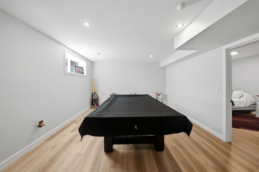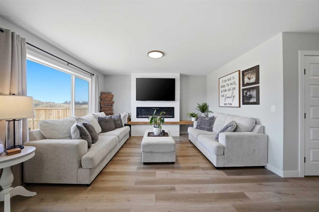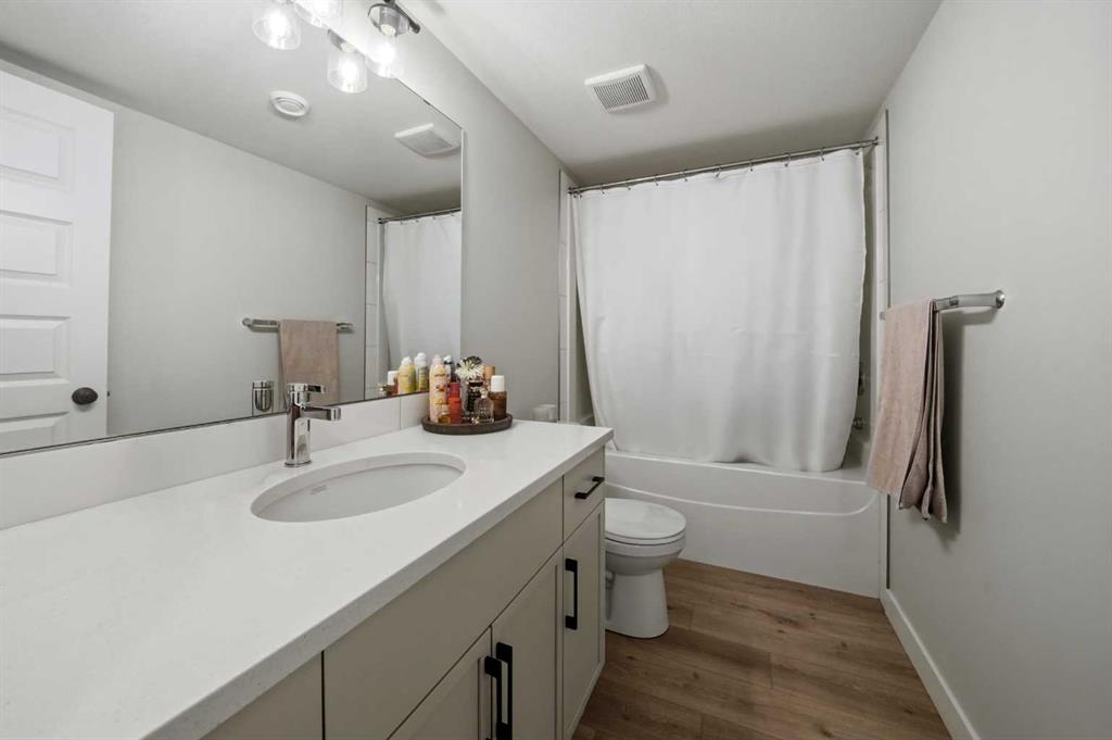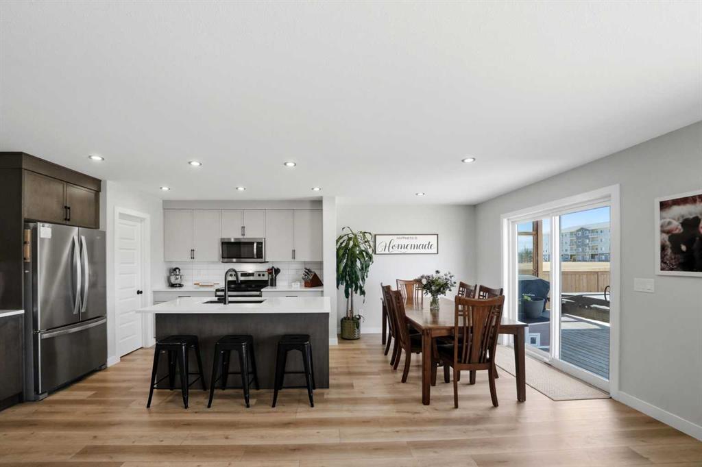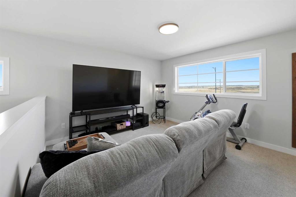 Welcome to this stunning fully finished two-storey home in the desirable community of Trinity Crossing. Offering the perfect blend of location, functionality, and modern design, this home is ideally situated just steps from a large green space, scenic pond walking paths, a school, and a playground. Making it an excellent fit for families looking to stay connected to outdoor living and everyday convenience. The thoughtfully designed 1,870 sq ft layout features a bright, open-concept main floor with luxury vinyl plank flooring, large windows, and clean, modern finishes throughout. The kitchen is both stylish and functional, showcasing two-toned cabinetry, quartz countertops, stainless steel appliances, a full tile backsplash, and a spacious sit-up island, along with a walk-in pantry for added storage. The adjacent dining area offers direct access to the back deck through oversized patio doors, creating a seamless flow for everyday living and entertaining. The living room is warm and inviting, filled with natural light and designed for comfort. Upstairs, you’ll find a spacious bonus room, two generously sized bedrooms, each complete with their own walk-in closet, a well-appointed 4-piece bathroom, and conveniently located upper-level laundry. The primary suite serves as a private retreat, featuring a large walk-in closet and a 3-piece ensuite with walk-in shower and a separate water closet for added privacy. The fully finished basement extends the living space even further, offering a large family room with a dry bar, an additional bedroom, and a 4-piece bathroom, perfect for guests, teens, or flexible use. Step outside and into your fully fenced and landscaped west facing backyard and enjoy the outdoor living space, complete with 2 decks, pergola and shed. Additional Features: Celebright Lighting (front of house), Underground Sprinklers, Finished & Heated Attached Double Garage. This 2-year-old home also offers the balance of the Alberta New Home Warranty Program, providing added peace of mind.