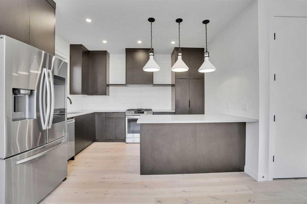 Welcome to the Brownstones of Mount Pleasant. Great opportunity to own a townhome w/ over 1700 sqft of living space in the heart of one of the top inner-city communities! This modern brownstone home designed by New Century Design and MartinLee Designs features an open concept layout with White Oak engineered hardwood floors throughout the main level, textured finishes, and custom spatial enhancing elements. The chef-inspired kitchen features a large breakfast bar, quartz countertops, and a stainless steel appliance package that includes a gas stove. As you head upstairs, you will find 2 bedrooms with ensuite bathrooms and a laundry room with built-in shelving and ample storage. The large PRIMARY bedroom is designed to fit a king-size bed, with his and hers walk-in closets and a 4-piece ensuite. The basement is fully developed with a third bedroom, a spacious recreation room, and a wet bar. Additional features include a BBQ gas line on the patio, an electric fireplace in the living room, built-in all closets, innovative home features (NEST and doorbell), and A/C rough-ins. With an 85 Bike score, most errands can be accomplished without a car. These units are also a short distance to downtown, a 5-minute drive, or just a 13-minute bike ride. Right around the corner from amazing restaurants and cafes such as 4TH SPOT KITCHEN AND BAR, JOHNS BREAKFAST & LUNCH, TURCA CAFE & MARKET,