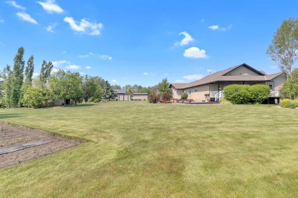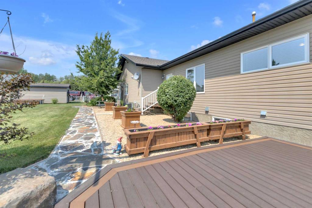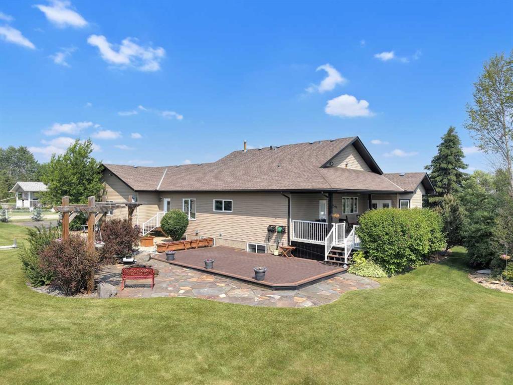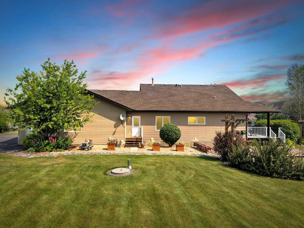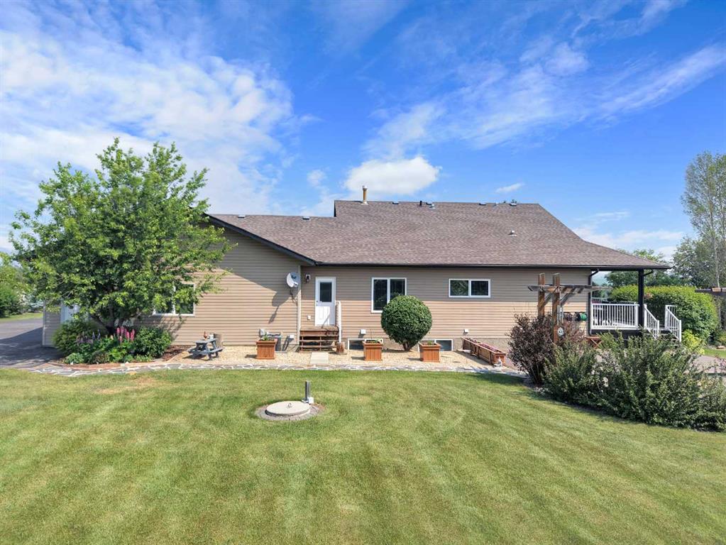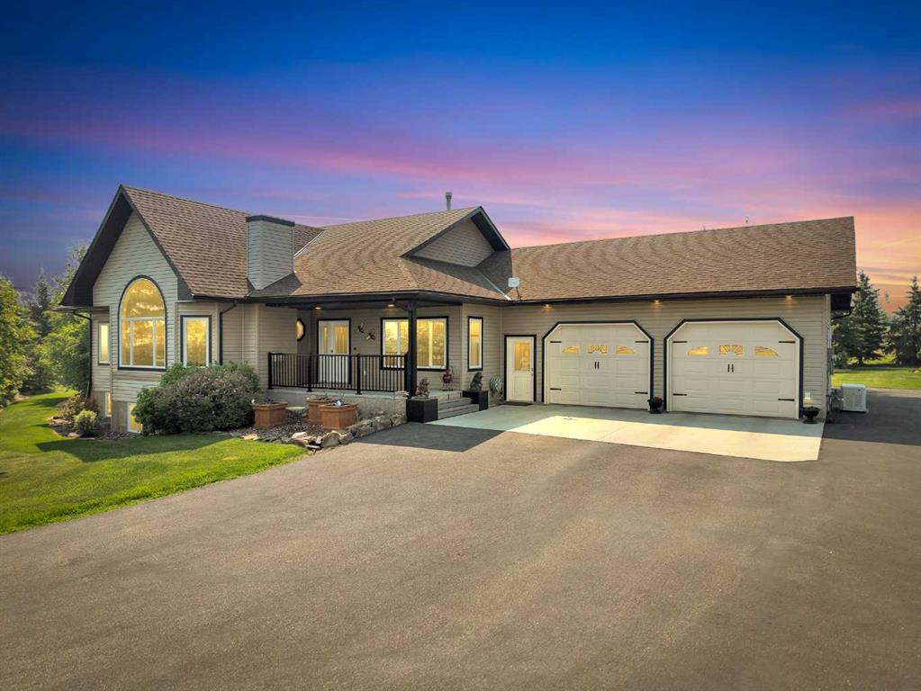 Welcome to the perfect balance of refined living and peaceful country charm, just minutes from Rimbey. Set on a beautifully landscaped acreage, this impressive 1,929 sq ft bungalow offers exceptional space, comfort, and quality throughout. Featuring 6 generous bedrooms and 3 bathrooms, this home is designed to accommodate families of all sizes while still feeling warm and inviting. The open-concept main living area is filled with natural light and showcases a stunning kitchen complete with granite countertops, newer appliances, and seamless flow into the cozy living room anchored by a gas fireplace—perfect for everyday living and entertaining alike. Step outside and enjoy thoughtfully designed outdoor spaces, including covered Dura Decks at both the front and back, a composite ground-level deck, and a private camp kitchen with firepit—an ideal setting for hosting or unwinding under the stars. This property is fully equipped for comfort and convenience with a Generac whole-home backup generator and wiring in place for a future hot tub. The heated triple attached garage features in-floor heat and hot/cold water, while the basement also benefits from in-floor heating for year-round comfort. Additional highlights include maple hardwood flooring, an asphalt driveway, oversized garden shed, and a secure automatic command gate. With pavement right to your doorstep and every detail carefully considered, this move-in ready acreage offers a rare opportunity to enjoy country living without compromise.