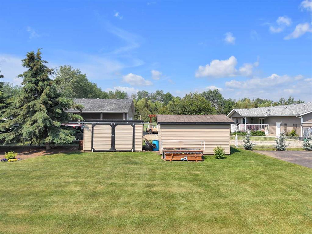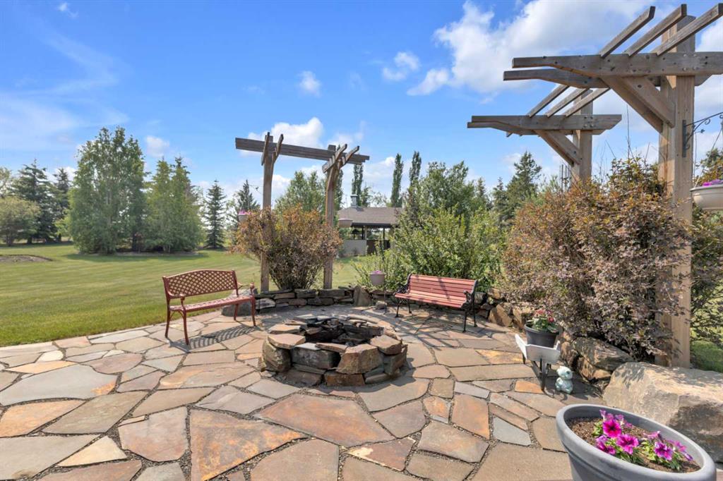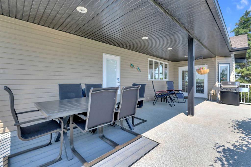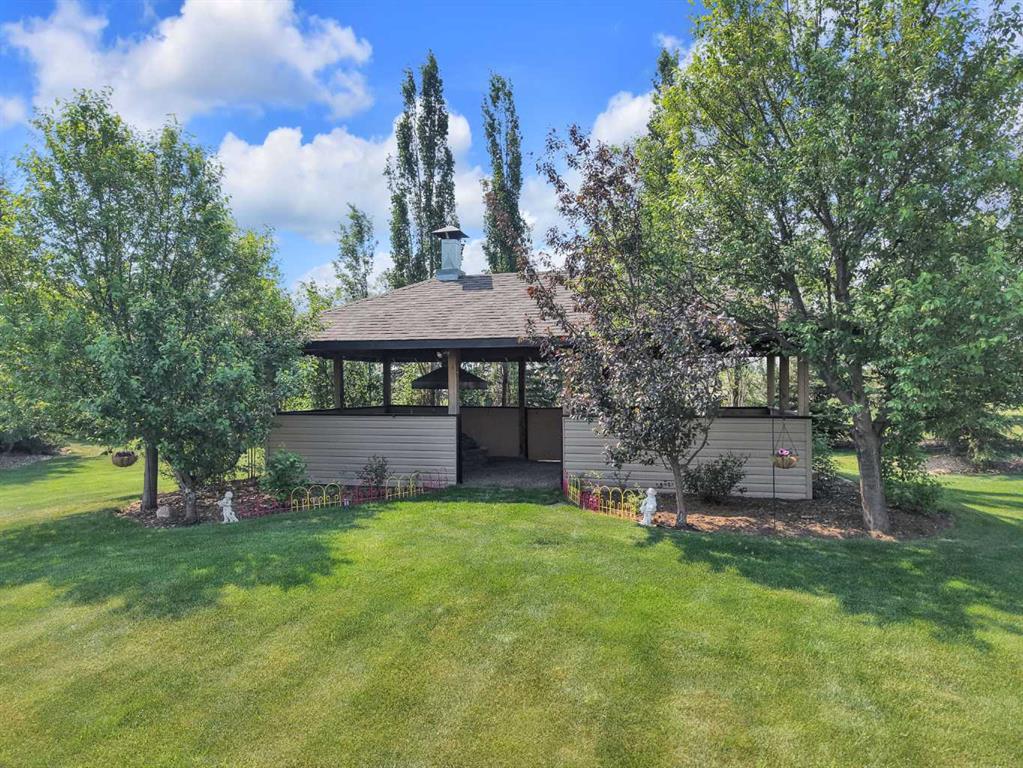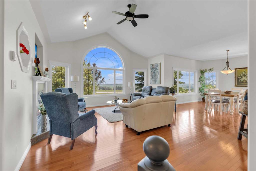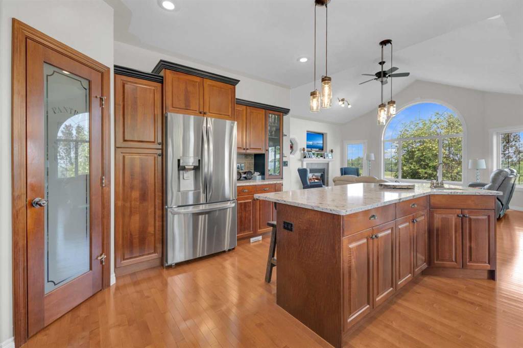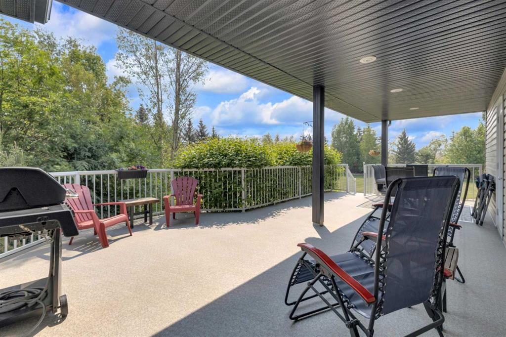 Welcome to the perfect balance of refined living and peaceful country charm, just minutes from Rimbey. Set on a beautifully landscaped acreage, this impressive 1,929 sq ft bungalow offers exceptional space, comfort, and quality throughout. Featuring 6 generous bedrooms and 3 bathrooms, this home is designed to accommodate families of all sizes while still feeling warm and inviting. The open-concept main living area is filled with natural light and showcases a stunning kitchen complete with granite countertops, newer appliances, and seamless flow into the cozy living room anchored by a gas fireplace—perfect for everyday living and entertaining alike. Step outside and enjoy thoughtfully designed outdoor spaces, including covered Dura Decks at both the front and back, a composite ground-level deck, and a private camp kitchen with firepit—an ideal setting for hosting or unwinding under the stars. This property is fully equipped for comfort and convenience with a Generac whole-home backup generator and wiring in place for a future hot tub. The heated triple attached garage features in-floor heat and hot/cold water, while the basement also benefits from in-floor heating for year-round comfort. Additional highlights include maple hardwood flooring, an asphalt driveway, oversized garden shed, and a secure automatic command gate. With pavement right to your doorstep and every detail carefully considered, this move-in ready acreage offers a rare opportunity to enjoy country living without compromise.