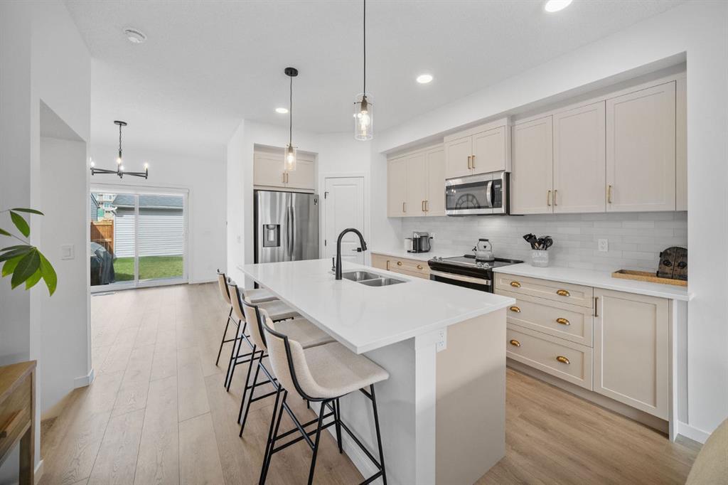 Open House - Sat & Sun from 1:00-3:30 pm. Discover refined living in this exceptional two-storey Alloy Townhouse, ideally located in the highly desirable community of Sage Hill NW. This beautifully appointed end unit offers the perfect blend of contemporary style, thoughtful design, and everyday practicality, creating a space that feels as good as it looks. Inside, you’ll find 1364 square feet of comfortable living space, including three spacious bedrooms and two and a half bathrooms, perfect for families or anyone who loves to entertain. Step into a bright, open-concept main floor that instantly feels like home. The modern kitchen stands out with a clean, stylish colour palette, upgraded lighting, and sleek stainless-steel appliances, set up perfectly for everything from quick weekday meals to hosting friends. The living and dining areas flow effortlessly together, with a cozy breakfast nook just off to the side, plus a practical mudroom and convenient half bath to keep daily life organized. Upstairs, the primary suite delivers a true retreat with vaulted ceilings, a spacious walk-in closet, and a well-appointed four-piece ensuite. Two additional generously sized bedrooms and an upper-floor laundry room make everyday living simple and efficient. The undeveloped basement is a blank slate, featuring two large windows and a bathroom rough-in—ready for you to design the extra space you’ve been wanting. Outside, enjoy a fully fenced and landscaped backyard, a spacious deck with a gas line for summer BBQs, and a double detached garage for added convenience. Perfectly positioned for convenience, you’re just minutes from Sage Hill Crossing, Beacon Hill Shopping Centre, and Cross Iron Mills, with nearby parks and schools, making it an ideal setting for growing families. Enjoy modern living with zero condo fees and the long-term value you’ve been looking for. *Some photos have been virtually staged*