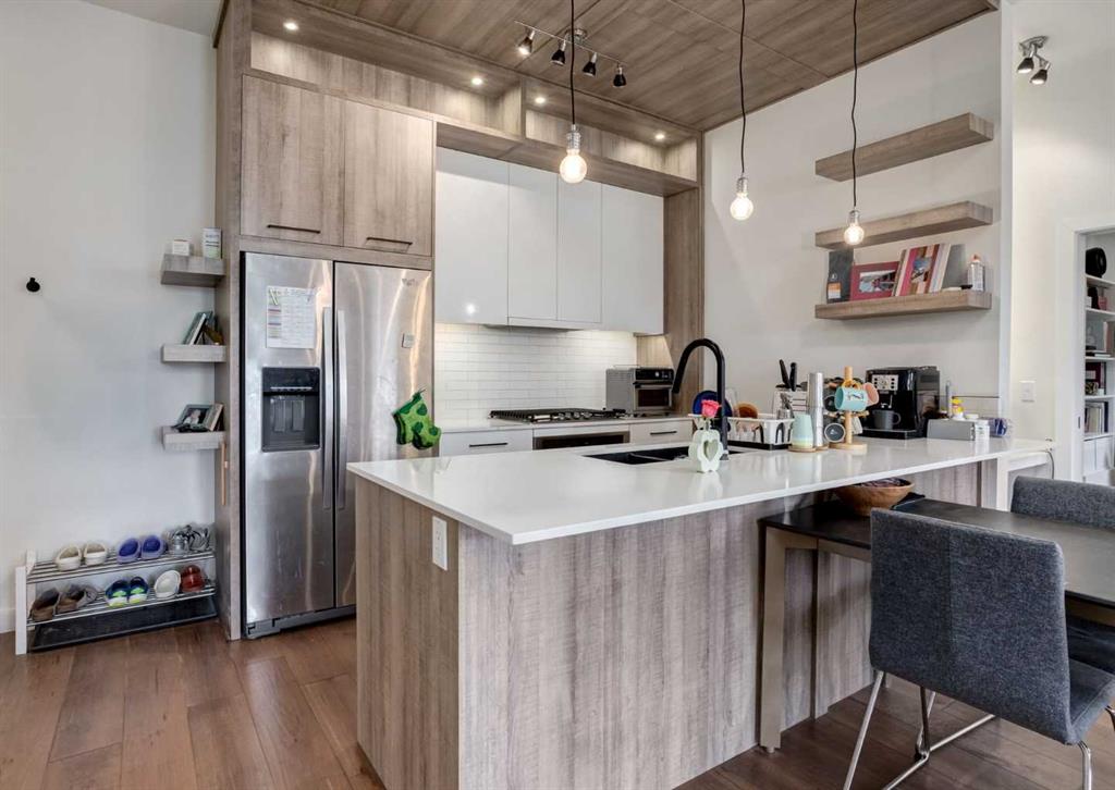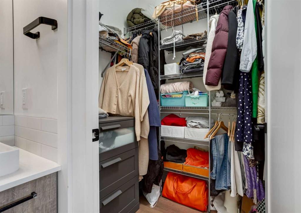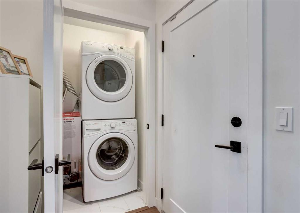 Welcome to this top-floor unit in Shaganappi, built by Truman Homes. This well designed 2 bedroom, 2 bathroom condo offers a clean, modern layout in a highly convenient inner-city location. The unit is currently tenant occupied, making it a solid option for investors seeking immediate rental income, while still being a great fit for future end-users. Inside, you’ll find 10-foot ceilings and engineered hardwood flooring throughout the main living space. The kitchen features quartz countertops, two-tone cabinetry, and stainless steel appliances, including a built-in oven and gas cooktop, complemented by a subway tile backsplash. The living area is bright with large windows and opens onto a north-facing balcony with a gas line. The primary bedroom includes a walk-in closet and a 3-piece ensuite with a glass shower. The second bedroom and full bathroom are well separated, offering flexibility for guests, roommates, or a home office. A built-in desk area adds practical day-to-day functionality. Additional features include in-suite laundry, wall-mounted A/C, titled underground parking, and an assigned storage locker. You’re just a short walk to the LRT, Westbrook Mall, and Killarney Aquatic Centre, with quick access to downtown and 17th Avenue - making this a highly accessible and convenient location. A great opportunity for both investors and buyers looking for a low maintenance inner-city property. Book your showing today!