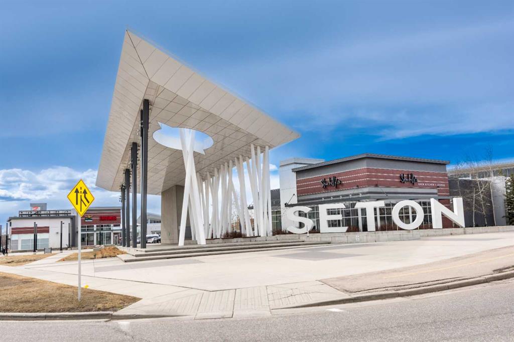Welcome to this beautifully appointed main-floor unit in the heart of Seton! This 2-bedroom, 2-bathroom condo offers an open-concept layout with over 965 sq. ft. of functional living space. The spacious wraparound balcony offers fantastic southeast views—perfect for morning sun and evening relaxation. The upgraded kitchen features premium two-tone cabinetry, quartz countertops, a stylish tile backsplash, stainless steel appliances, and an oversized undermount sink. The dining area opens directly onto the balcony through large patio doors, and the living room offers plenty of space for entertaining or relaxing. The primary bedroom includes a generous walk-in closet and a modern ensuite with double sinks and a large glass shower. The second bedroom is ideally positioned on the opposite side of the unit for privacy and is adjacent to the second full bathroom. Additional highlights include in-suite laundry, and an underground parking, Located just steps from South Health Campus, YMCA, Brookfield Residential Community Centre, restaurants, and retail. Quick access to transit, parks, and major roadways. Don’t miss this opportunity to own a main-floor unit in one of Calgary’s fastest-growing communities!