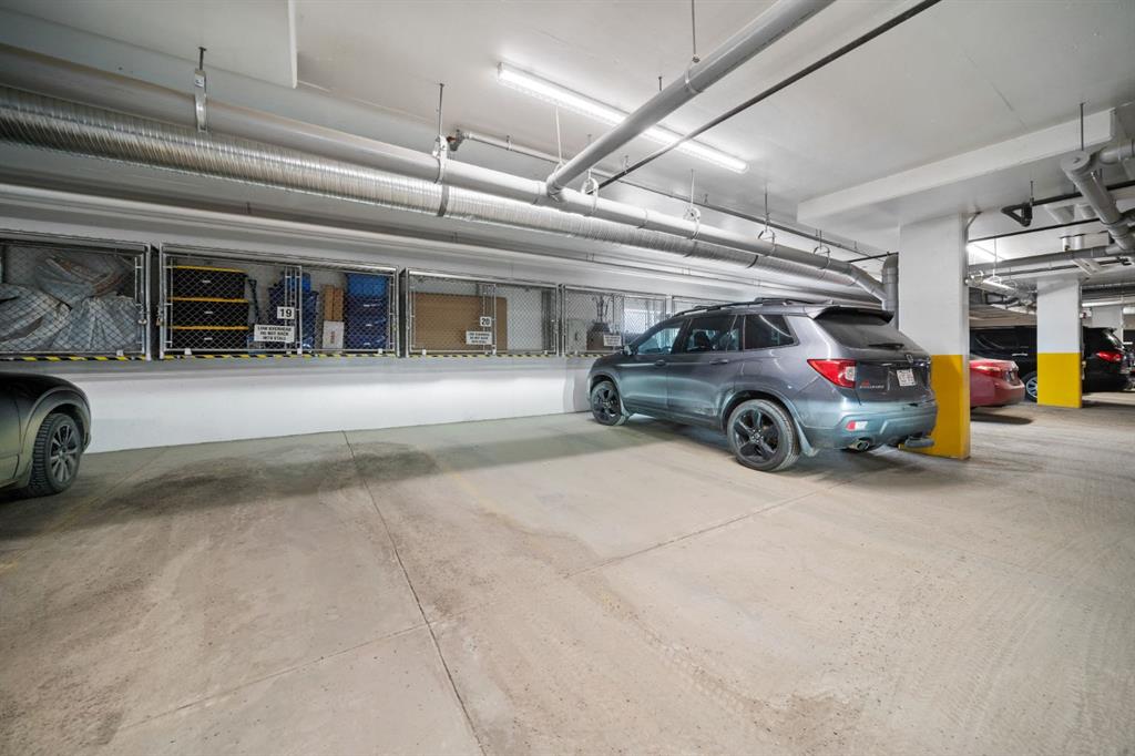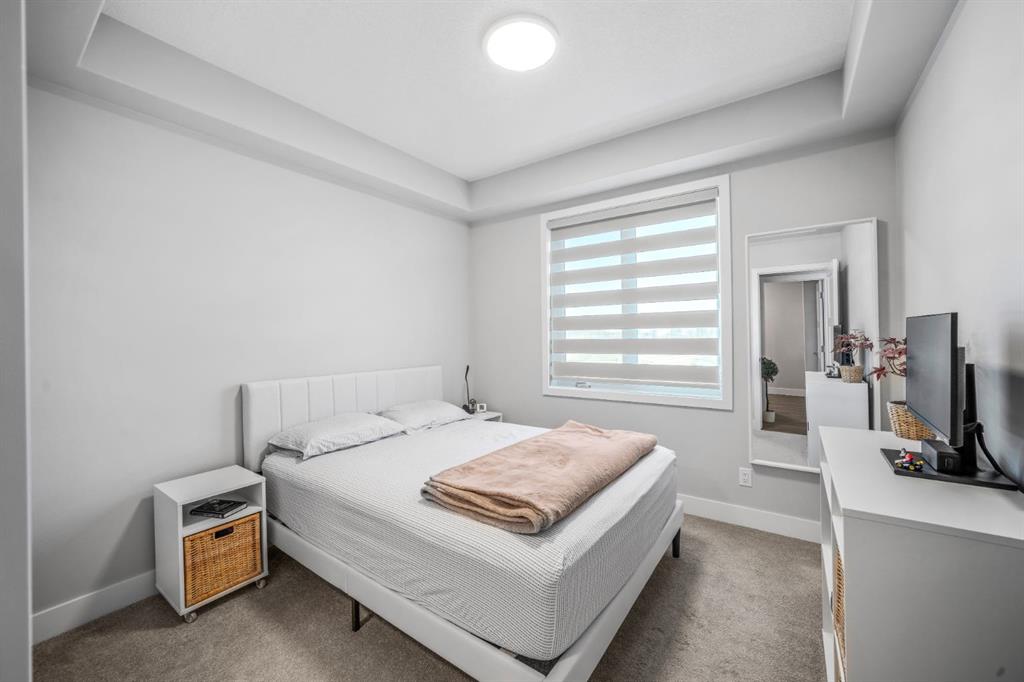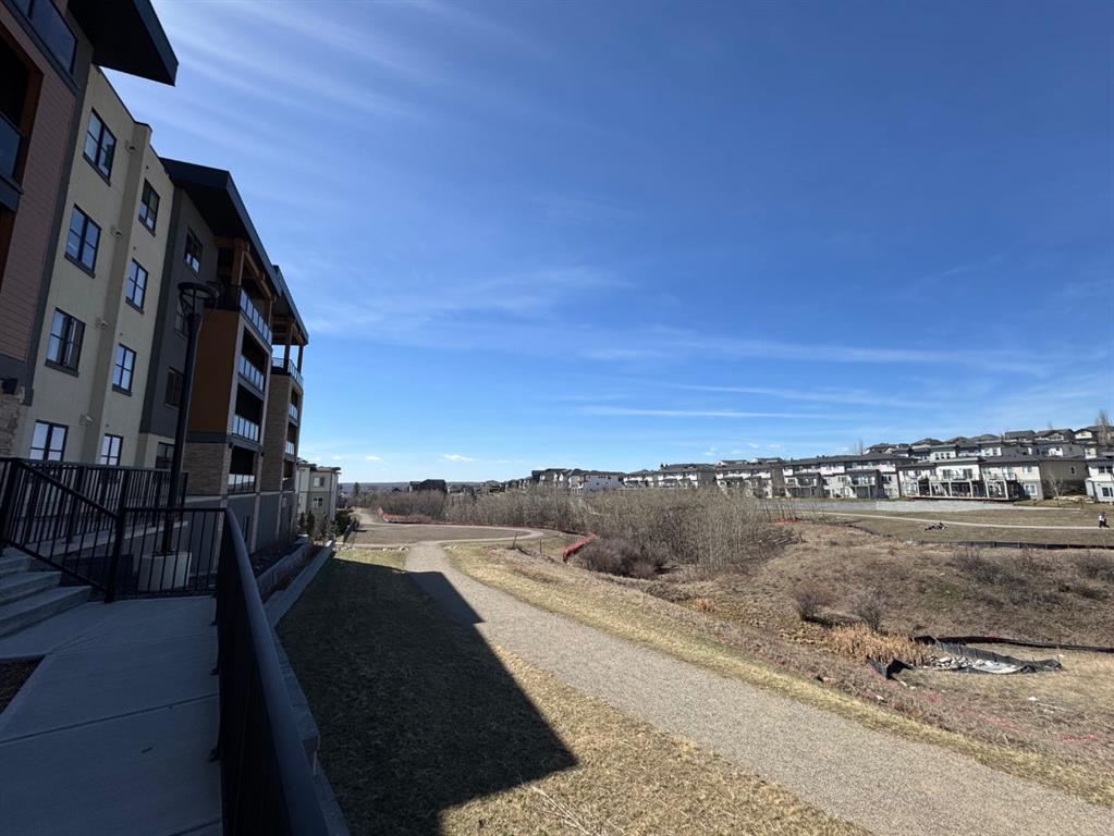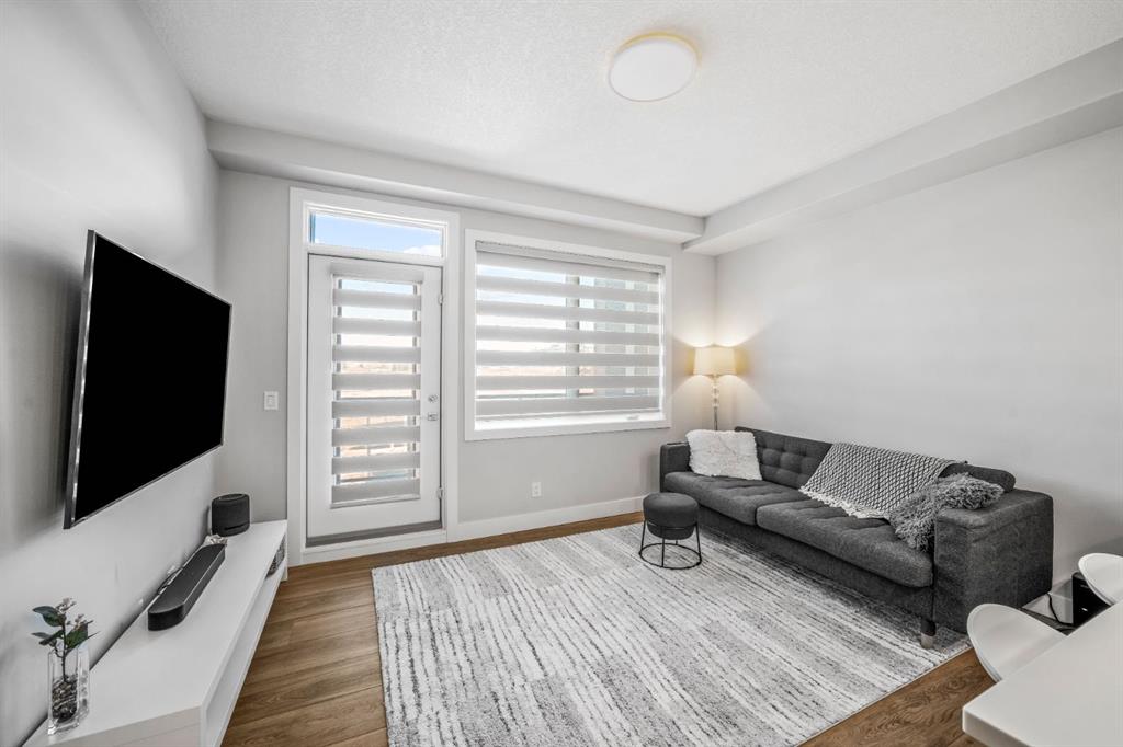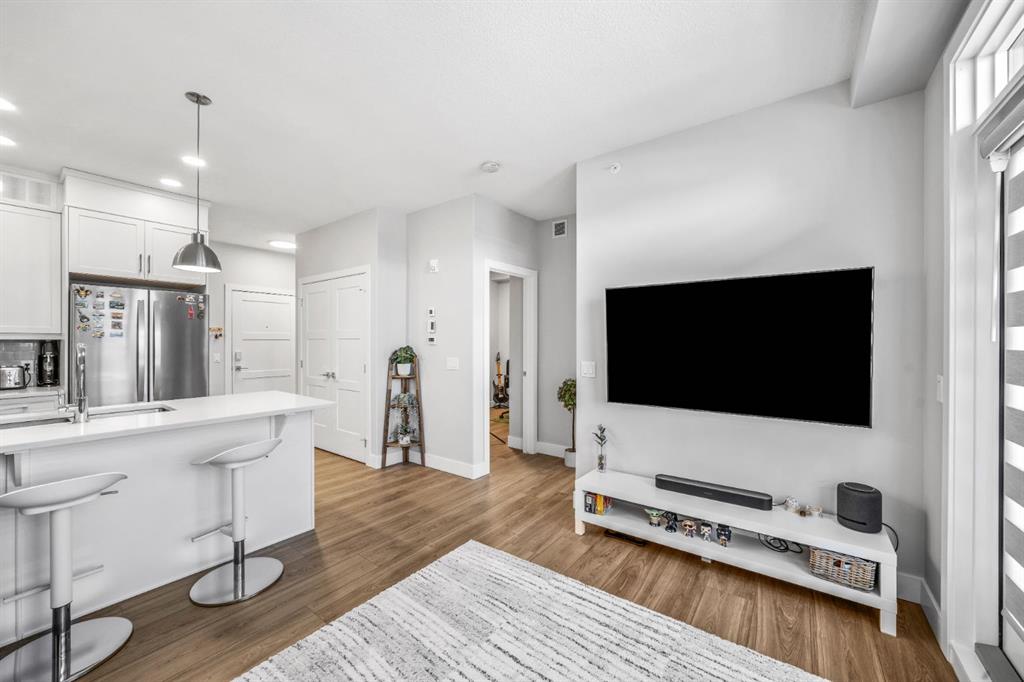 Welcome to this well maintained one bedroom plus den residence in the sought after 85th and Park building, completed in 2023 by Cove Properties. Set beside a protected ravine with walking paths bike trails, scenic pond, dog friendly, and beautiful Rocky Mountain views, this location offers a quiet setting just minutes to Aspen Landing mall, and a short drive to downtown Calgary. This efficient layout offers approximately 600 square feet with a bright open concept design. The kitchen features generous counter space, ample cabinetry, quartz countertops, and stainless steel appliances. The den works well as a home office or flex space. Additional highlights include air conditioning, a large in suite laundry/storage room, luxury vinyl plank flooring, and a spacious balcony. The unit is exceptionally quiet within the building. The titled underground parking stall includes a dedicated storage area directly in front of the stall, plus a second, larger storage locker in the storage room. The building also offers a separate bike storage room. Condo fees are a very reasonable $305 dollars per month, offering strong value for this location and building quality. A great opportunity to own in a well built development in one of Calgary’s most desirable west side communities.